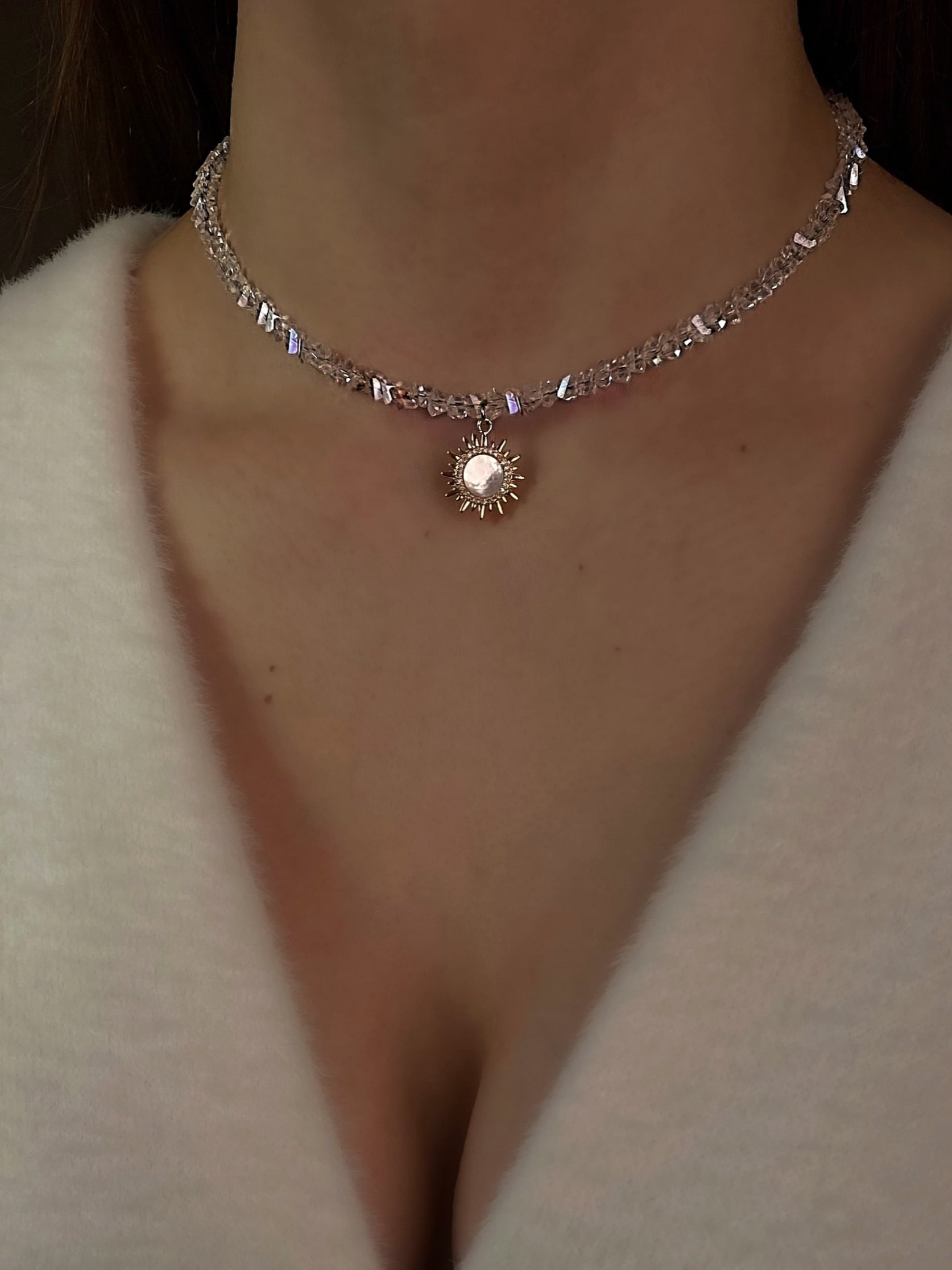 Чокер з прозорого кришталю з кулоном перламутрове сонце. Матеріал фурнітури нержавіюча ювелірна сталь. Кулон матеріалу латунь з покриттям позолоти 18 карат (у золотому кольорі). Стандартна довжина 36 см та 6 см подовжувач. Замір шиї моделі впритул 29 см.
