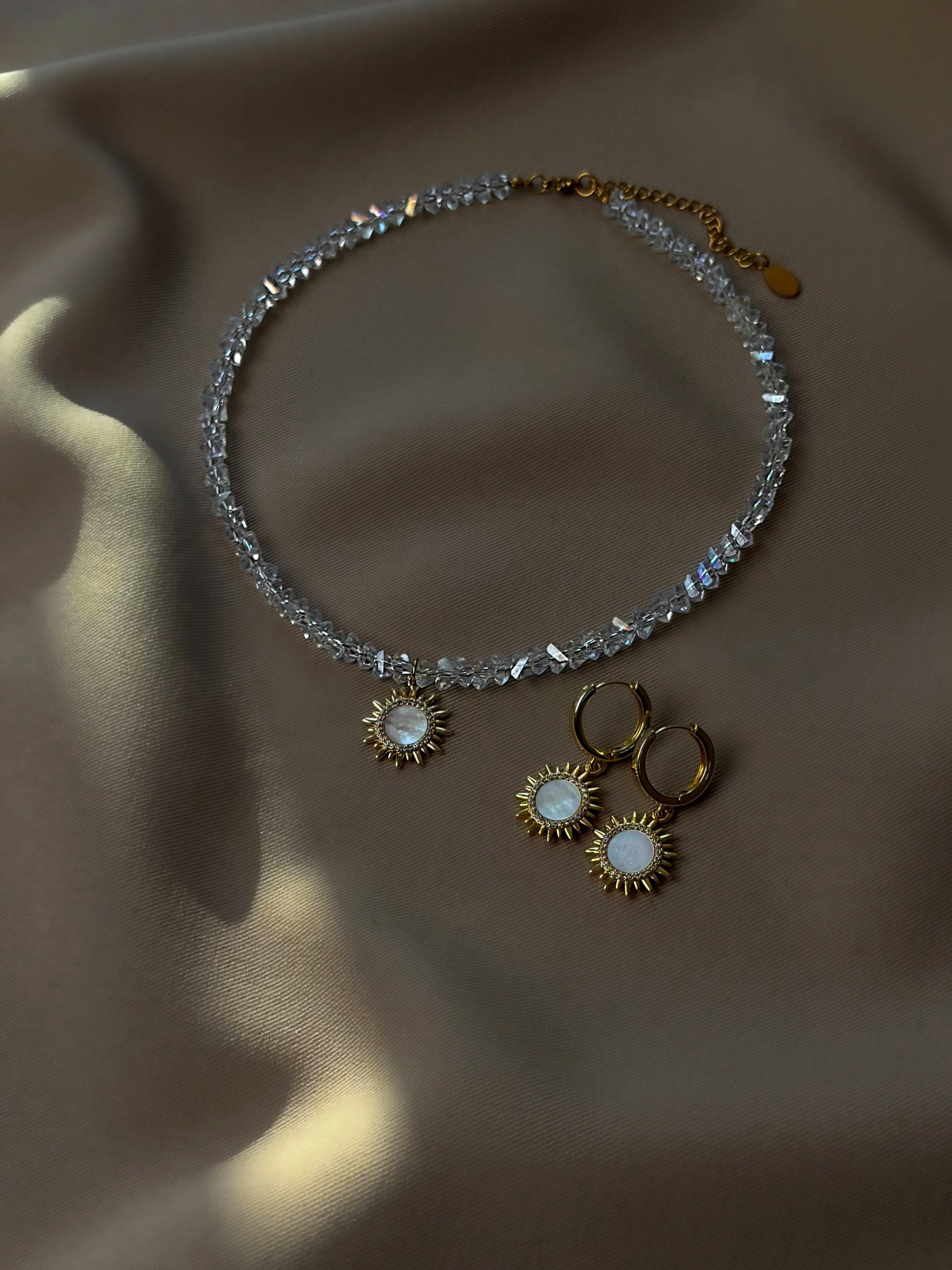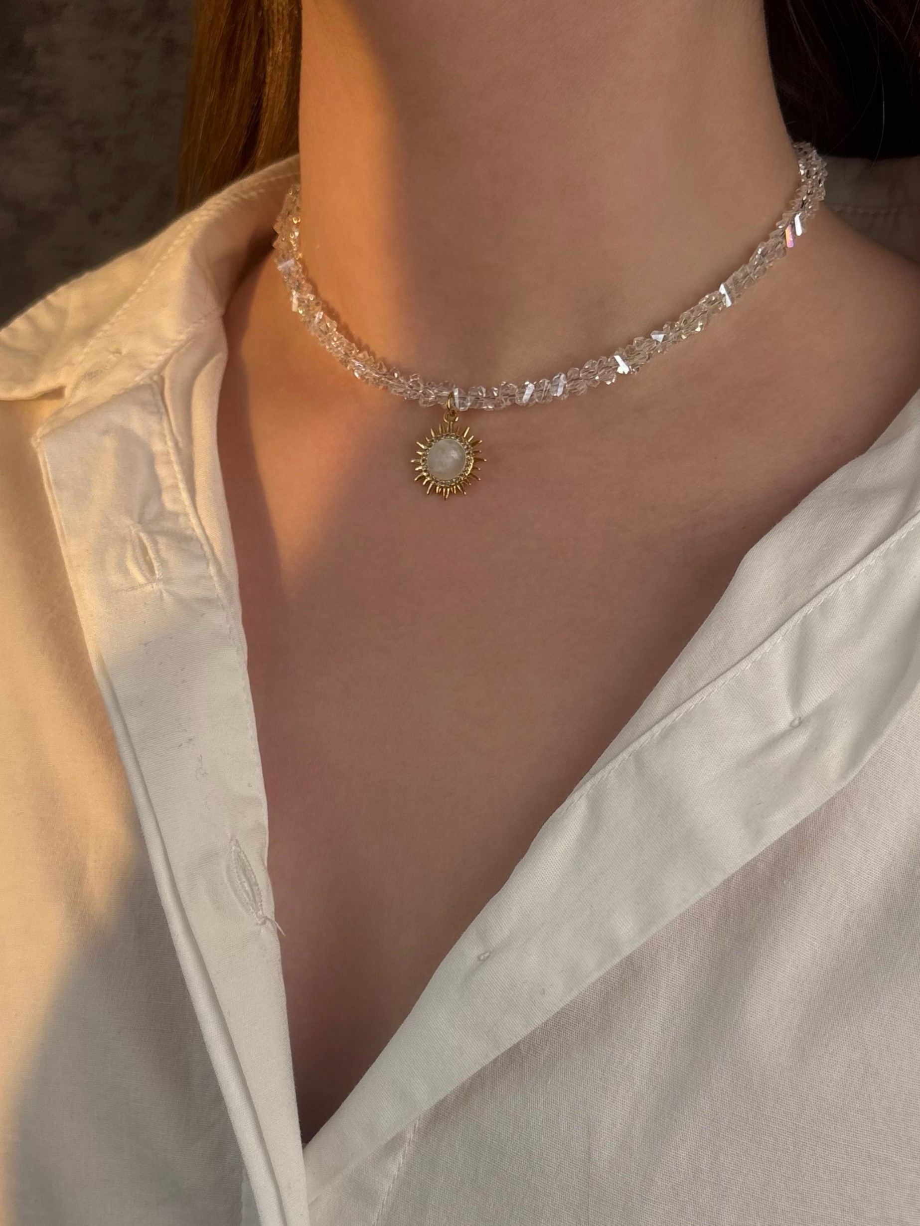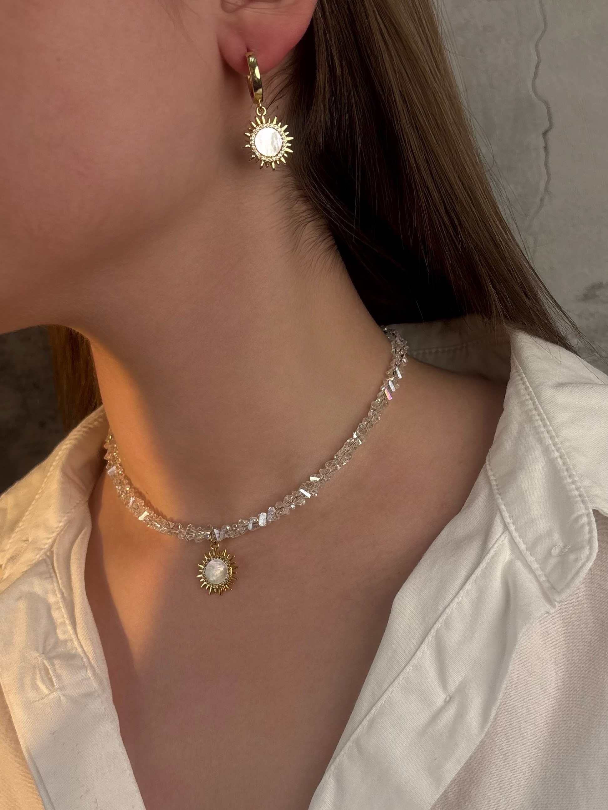 Чокер з прозорого кришталю з кулоном перламутрове сонце. Матеріал фурнітури нержавіюча ювелірна сталь. Кулон матеріалу латунь з покриттям позолоти 18 карат (у золотому кольорі). Стандартна довжина 36 см та 6 см подовжувач. Замір шиї моделі впритул 29 см.