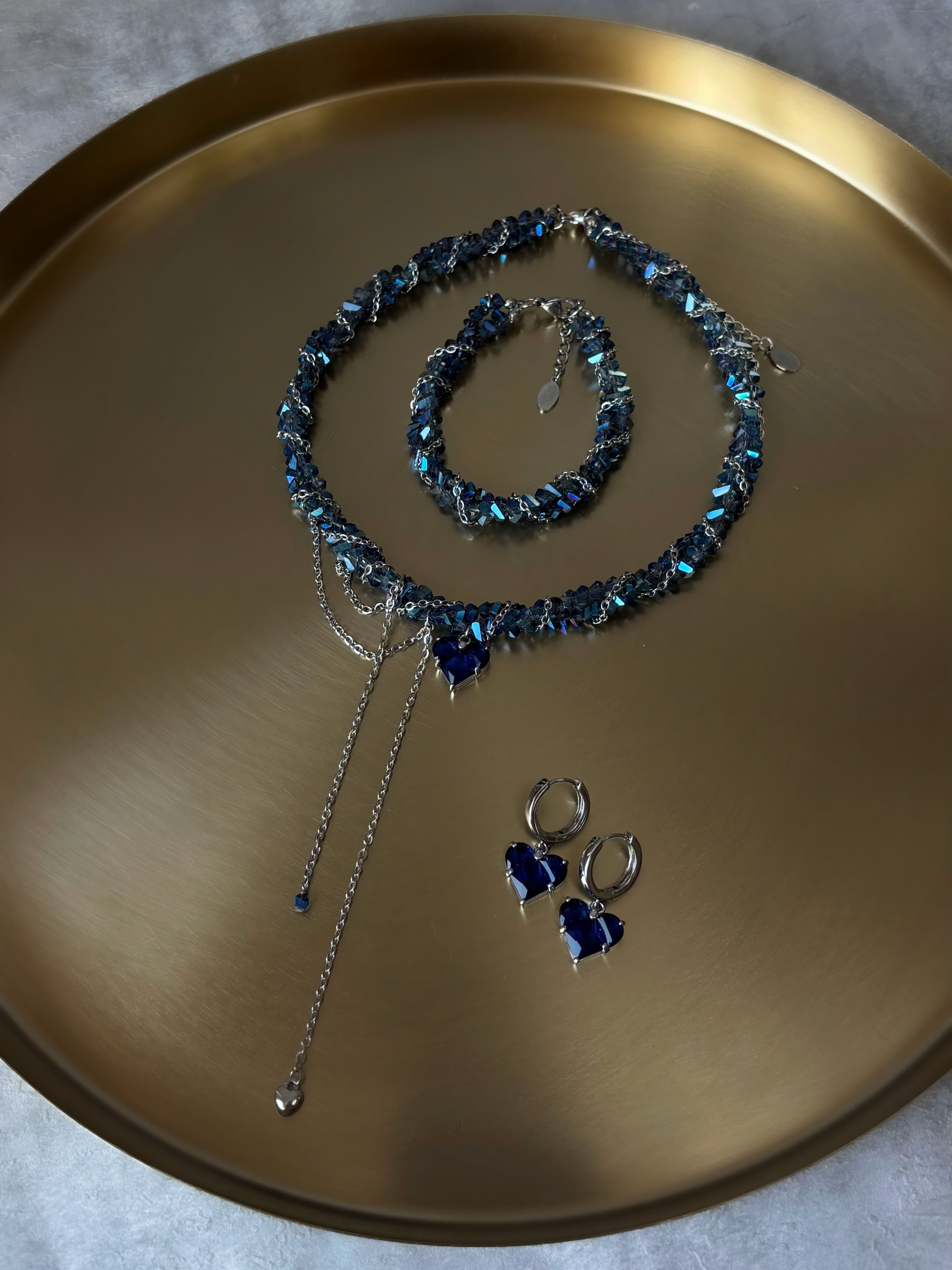 - Кольє з синього кришталю та ланцюжка з кулоном серце