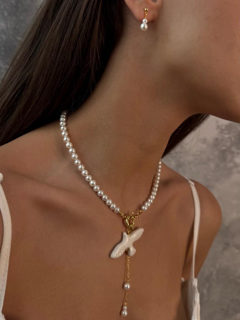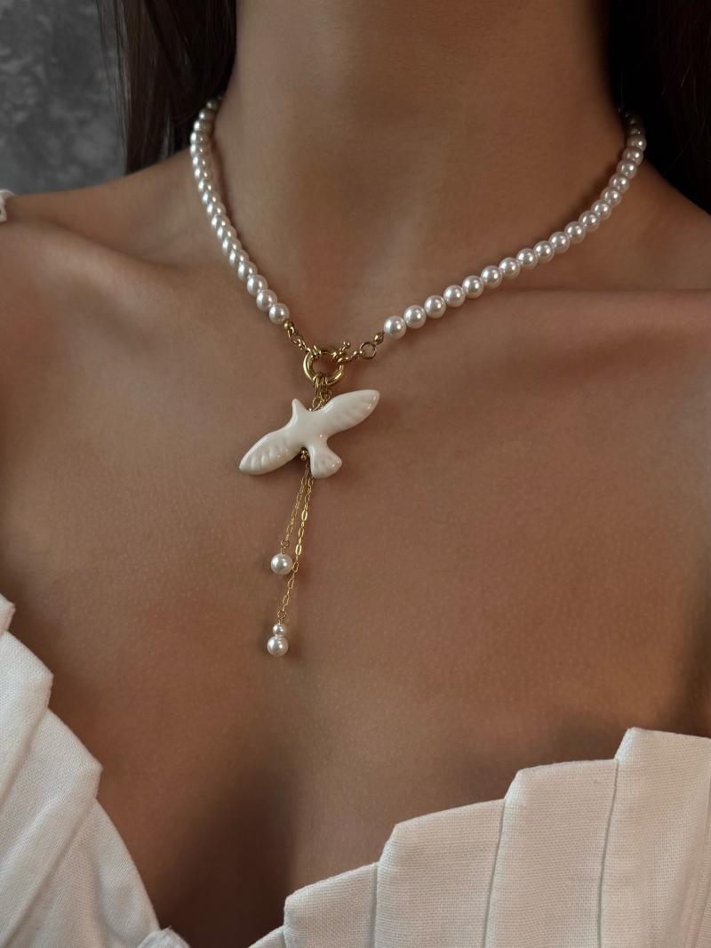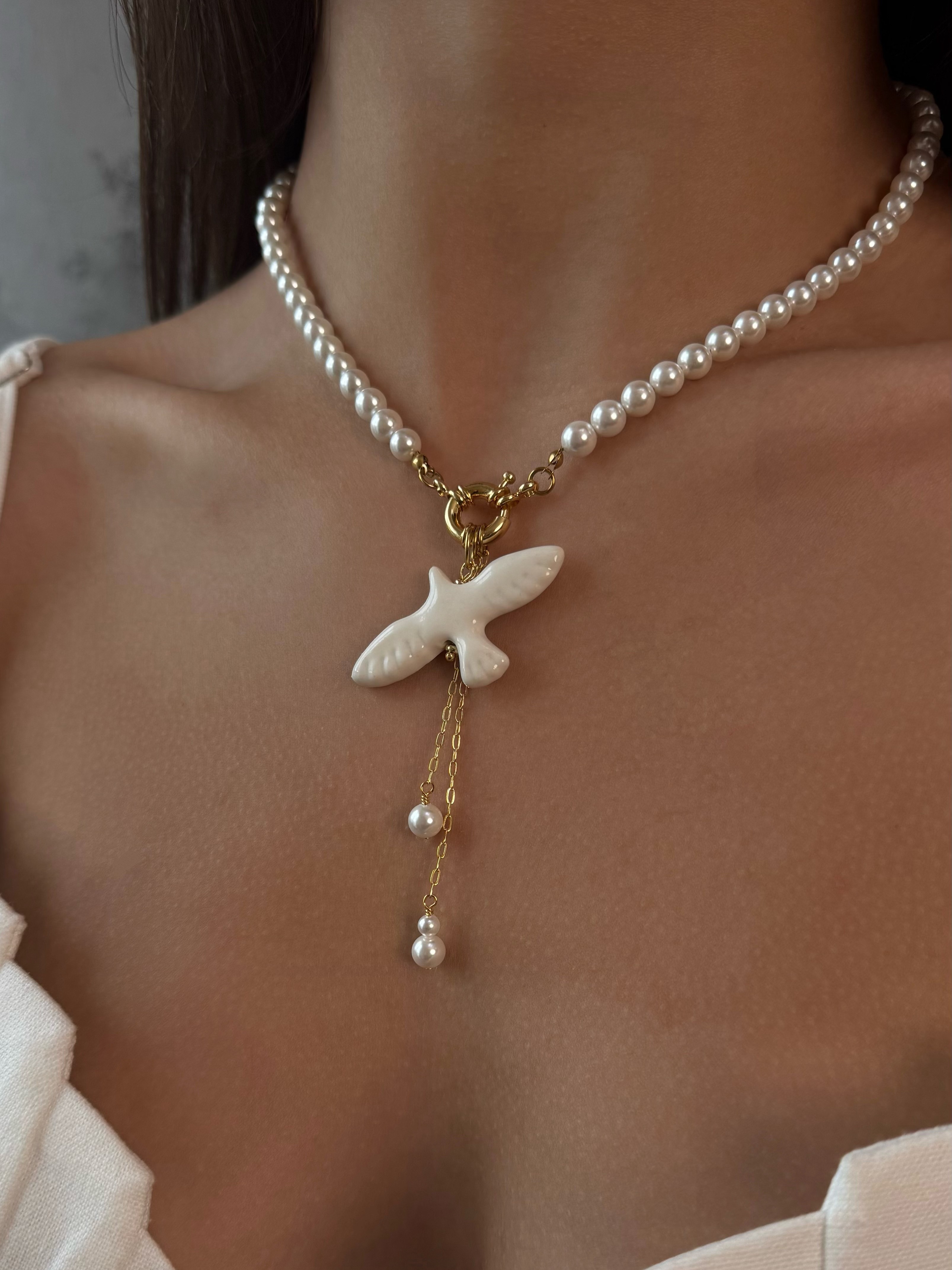 Кольє виготовлене з надзвичайно блискучих перлин Майорка з акцентною застібкою та кулоном горлиця. Матеріал латунь з покриттям позолоти 18 карат (у золотому кольорі). Стандартна довжина 43 см.