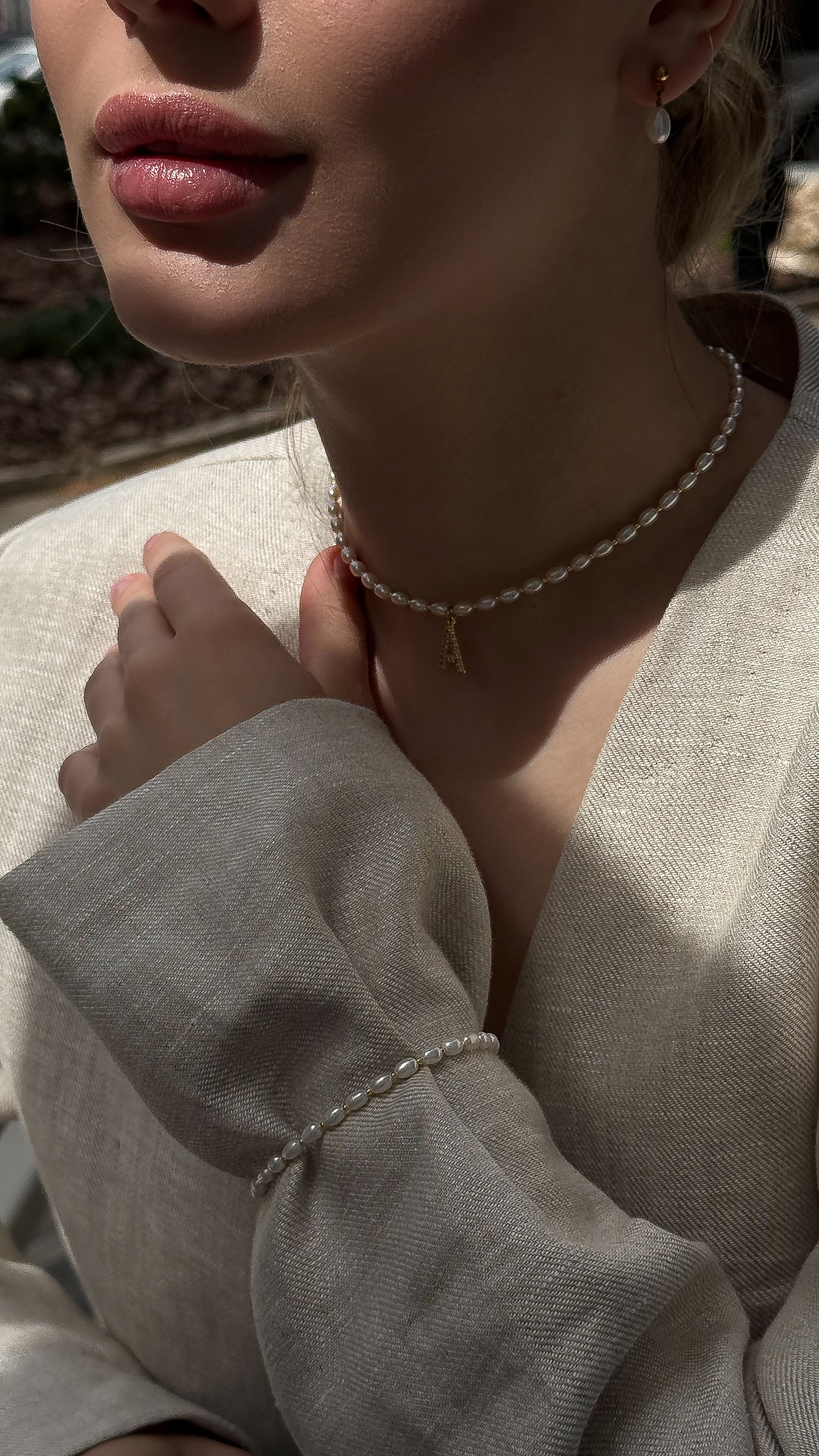 Браслет виготовлений з натуральних перлин з додаванням японського бісеру. Матеріал фурнітури латунь з покриттям позолоти 18 карат (у золотому кольорі). Стандартна довжина чокера 36 см та 6 см подовжувач.