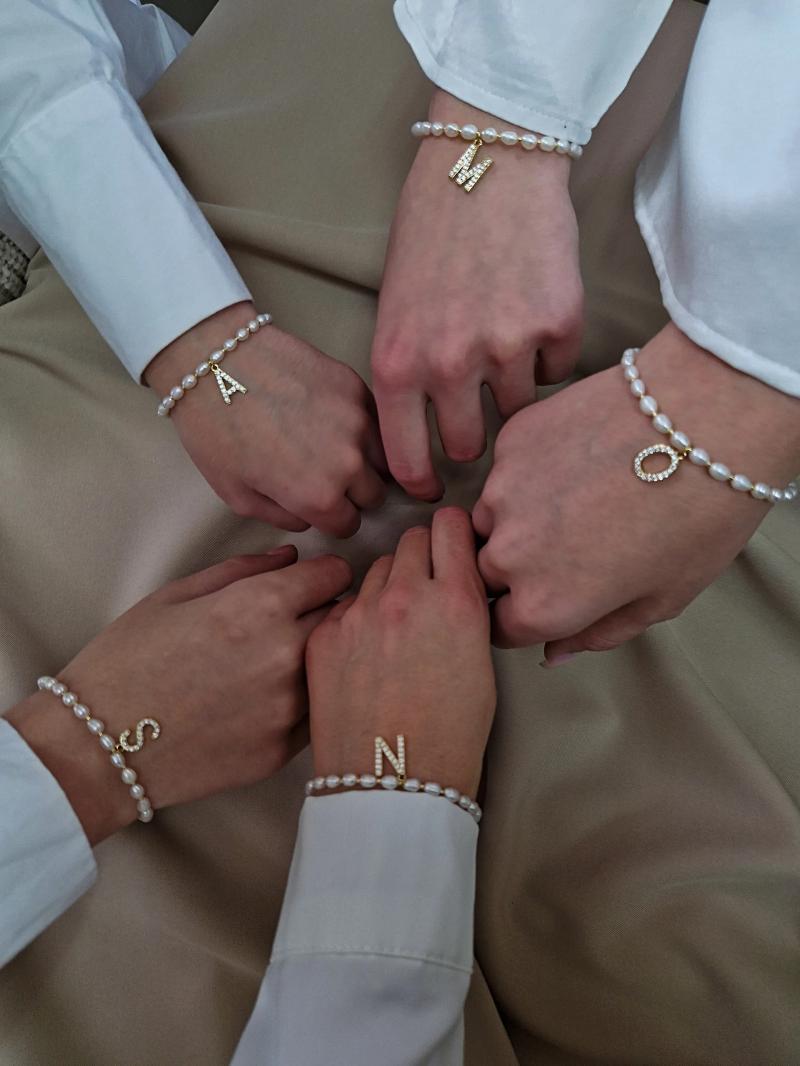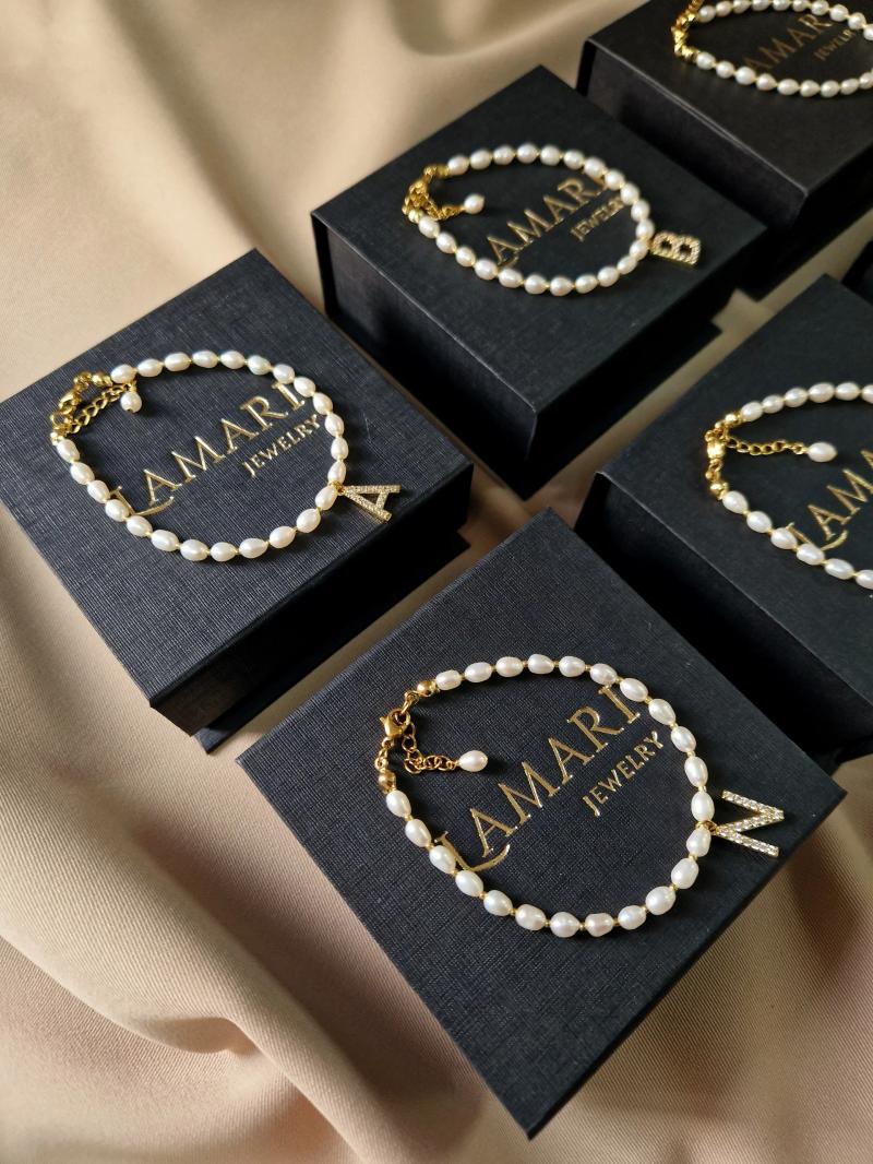Браслет виготовлений з натуральних перлин з додаванням японського бісеру. Літера вкрита фіанітами. Матеріал фурнітури ювелірна нержавіюча сталь та латунь з покриттям позолоти 18 карат (у золотому кольорі).