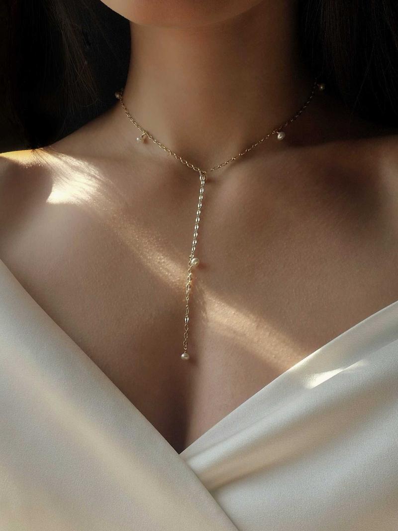 Ніжний ланцюжок ажурного плетіння з вкрапленням натуральних перлин. Матеріал латунь з покриттям позолоти 18 карат (у золотому кольорі). Стандартна довжина 36 см. Замір шиї моделі - 32 см впритул.