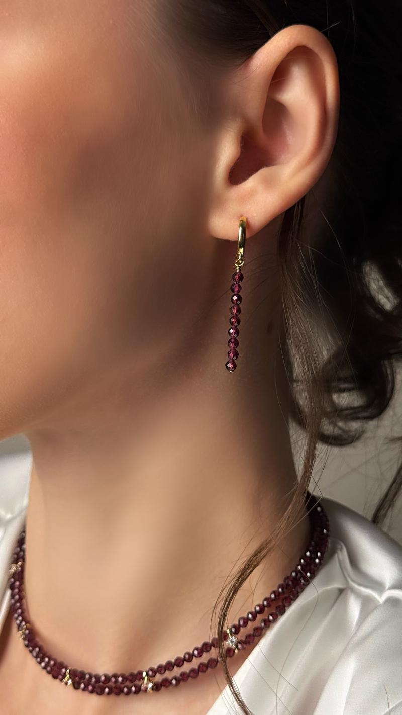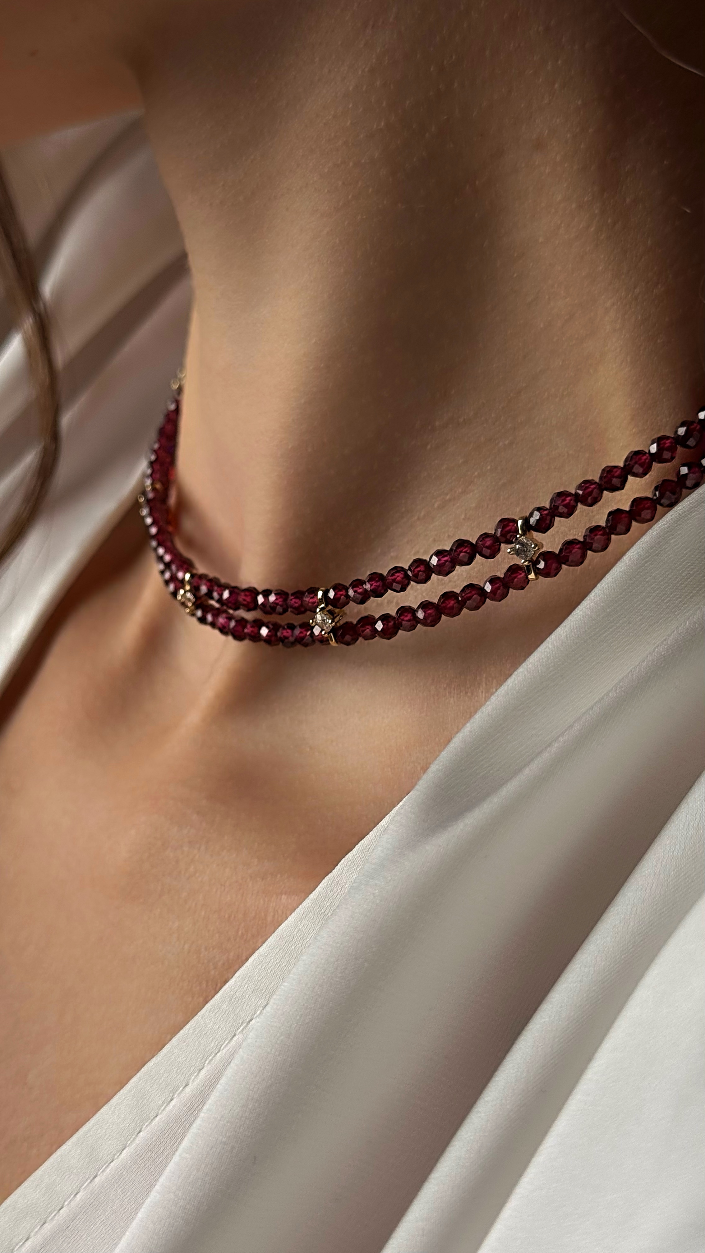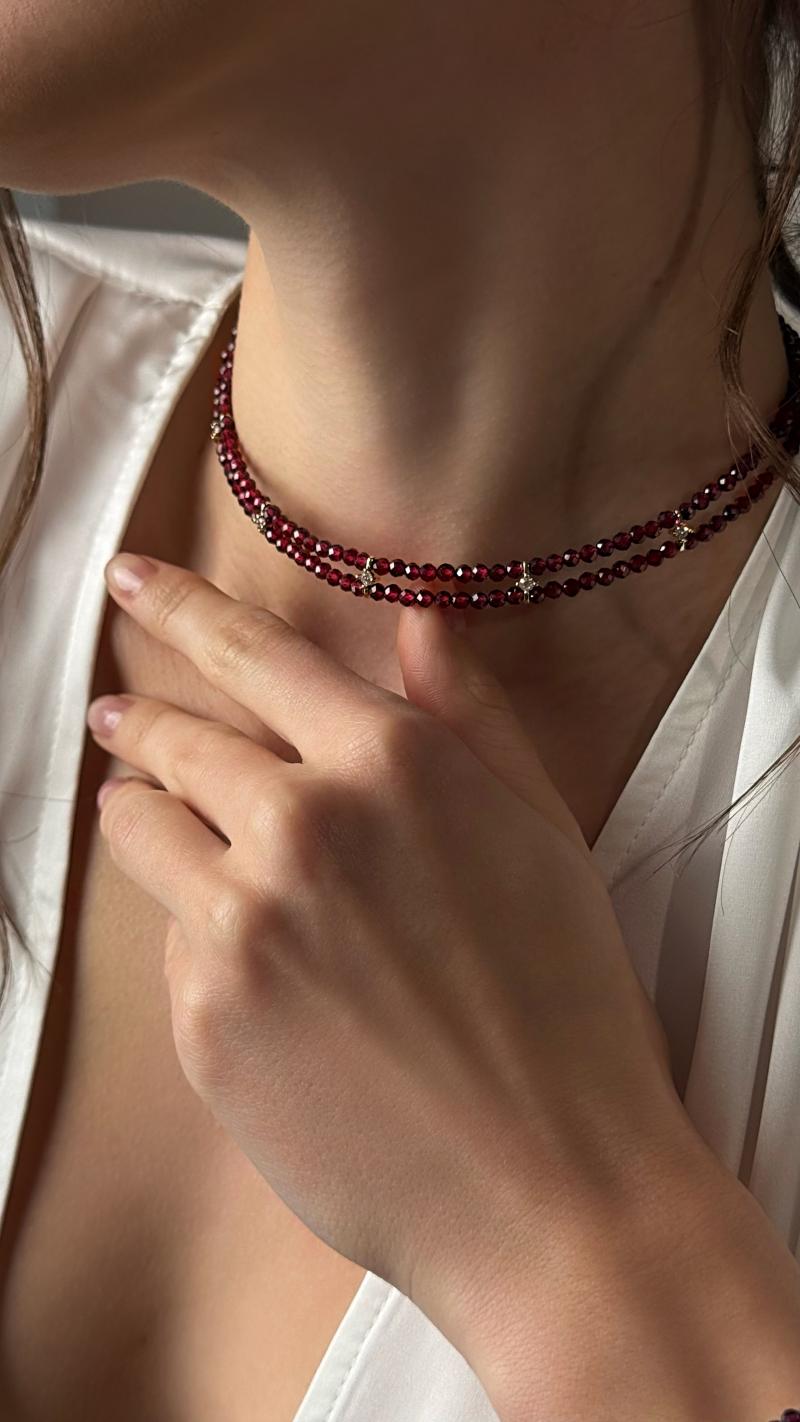 Подвійне кольє з натурального гранату з роздільниками з фіанітами. Фурнітура преміум якості: поєднання ювелірної сталі та латунь з покриттям позолоти 18 карат (у золотому кольорі). Стандарнта довжина 36 см + 6 см подовжувач. Замір шиї моделі впритул 29 см.