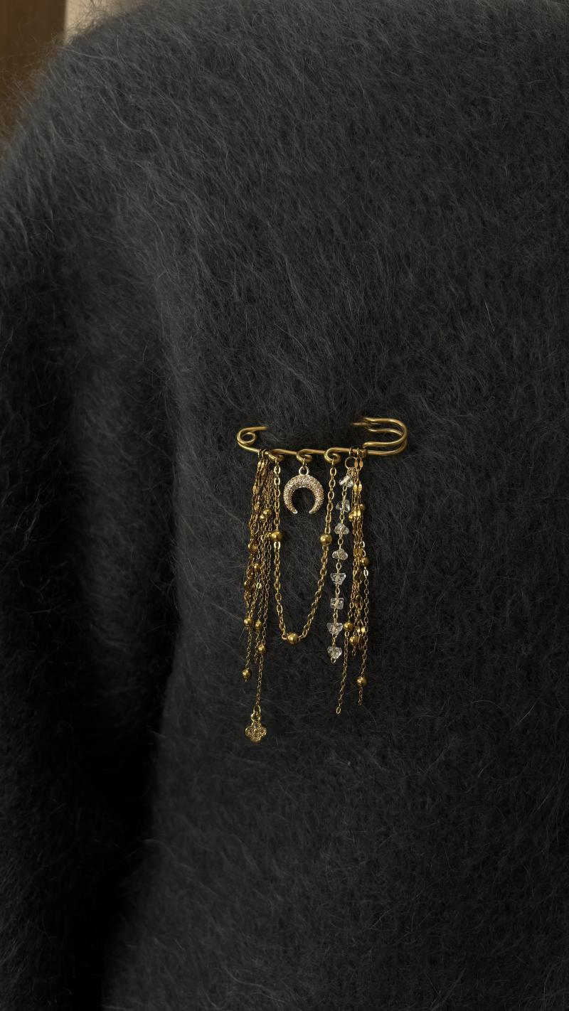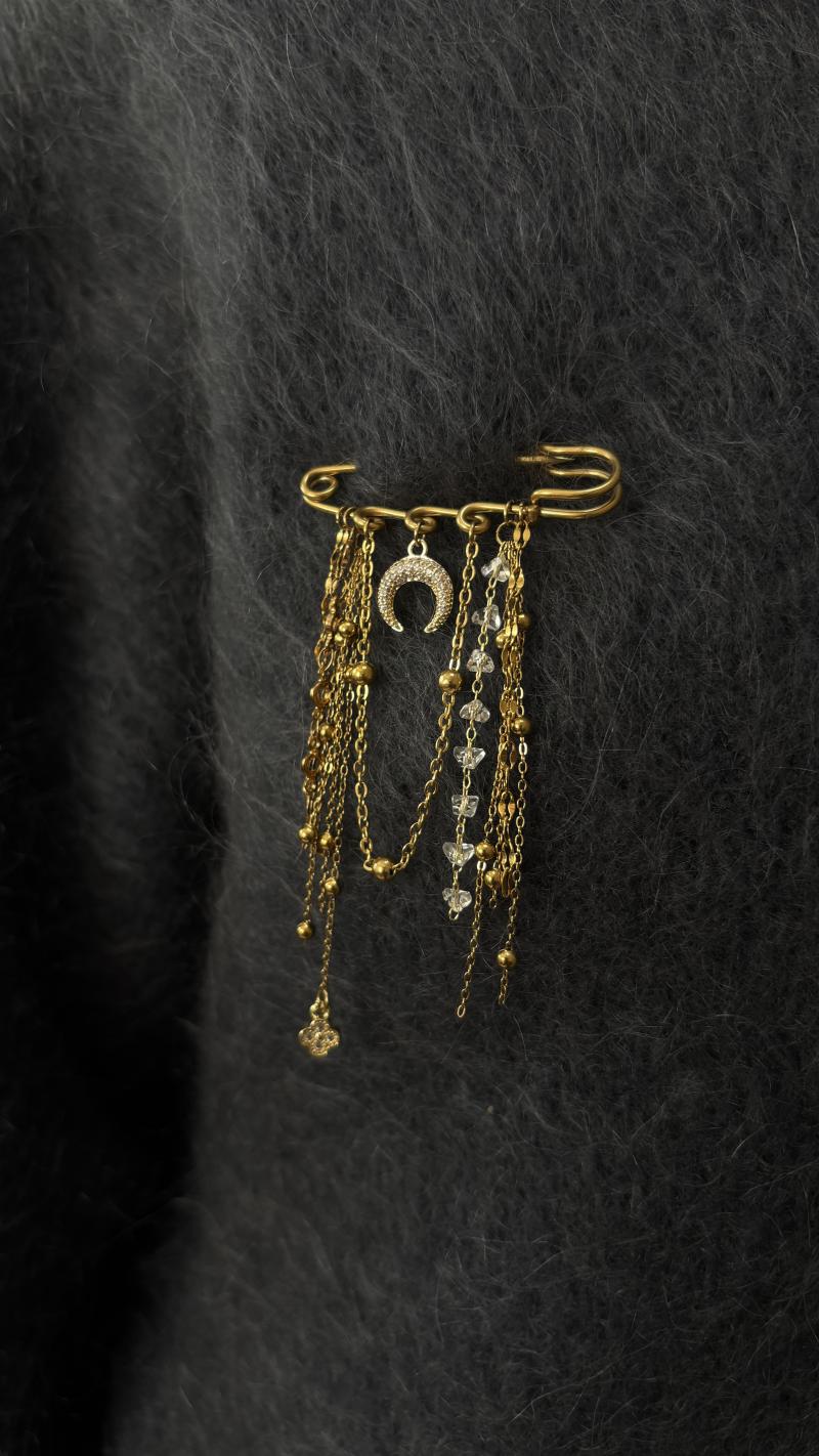 Стильна булавка з ланцюжками і лунницею у фіанітах. Матеріал ювелірна сталь з позолотою (у золотому кольорі).