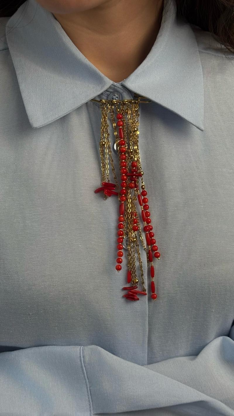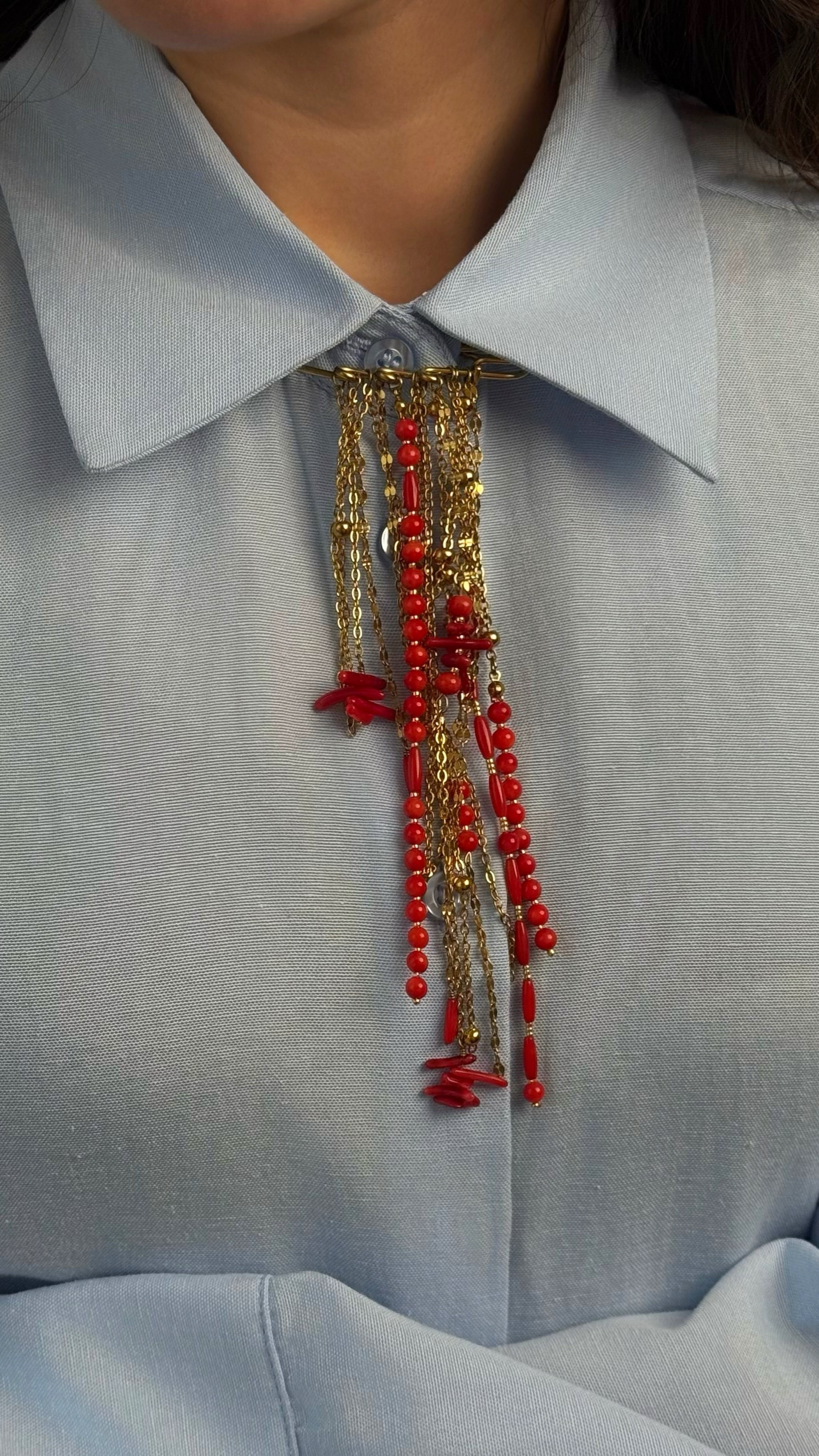 Стильна булавка з ланцюжками та натуральним коралом. Матеріал ювелірна сталь з позолотою (у золотому кольорі).