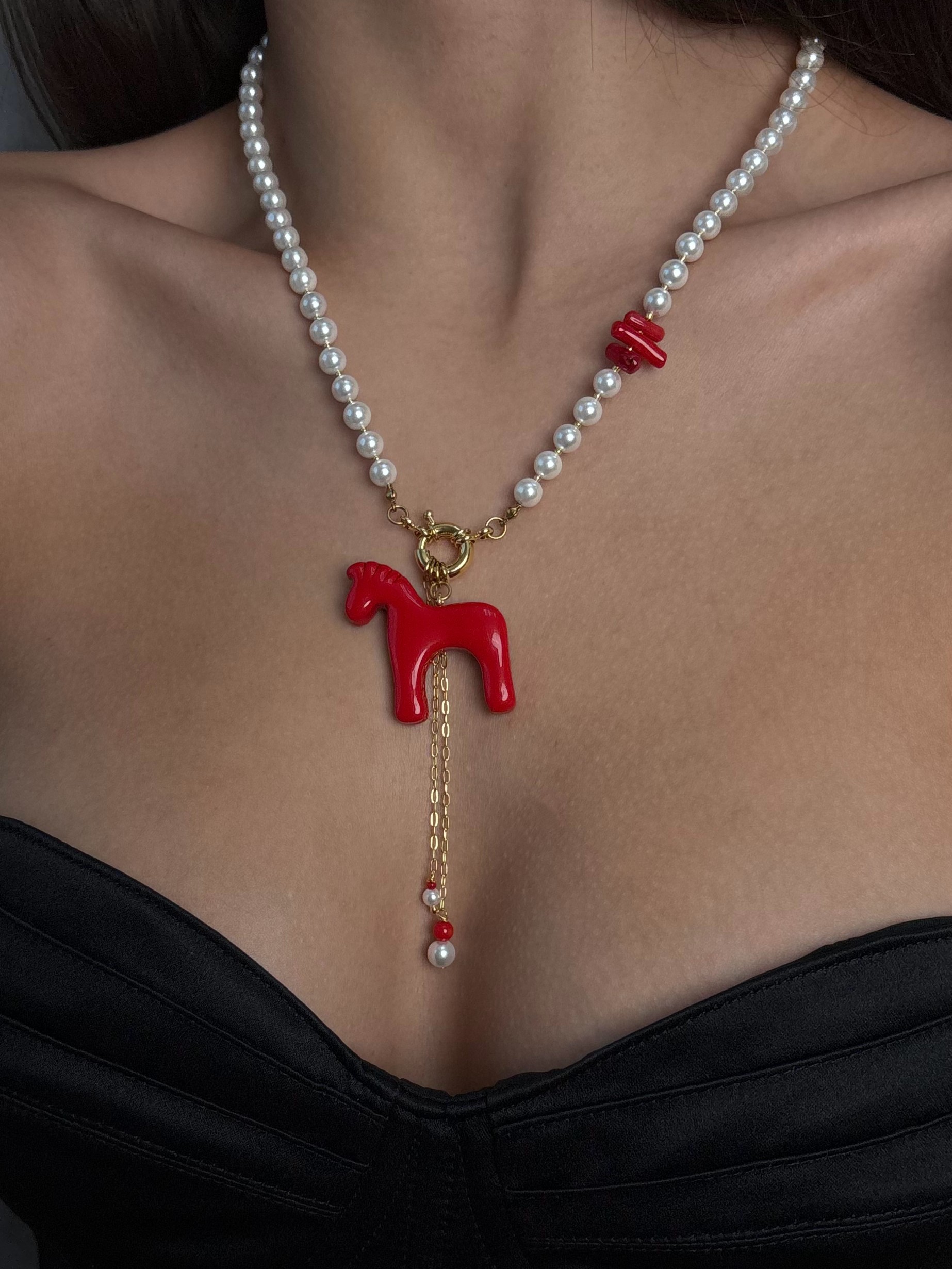 Кольє з високоякісних перлин Майорка, з додаванням яскравого кулону. Матеріал фурнітури: ювелірна сталь та латунь з покриттям позолоти (у золотому кольорі). Стандартна довжина 50 см.