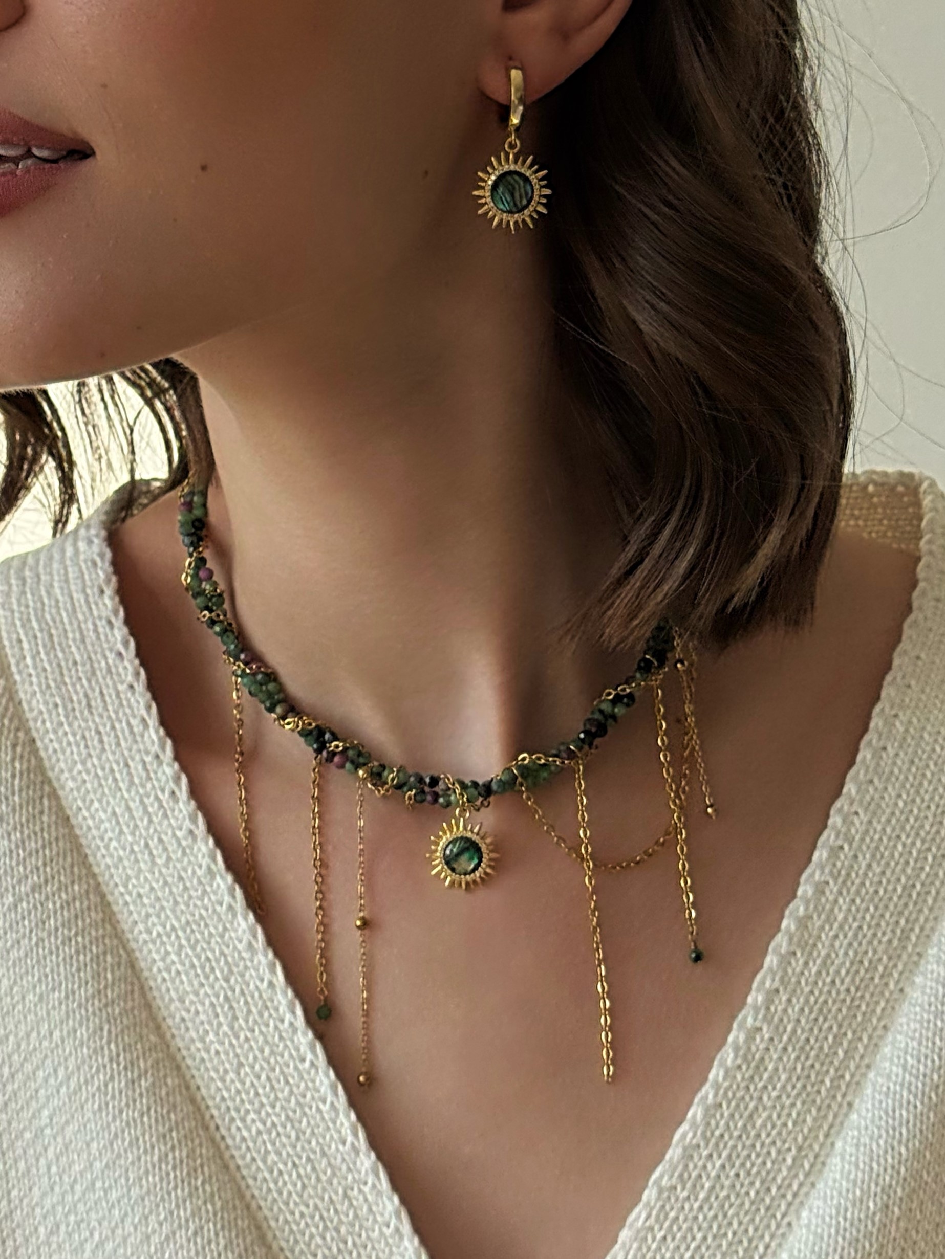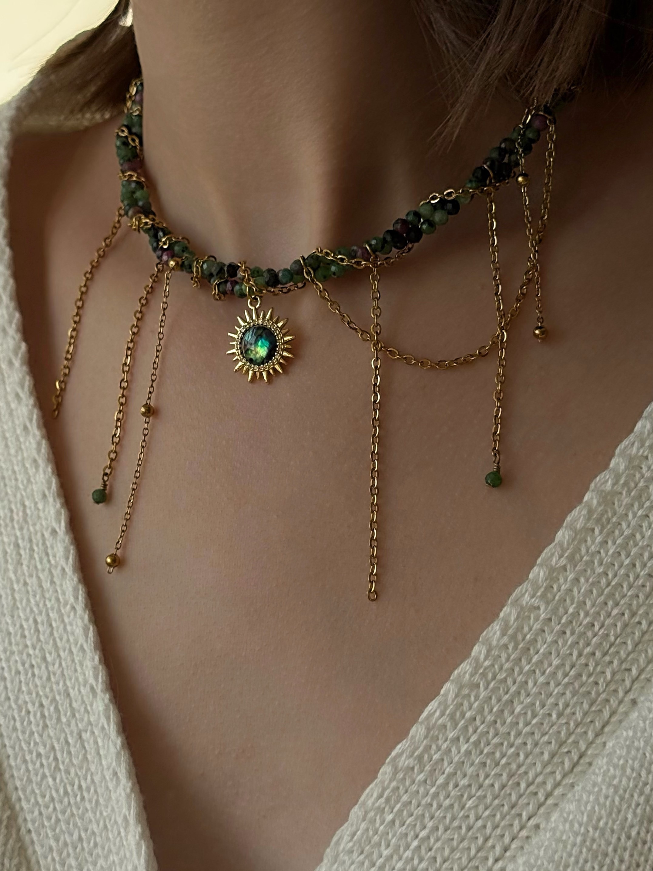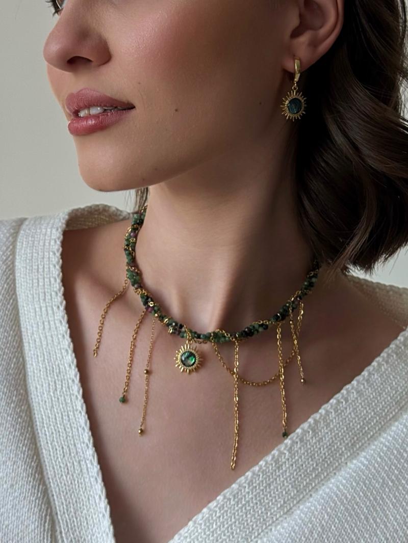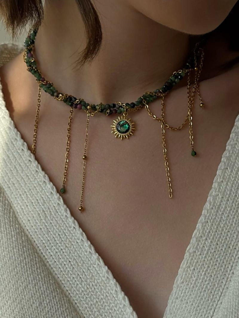 Комбіноване кольє з цоізиту та ланцюжків. Фурнітура преміум якості: поєднання ювелірної сталі та латунь з покриттям позолоти 18 карат (у золотому кольорі). Стандарнта довжина 37 см + 6 см подовжувач. Замір шиї моделі впритул 29 см.