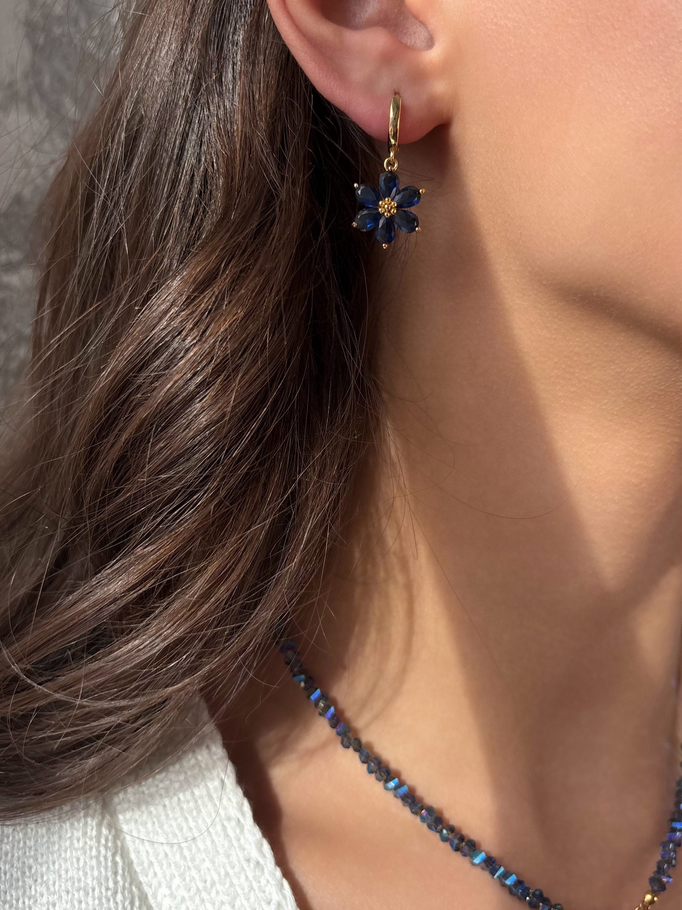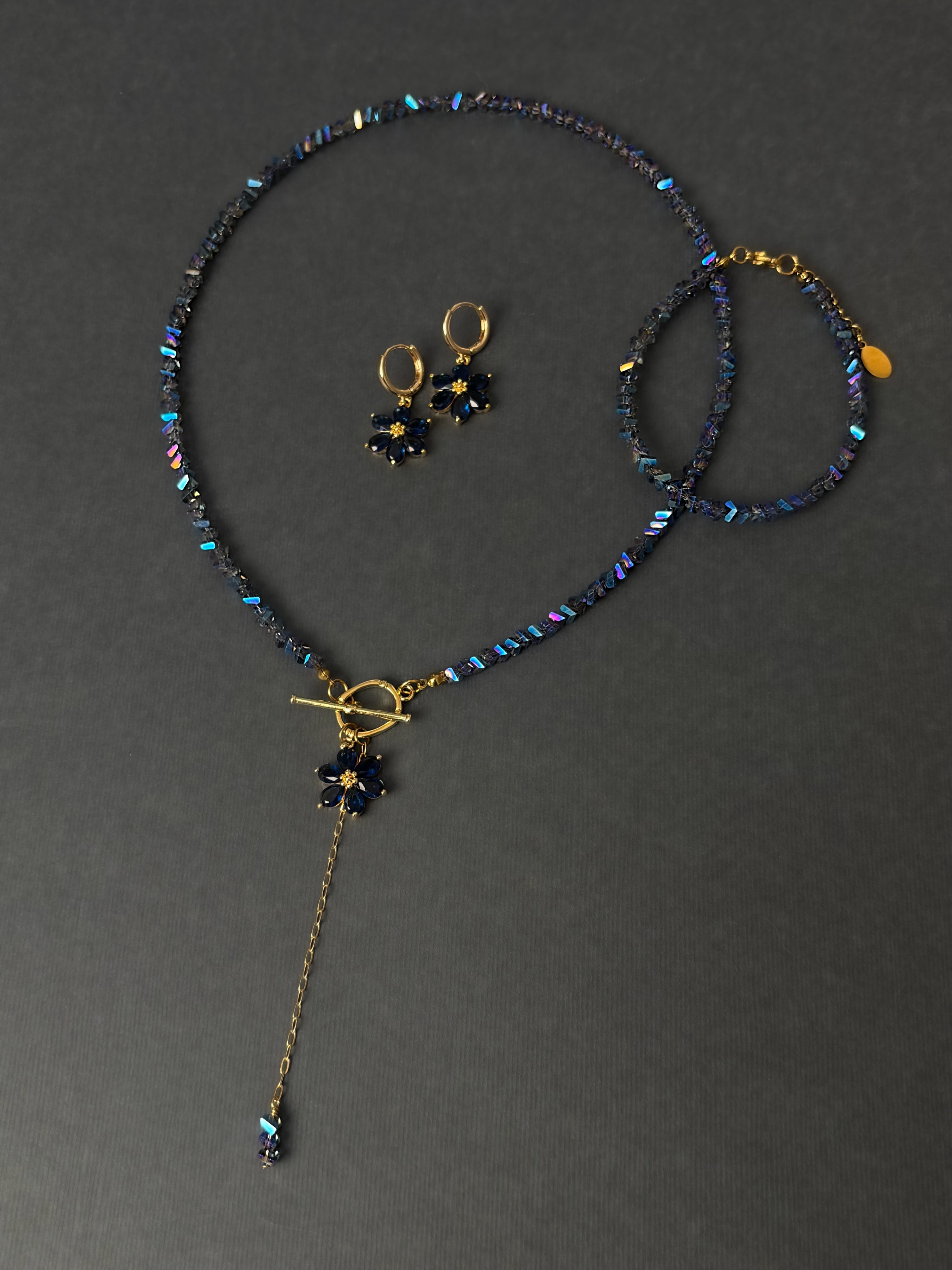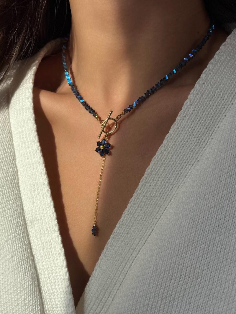 Кольє з відбірного кришталю з квіткою. Матеріал фурнітури: латунь з покриттям позолоти (у золотому кольорі). Стандартна довжина 43 см. Замір шиї моделі впритул 29 см.