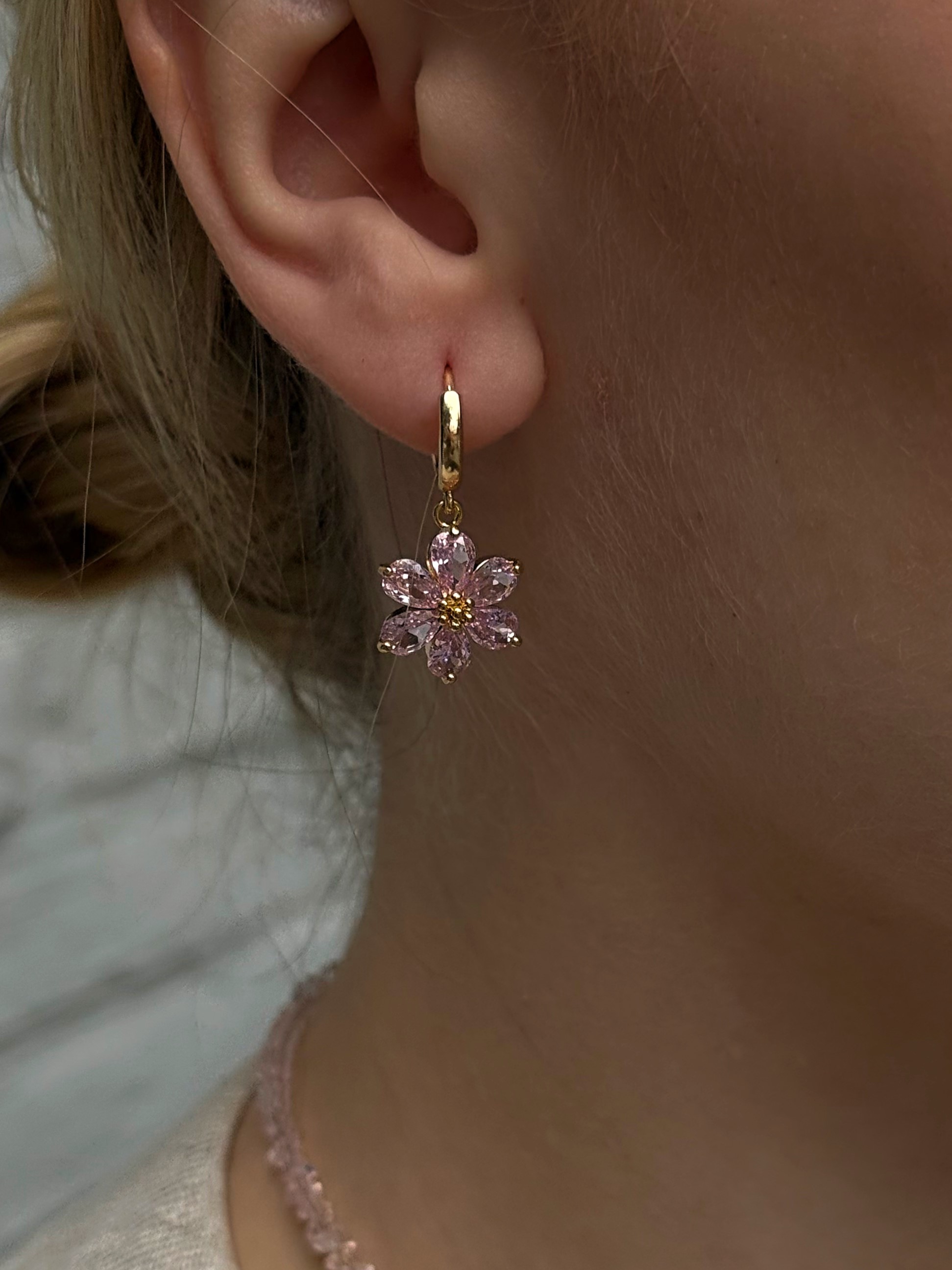 Сережки з рожевими квітами. Основа зручна та надійна. Матеріал: латунь з покриттям позолоти 18 карат. Не важкі, гіпоалергенні.