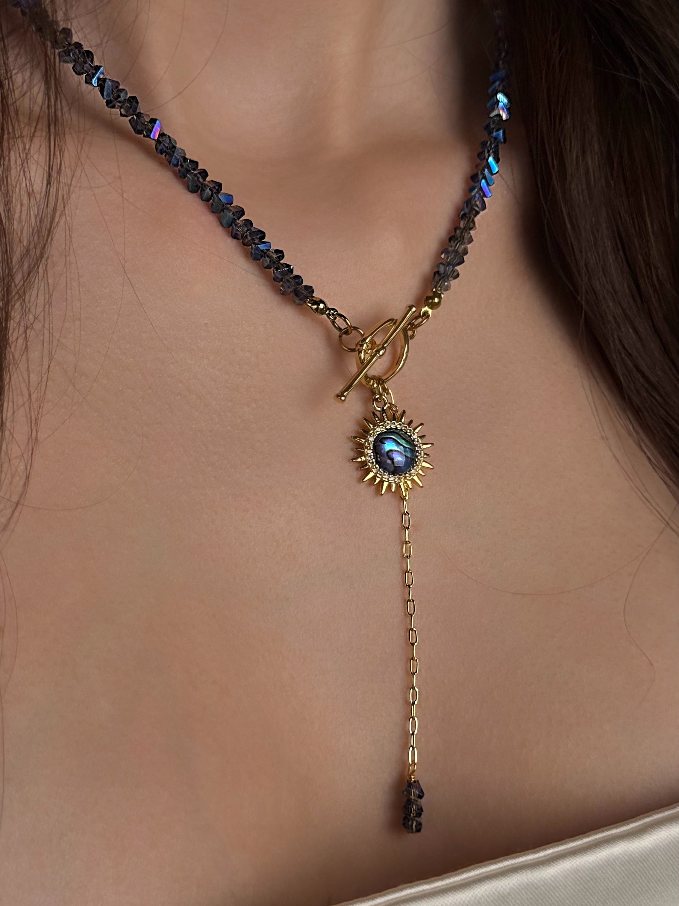 Кольє з відбірного кришталю з перламутровим сонцем. Матеріал фурнітури: латунь з покриттям позолоти (у золотому кольорі). Стандартна довжина 43 см. Замір шиї моделі впритул 29 см.