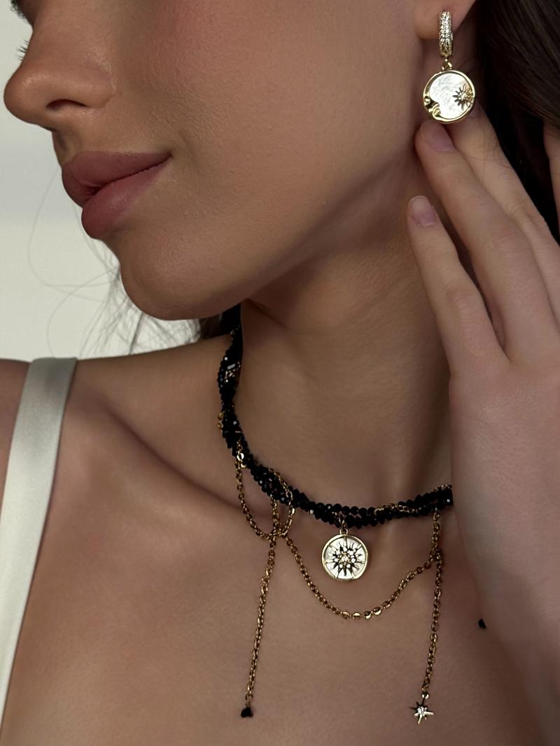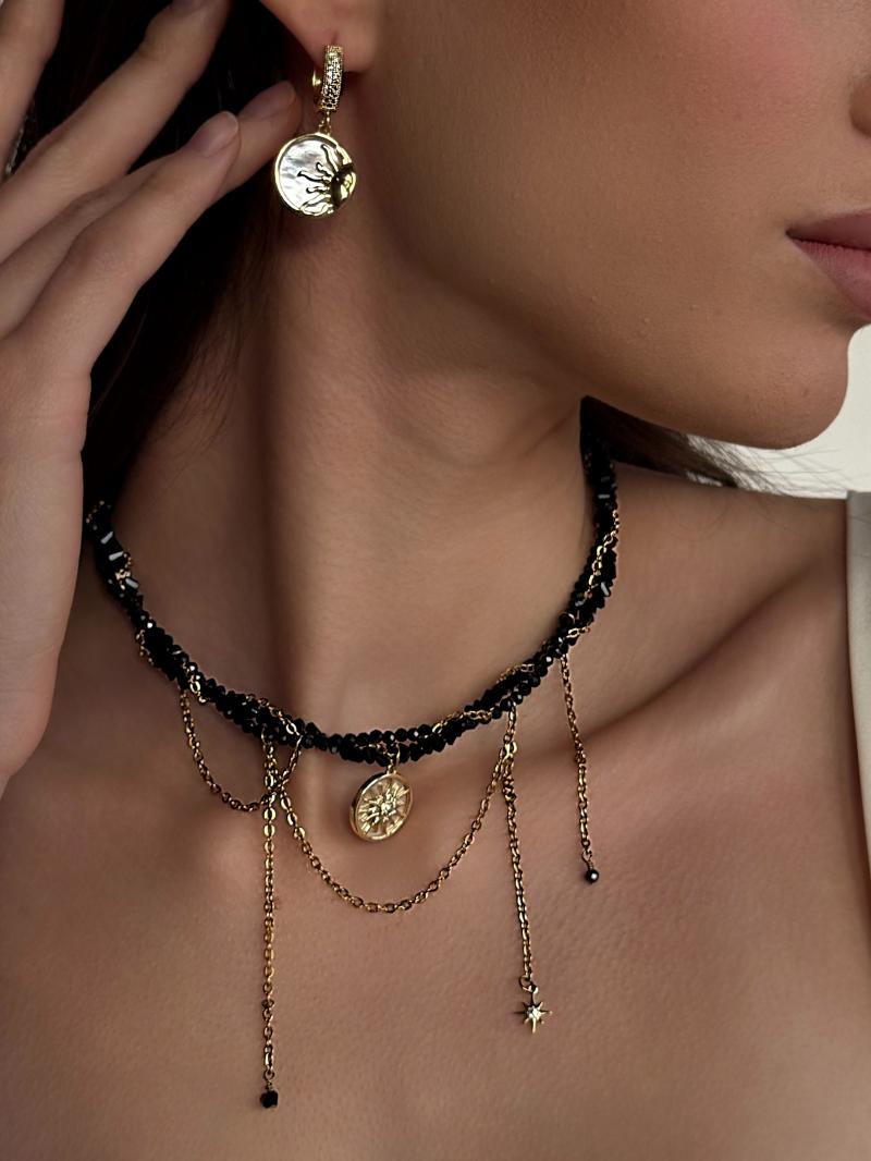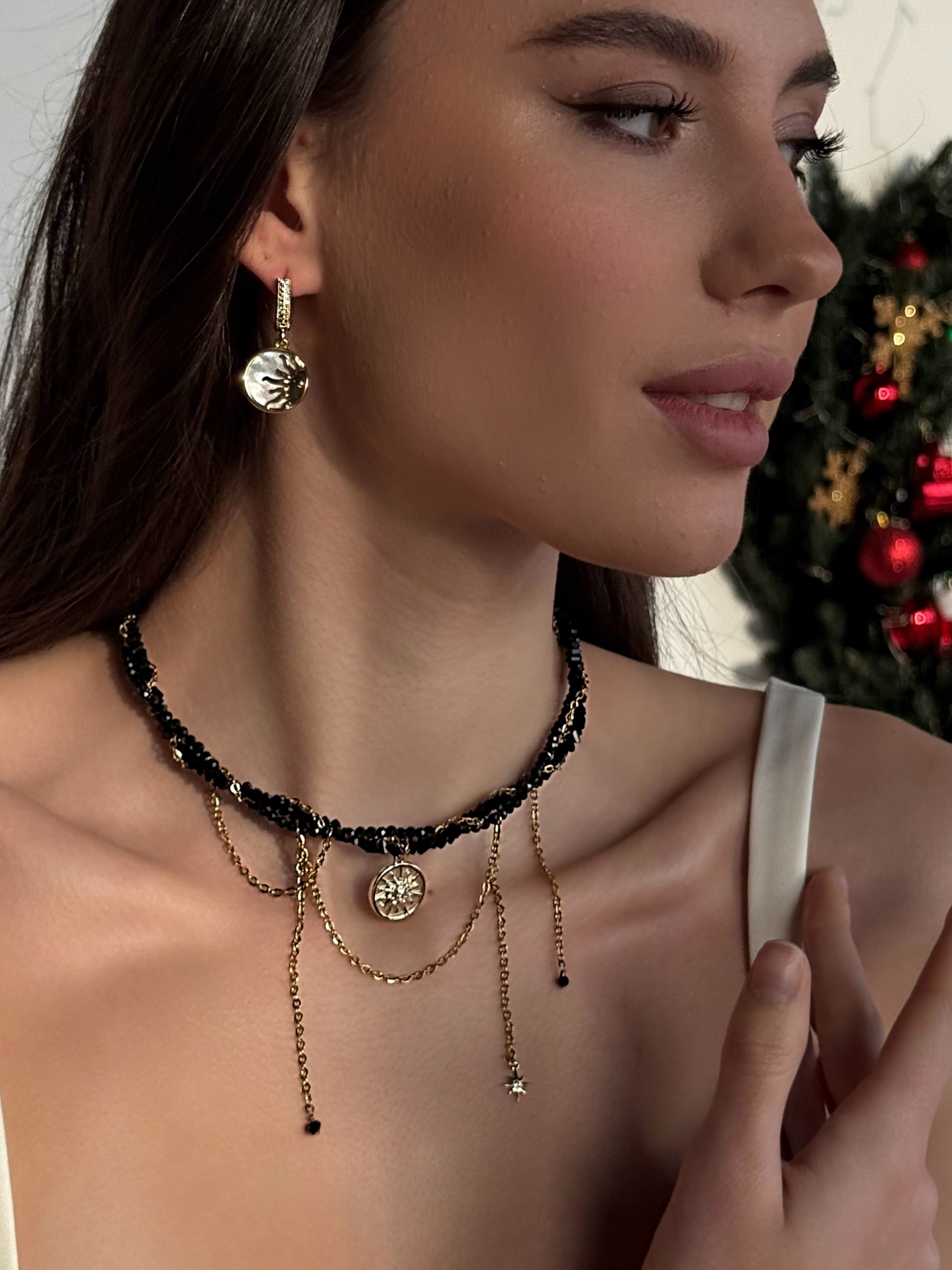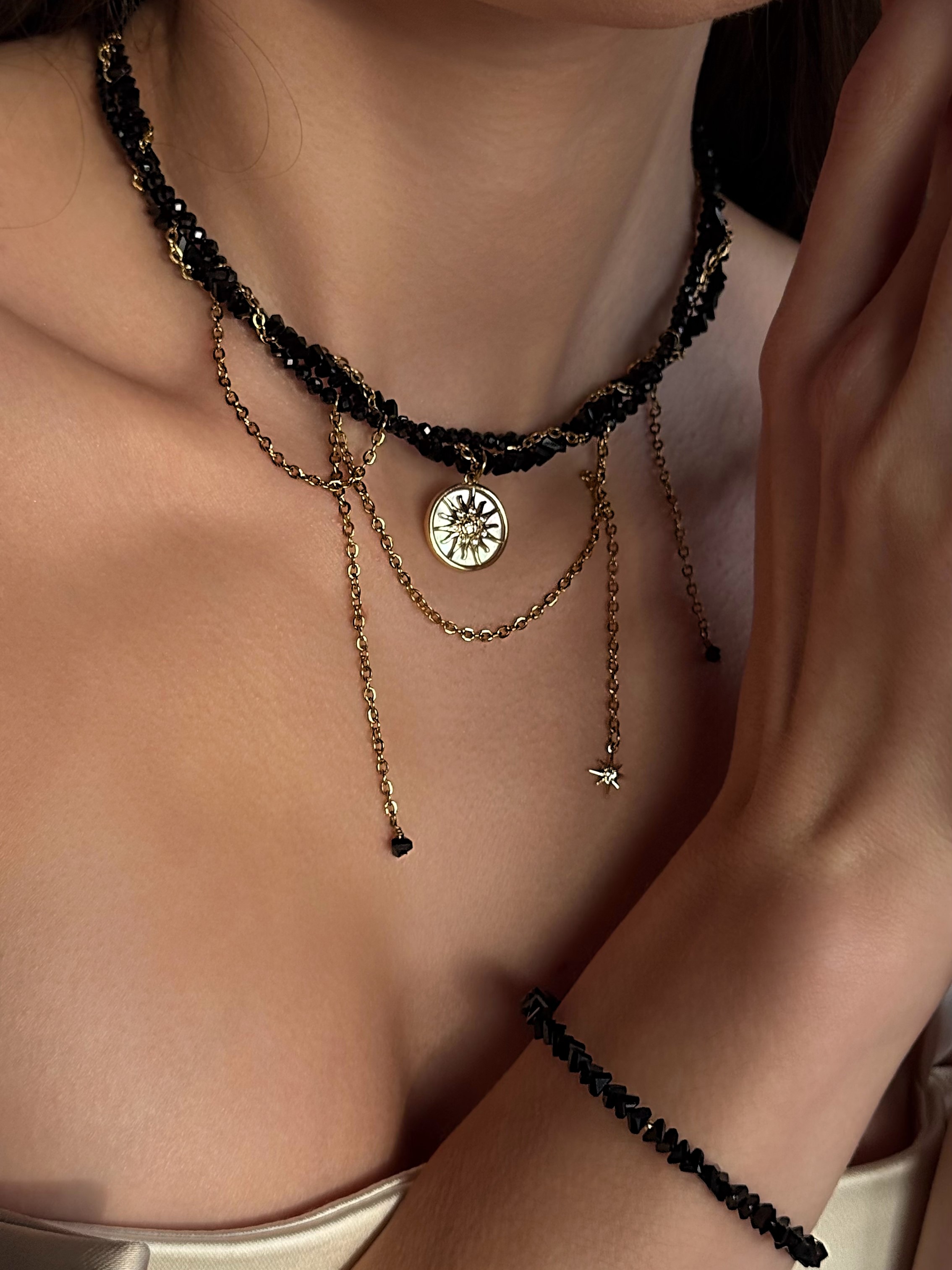 - Кольє з чорного кришталю та фіанітів з сонцем