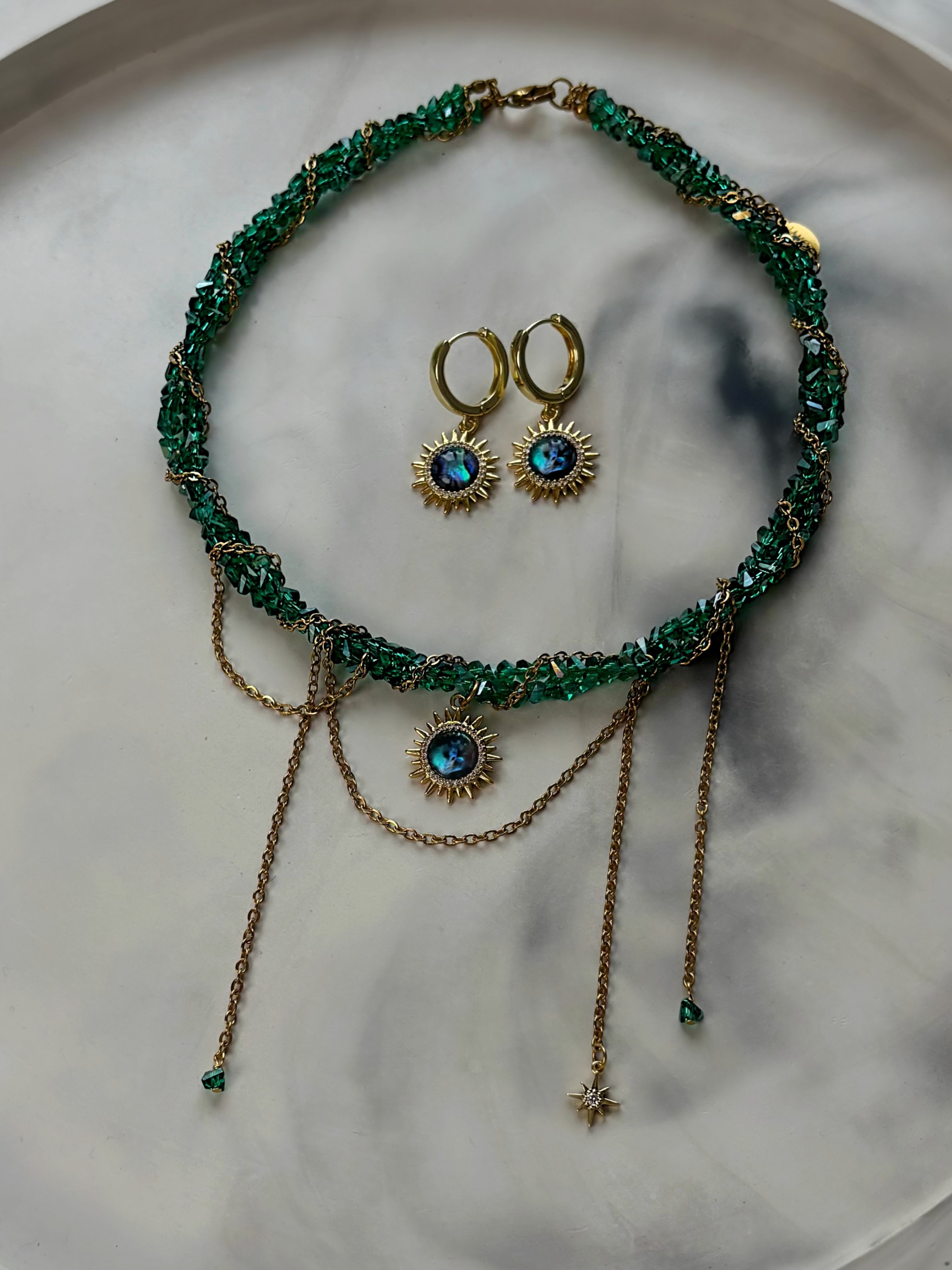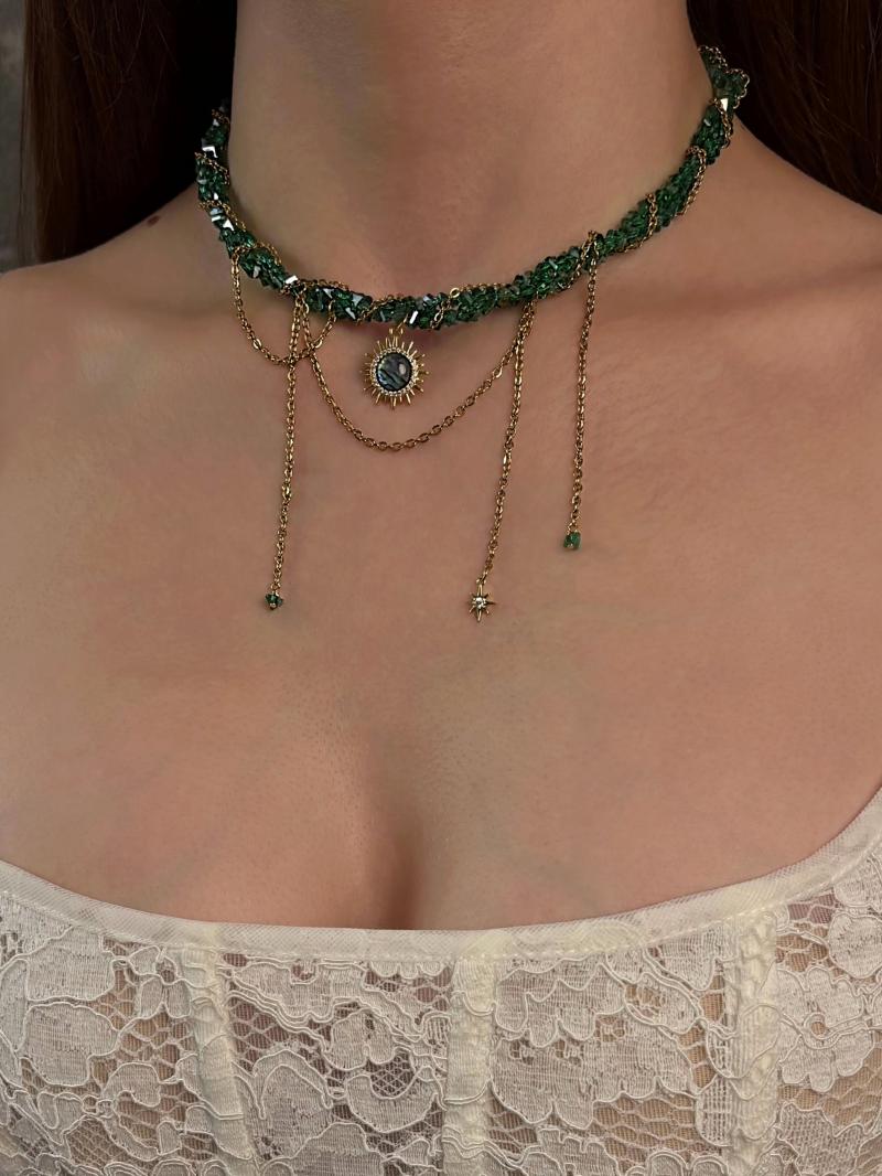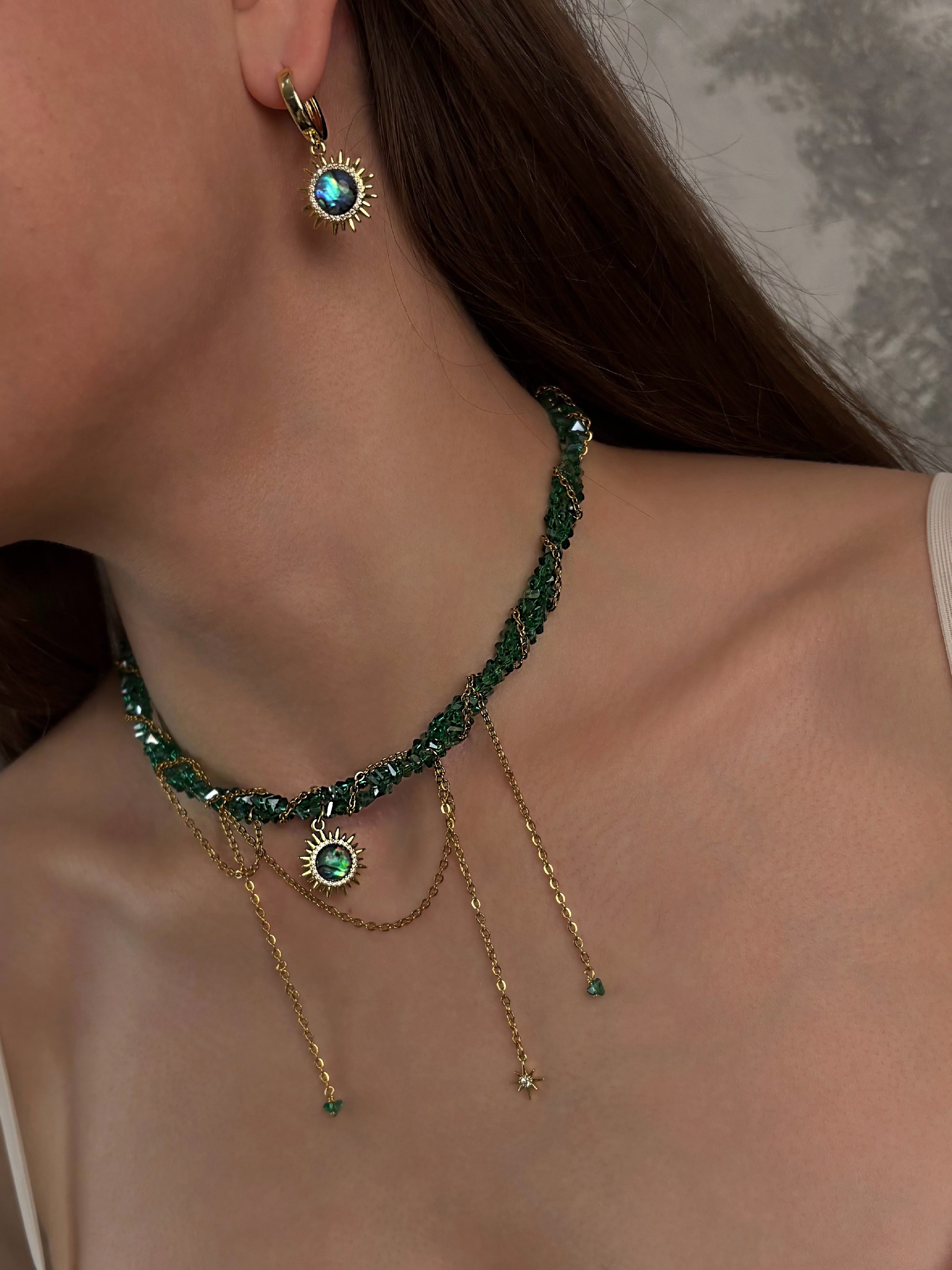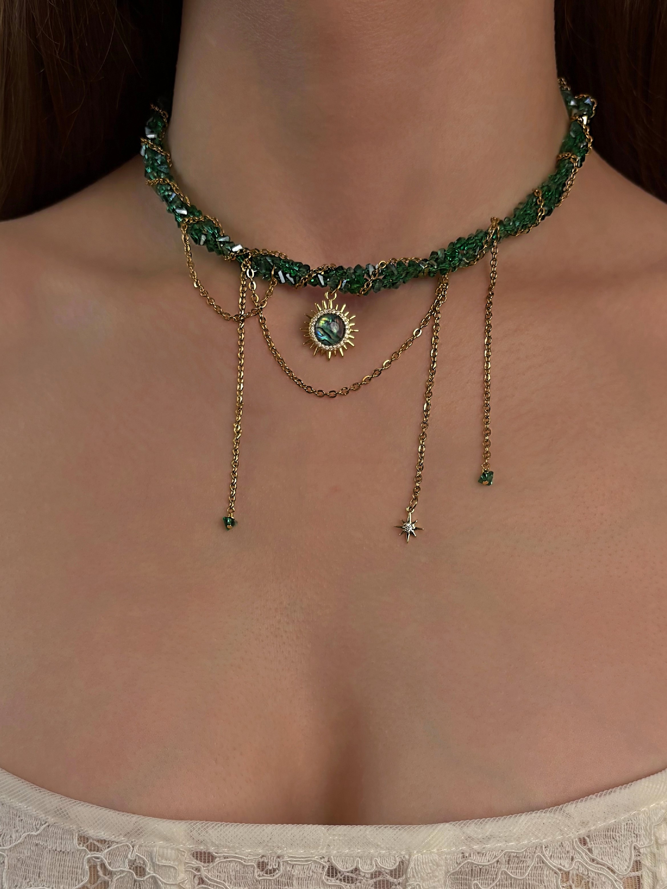 Кольє з відбірного кришталю, з додаванням ланцюжків та перламутрового кулону. Матеріал фурнітури: ювелірна сталь та латунь з покриттям родій (у золотому кольорі). Стандартна довжина 37 см та 6 см подовжувач.
