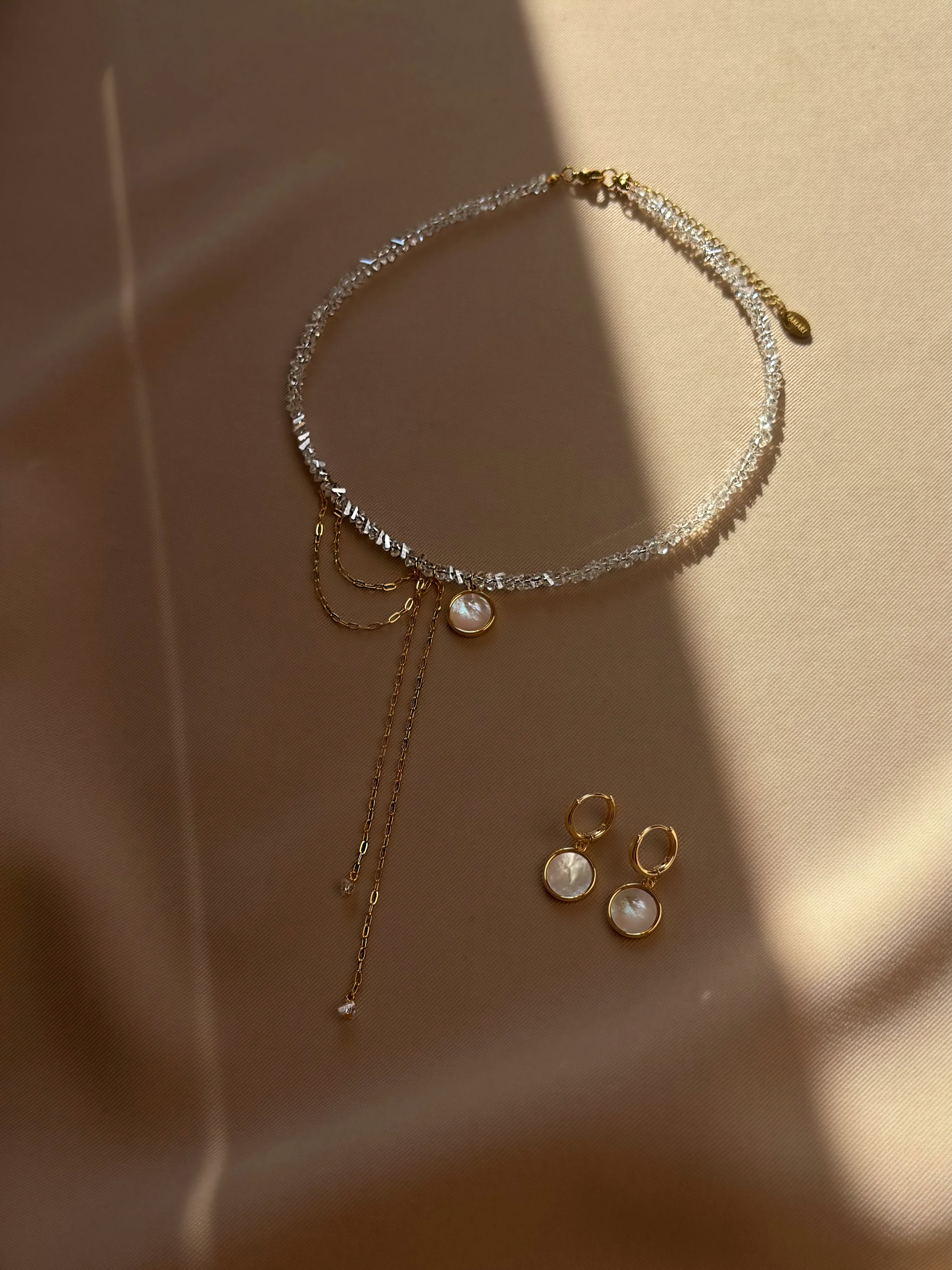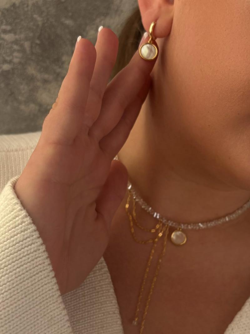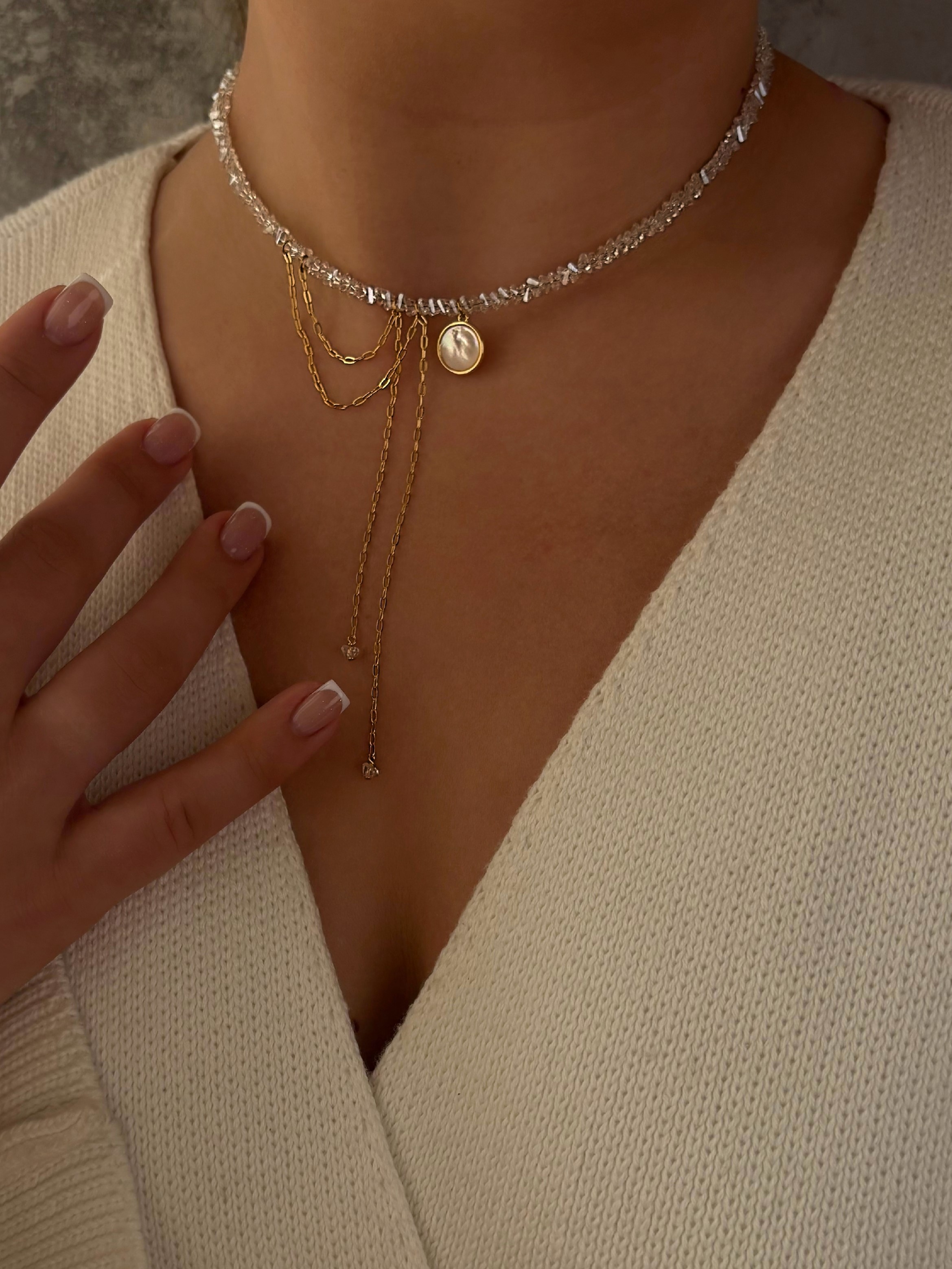 Кольє з відбірного прозорого кришталю. Кулон з натуральним перламутром та ланцюжок. Матеріал фурнітури: ювелірна нержавіюча сталь та латунь з покриттям позолоти (у золотому кольорі). Стандартна довжина 36 см та 6 см подовжувач. Замір шиї моделі впритул 32 см.