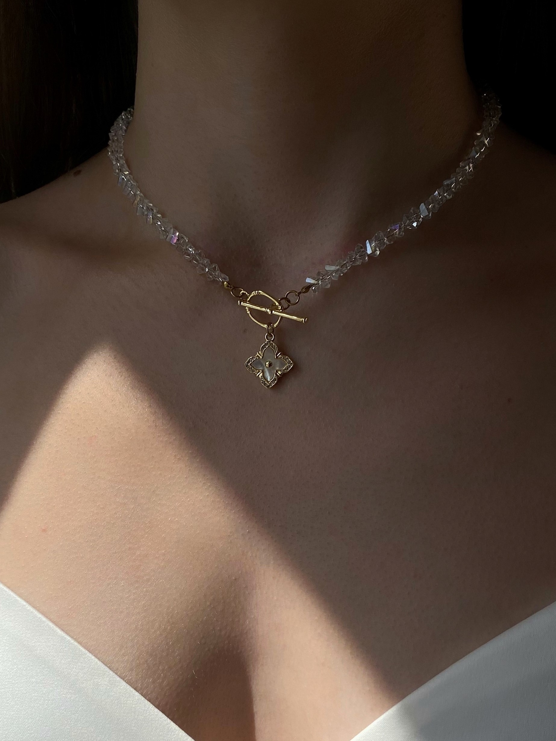 Кольє з відбірного кришталю з двостороннім кулоном. Матеріал фурнітури: латунь з покриттям позолоти (у золотому кольорі). Стандартна довжина 43 см. Замір шиї моделі впритул 29 см.