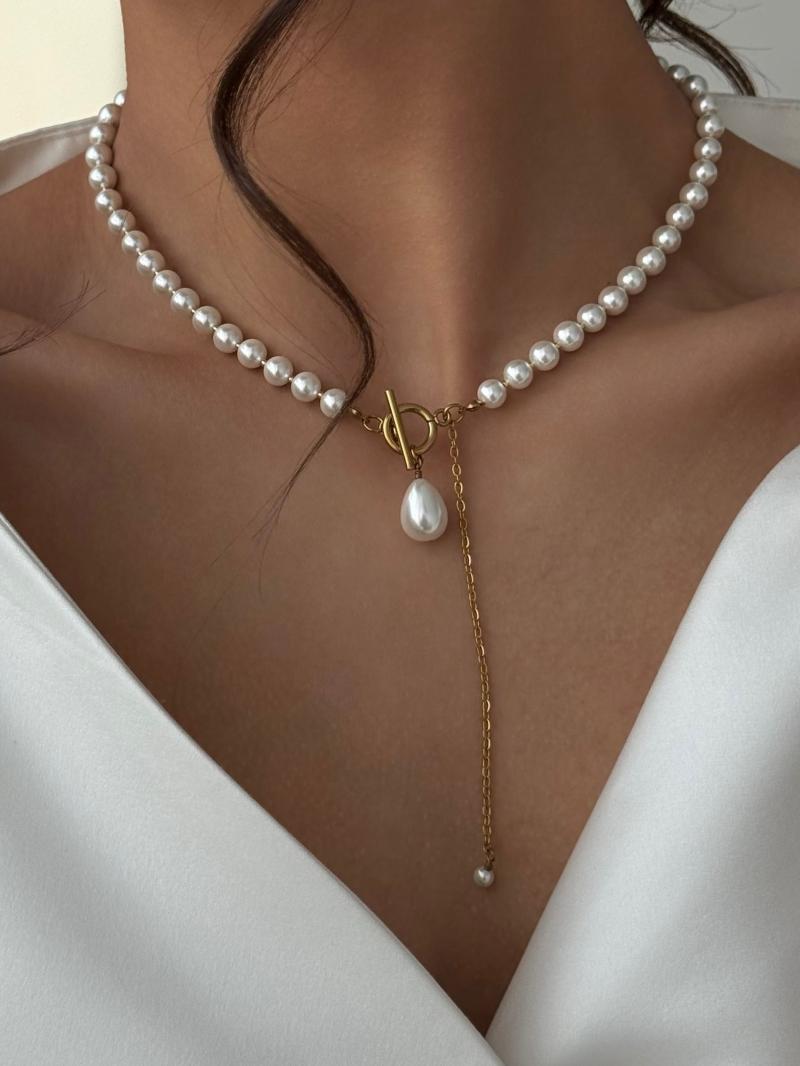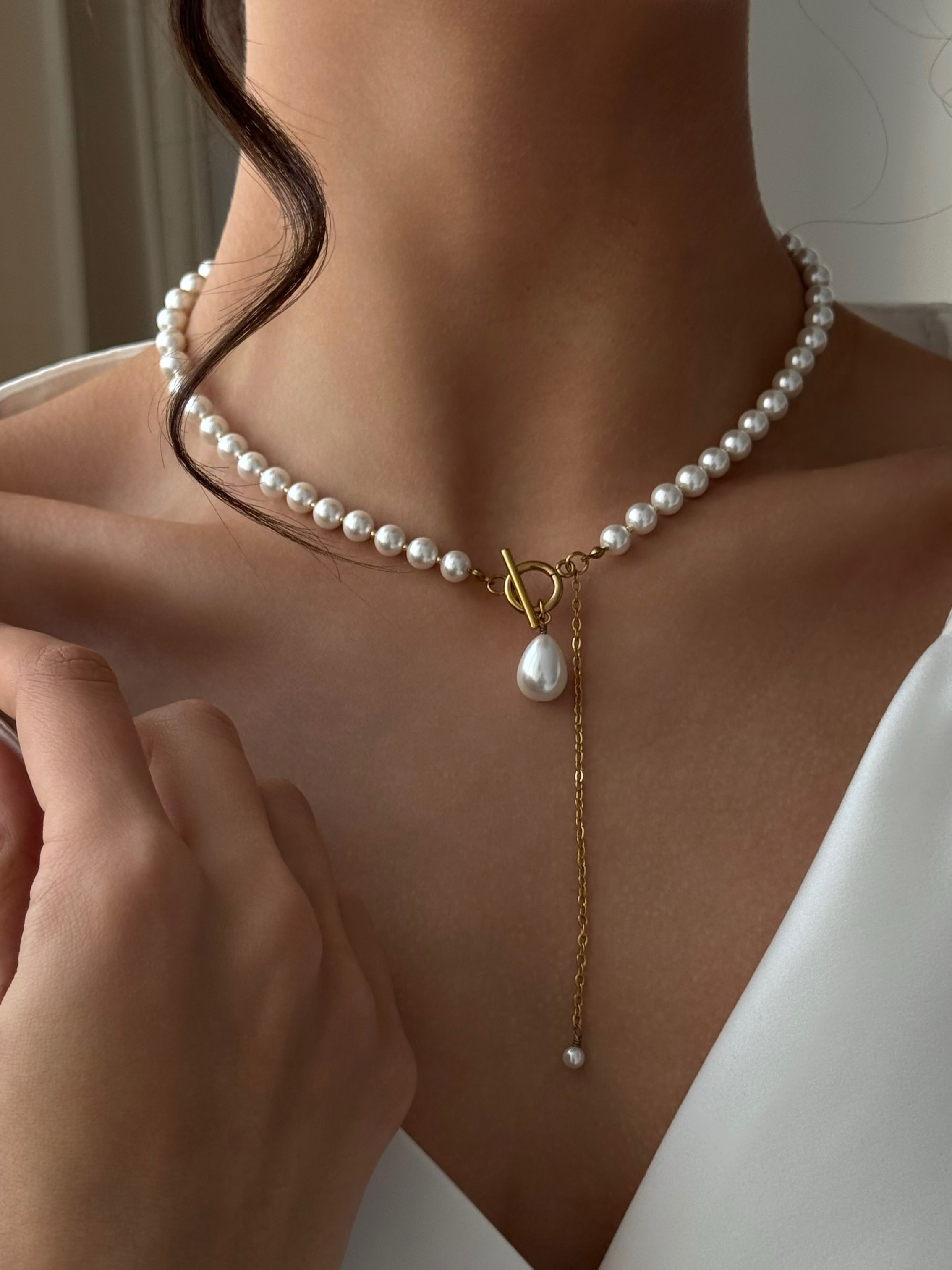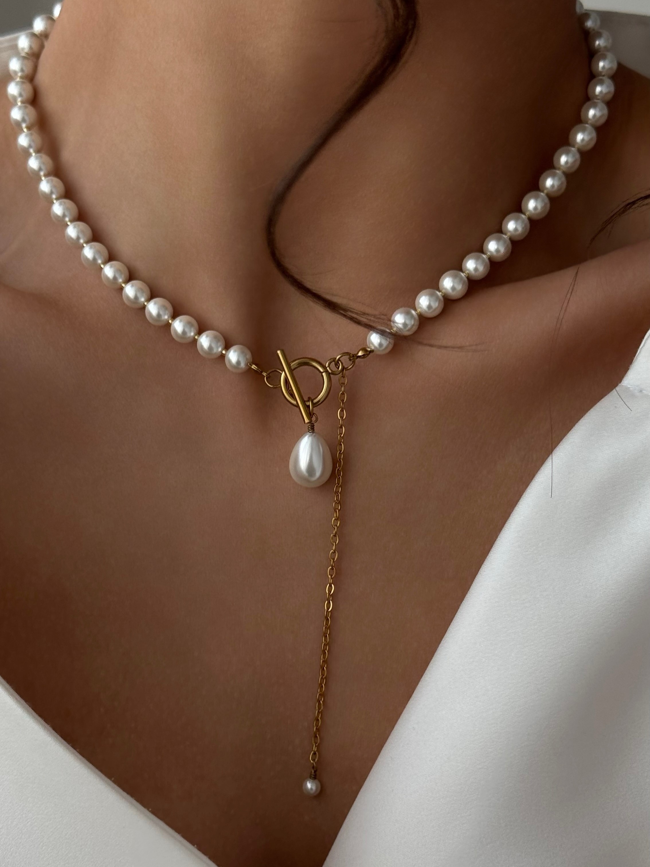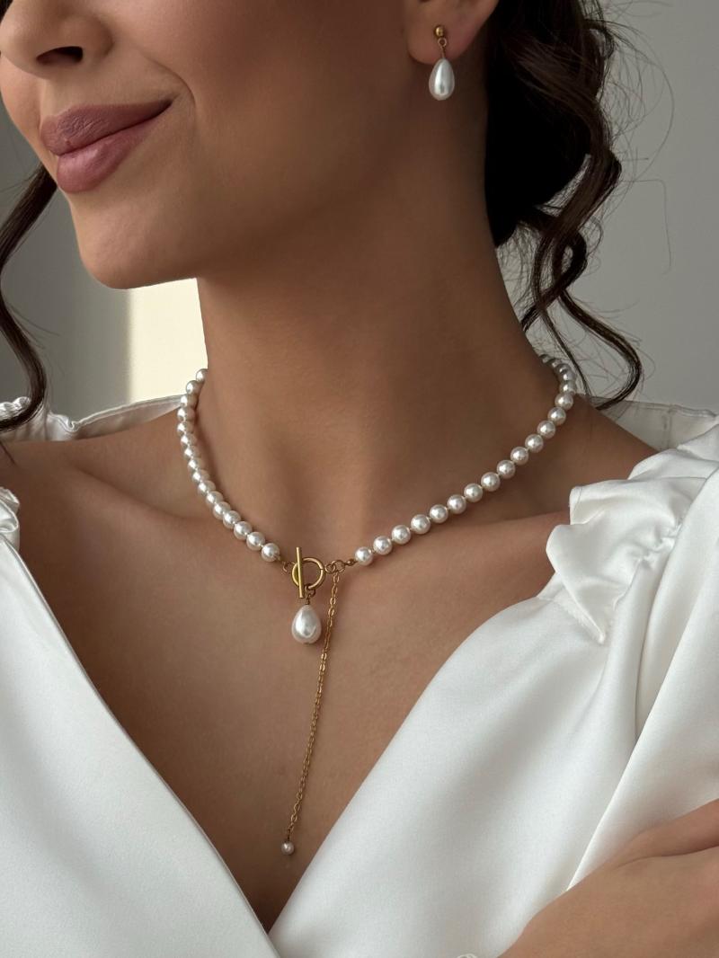 Кольє виготовлене з надзвичайно блискучих перлин Майорка з акцентною застібкою тогл  та сонцем з натуральним перламутром. Матеріал нержавіюча ювелірна сталь з позолотою (у золотому кольорі). Стандартна довжина 42 см.