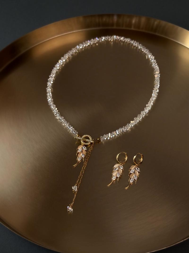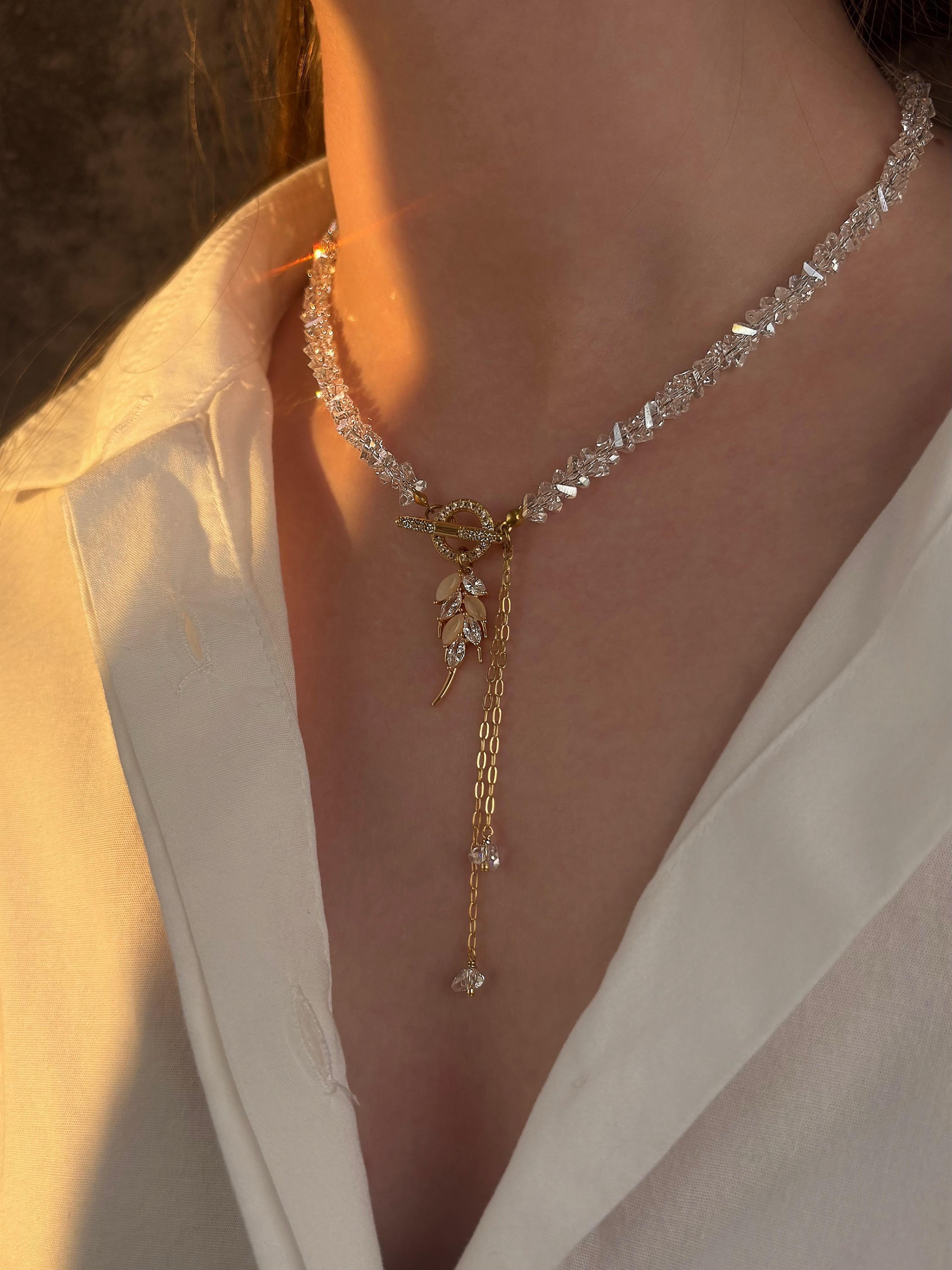 Кольє з відбірного кришталю з серцем. Матеріал фурнітури: латунь з покриттям позолоти (у золотому кольорі). Стандартна довжина 43 см. Замір шиї моделі впритул 29 см.
