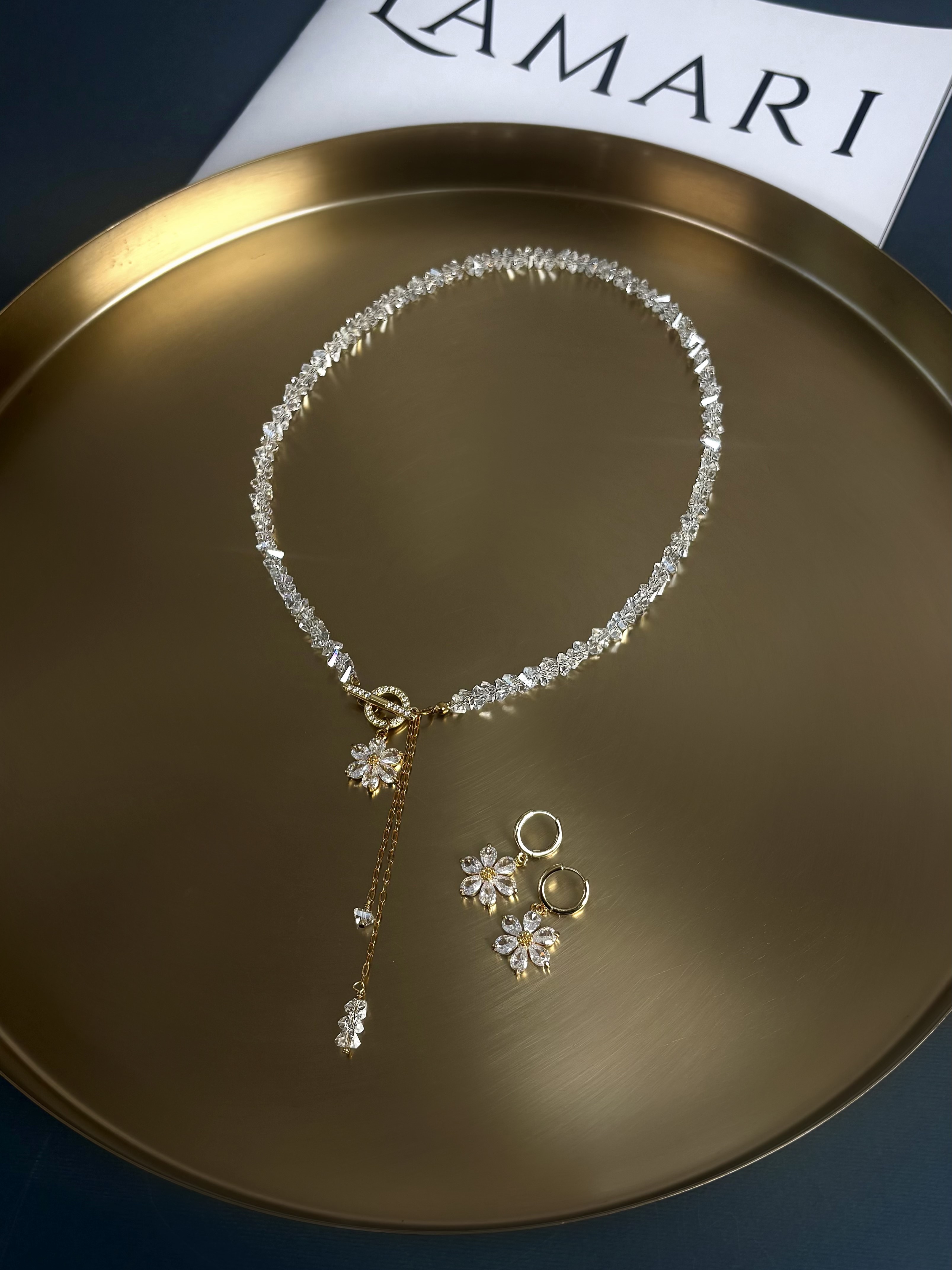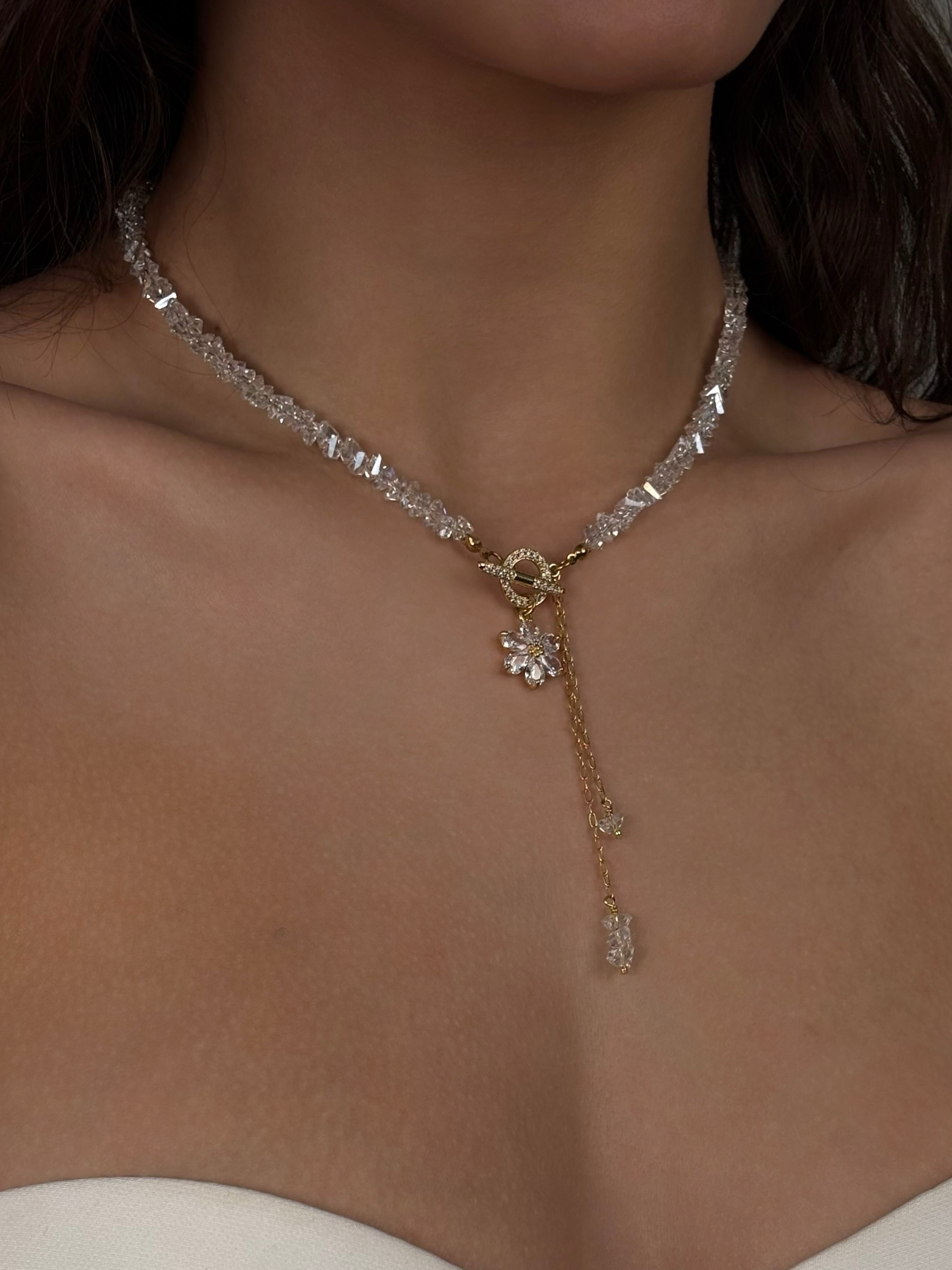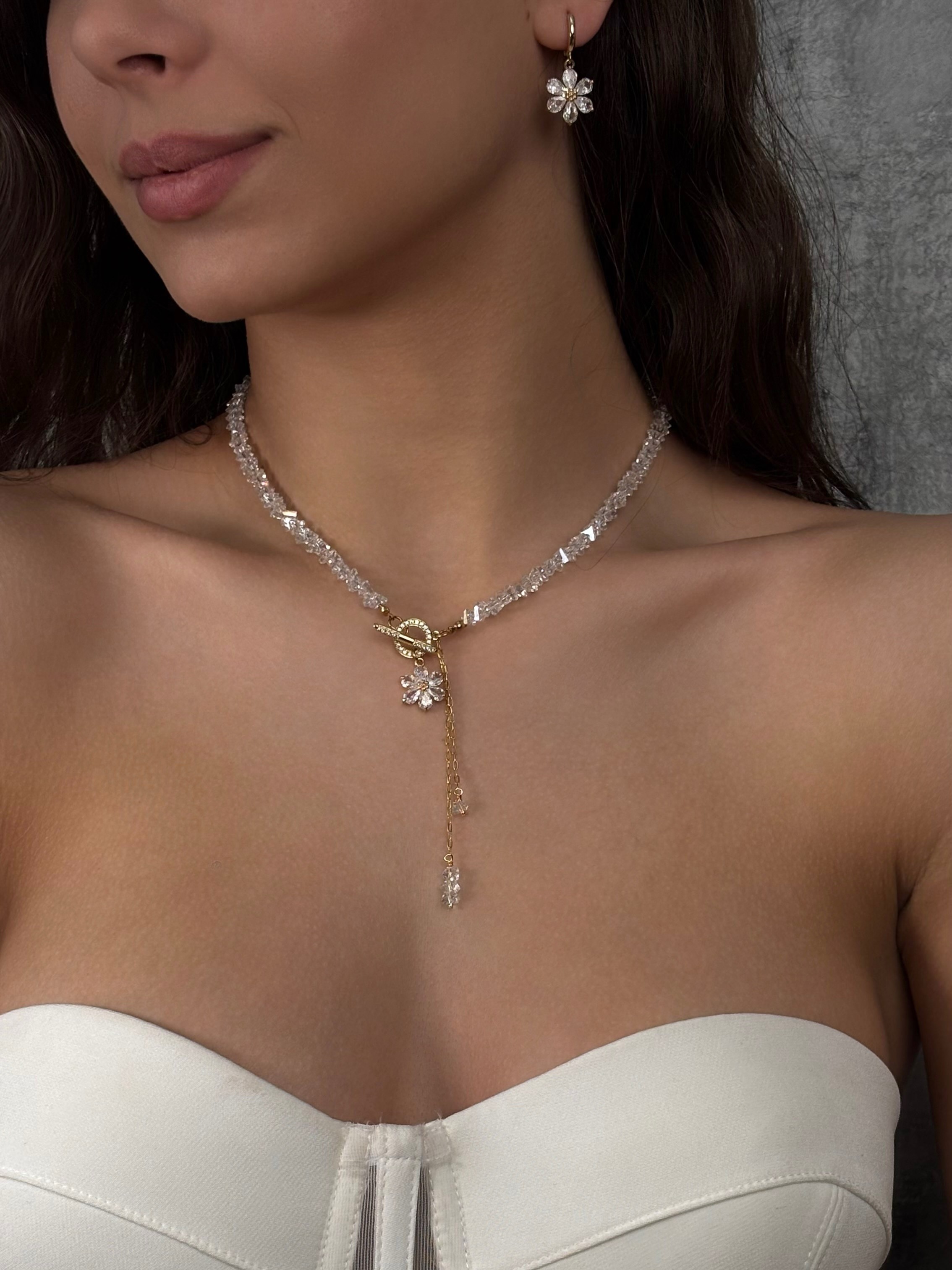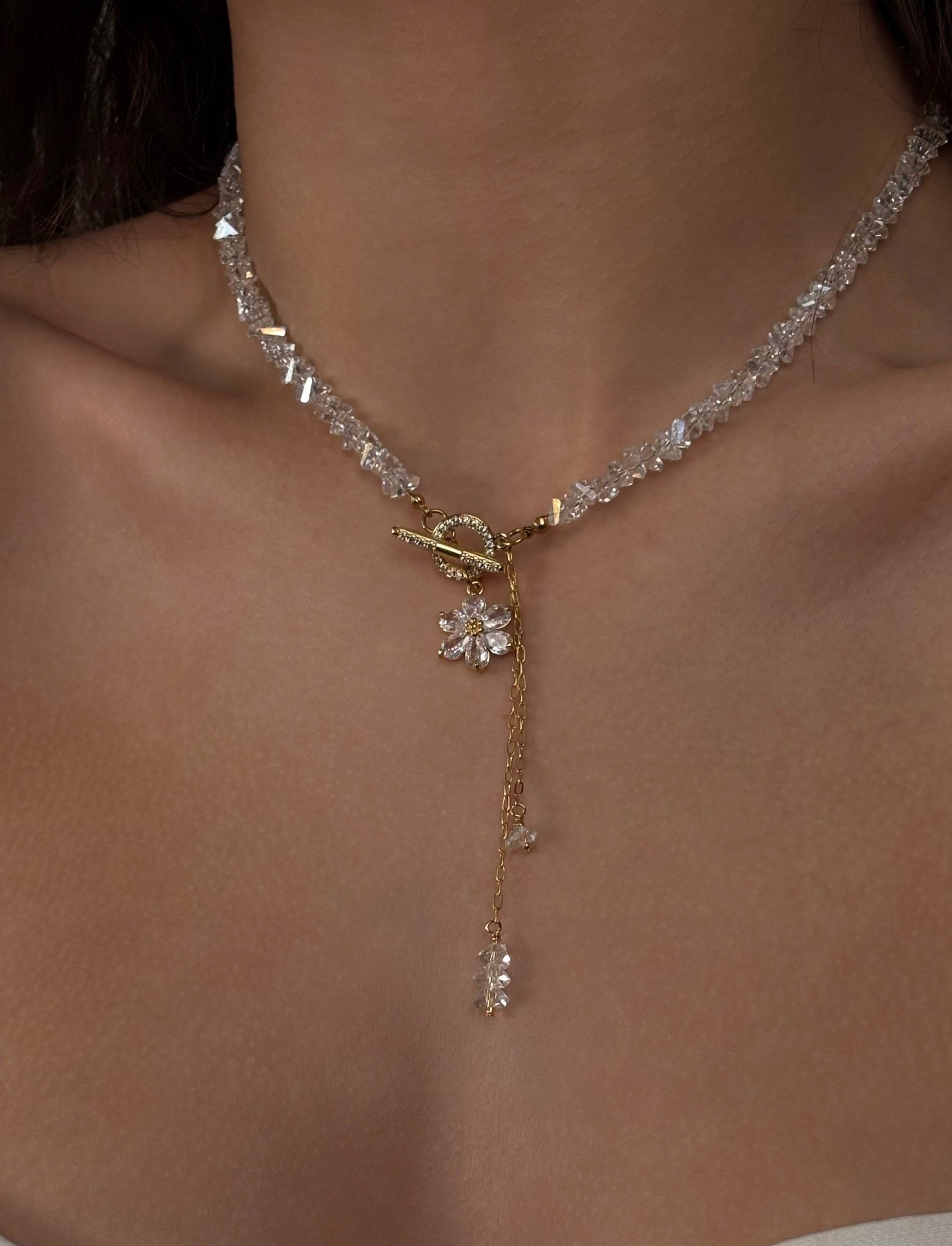 Кольє з відбірного кришталю з квіткою. Застібка тогл з фіанітами. Матеріал фурнітури: латунь з покриттям позолоти (у золотому кольорі). Стандартна довжина 43 см. Замір шиї моделі впритул 29 см.