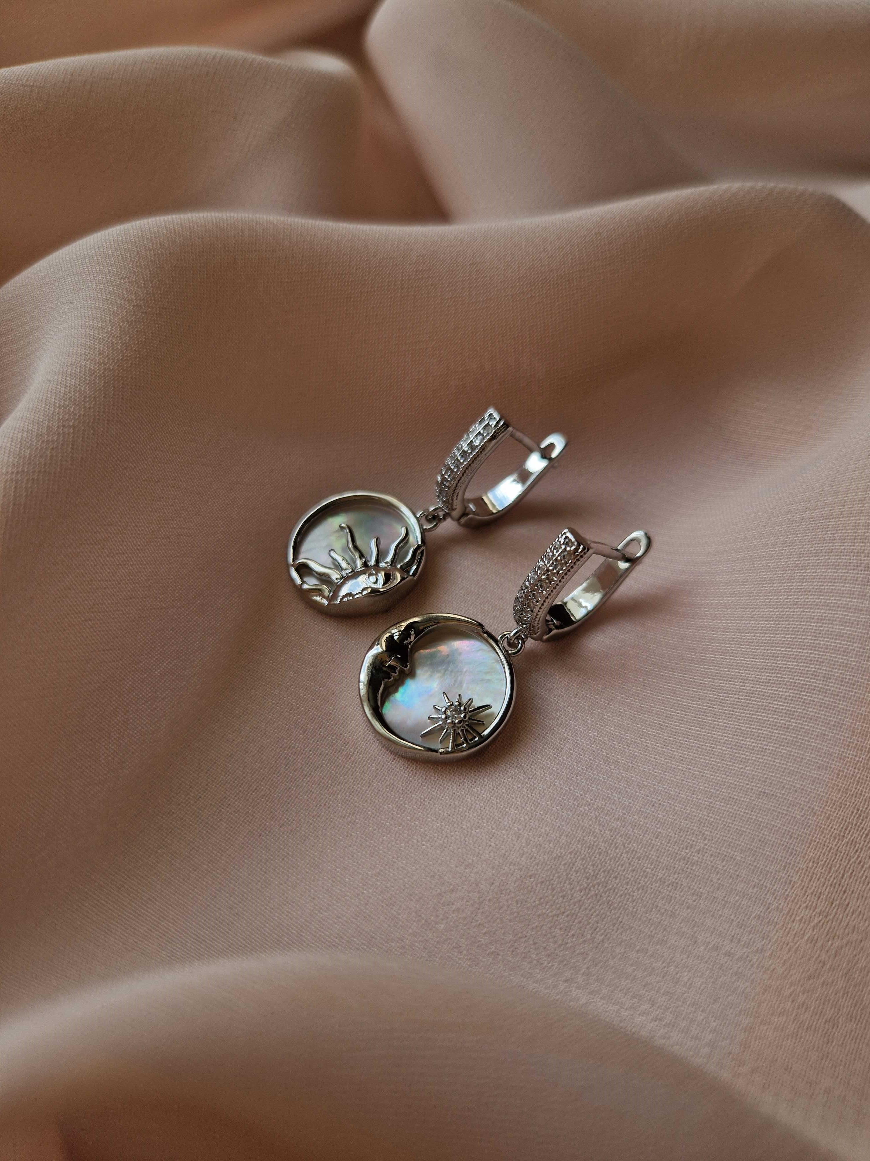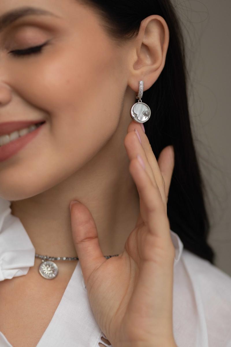Неймовірні сережки з натуральним перламутром. Основа інкрустована фіанітами. Матеріал основи латунь з покриттям родій (у срібному кольорі).