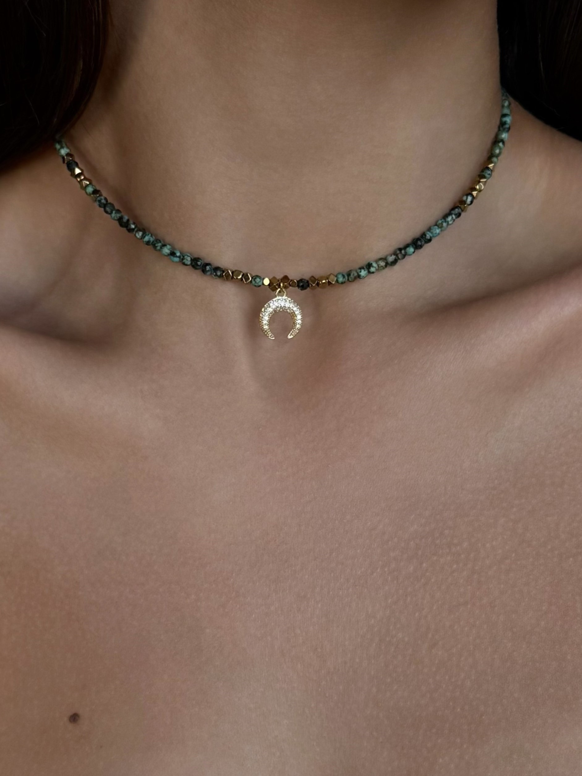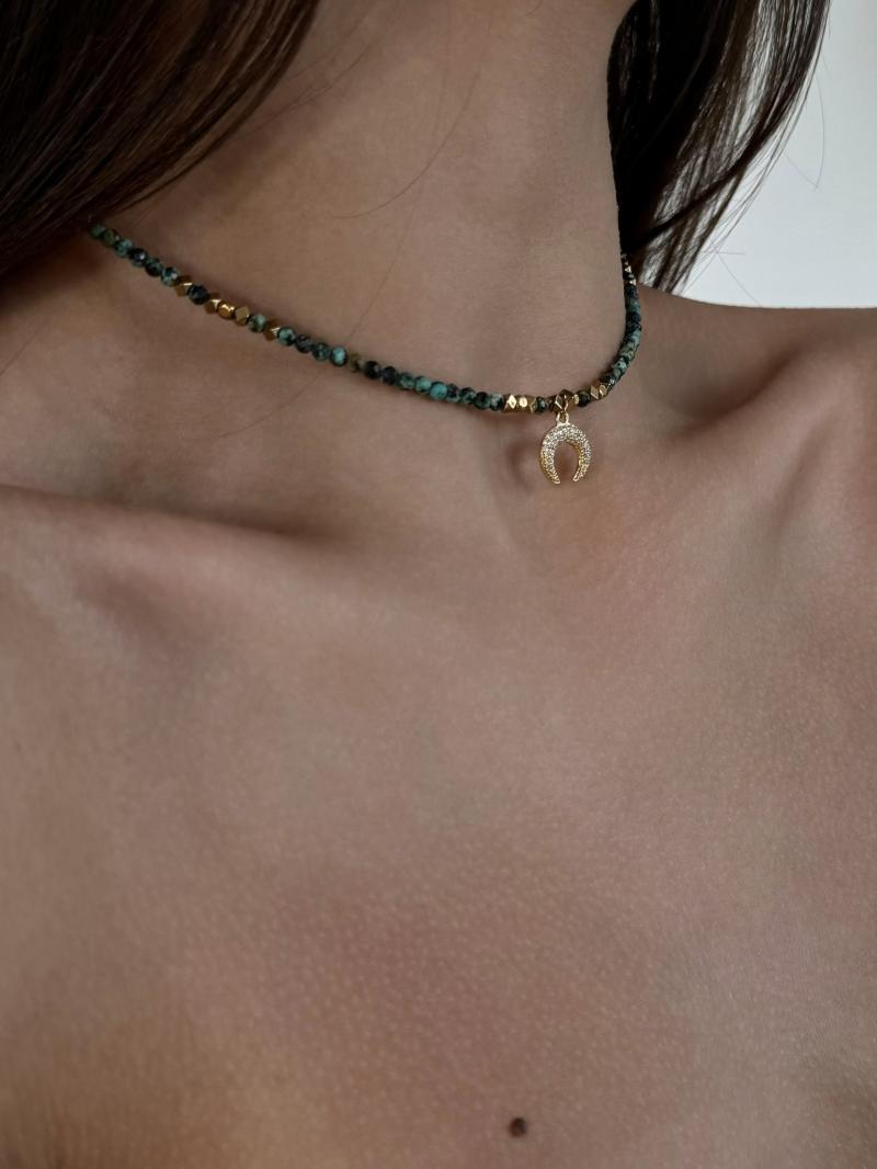 Чокер з натуральною бірюзи та гематиту з кулоном. Фурнітура преміум класу: ювелірна сталь з позолотою (в золотому кольорі), кулон матеріалу латунь з покриттям позолоти 18 карат. Стандартна довжина 36 см + 6 см подовжувач. Замір шиї моделі - 29 см впритул.