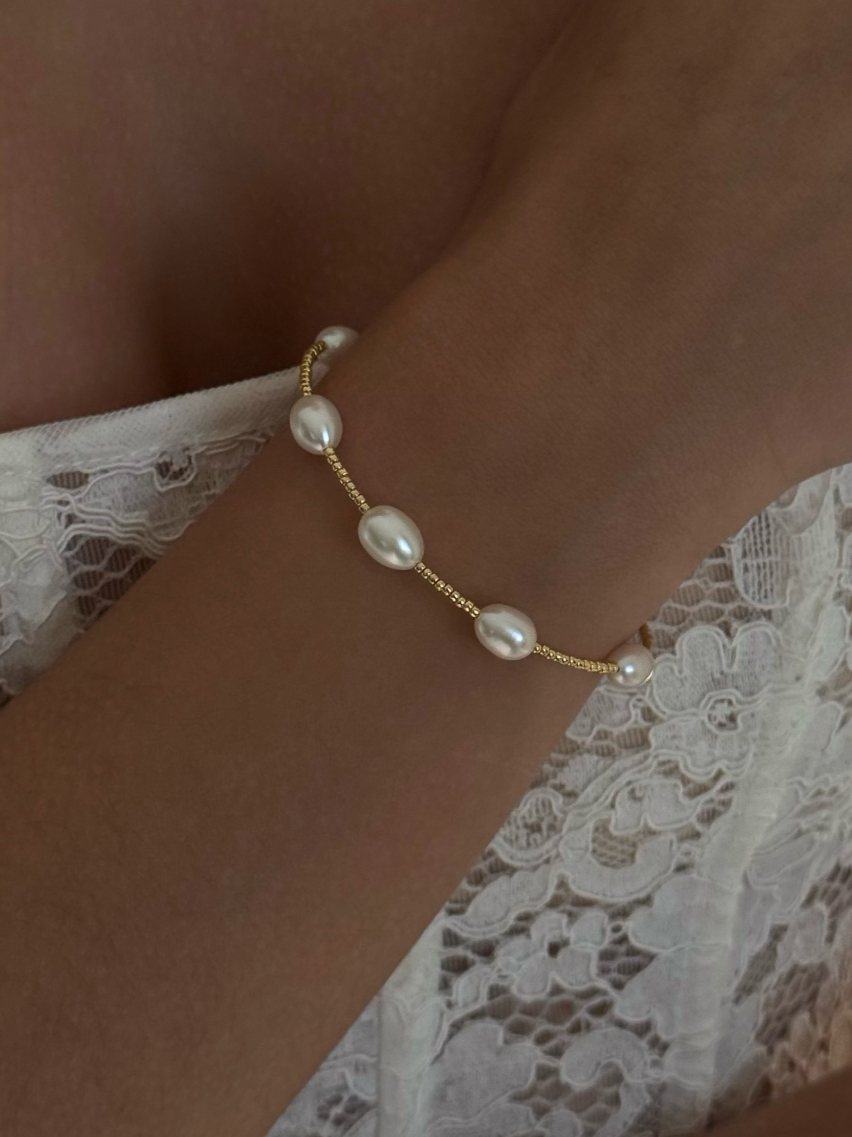 Браслет з японського ювелірного бісеру та натуральних перлин. Бездоганно прикрашає зап'ястя. Може бути як самостійною прикрасою або використовуватись у сеті. Бісер має стійке гальванічне покриття. Фурнітура латунь з покриттям позолоти 18 карат (у золотому кольорі).