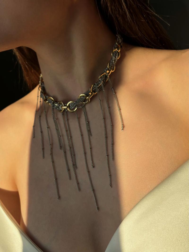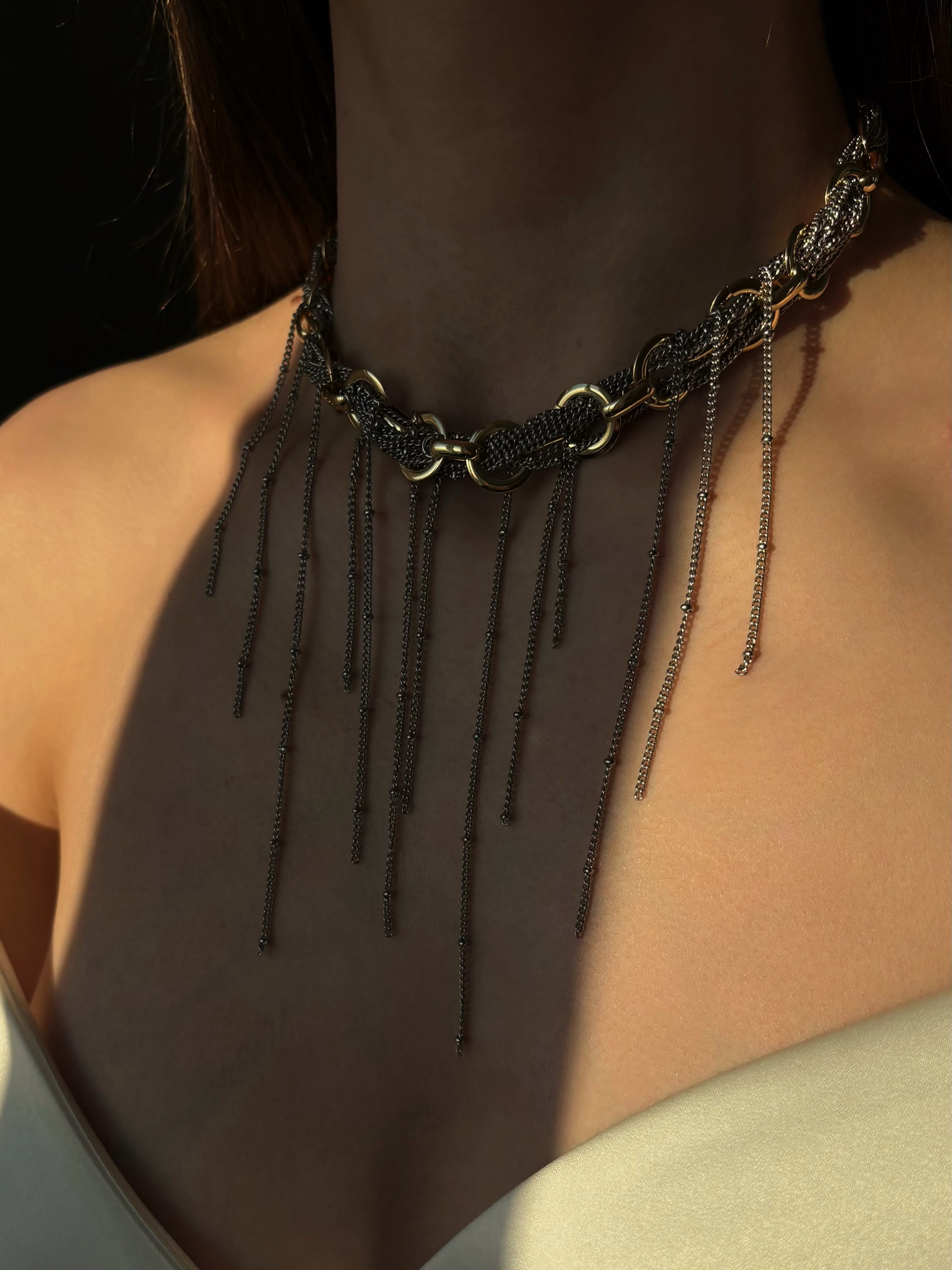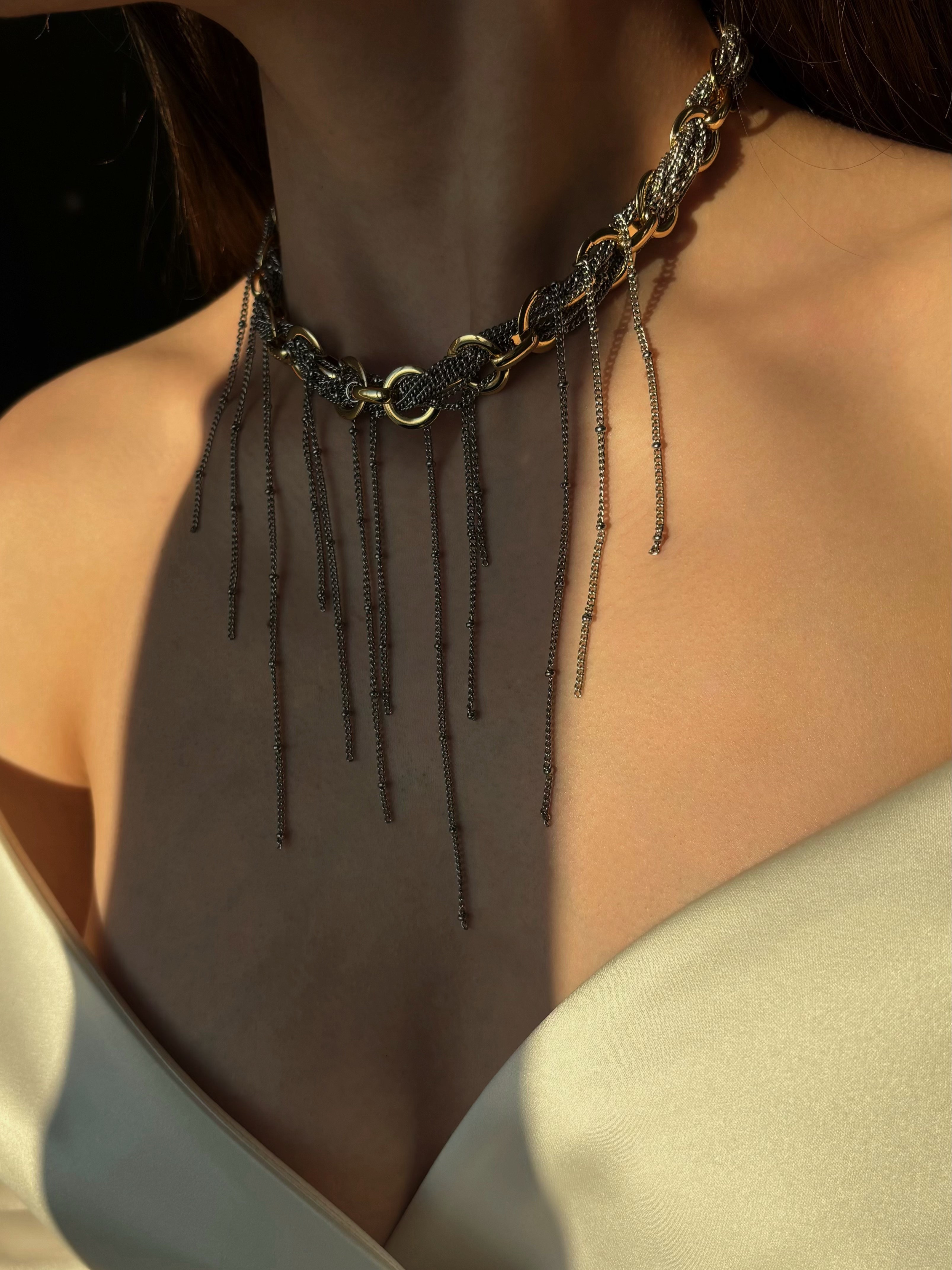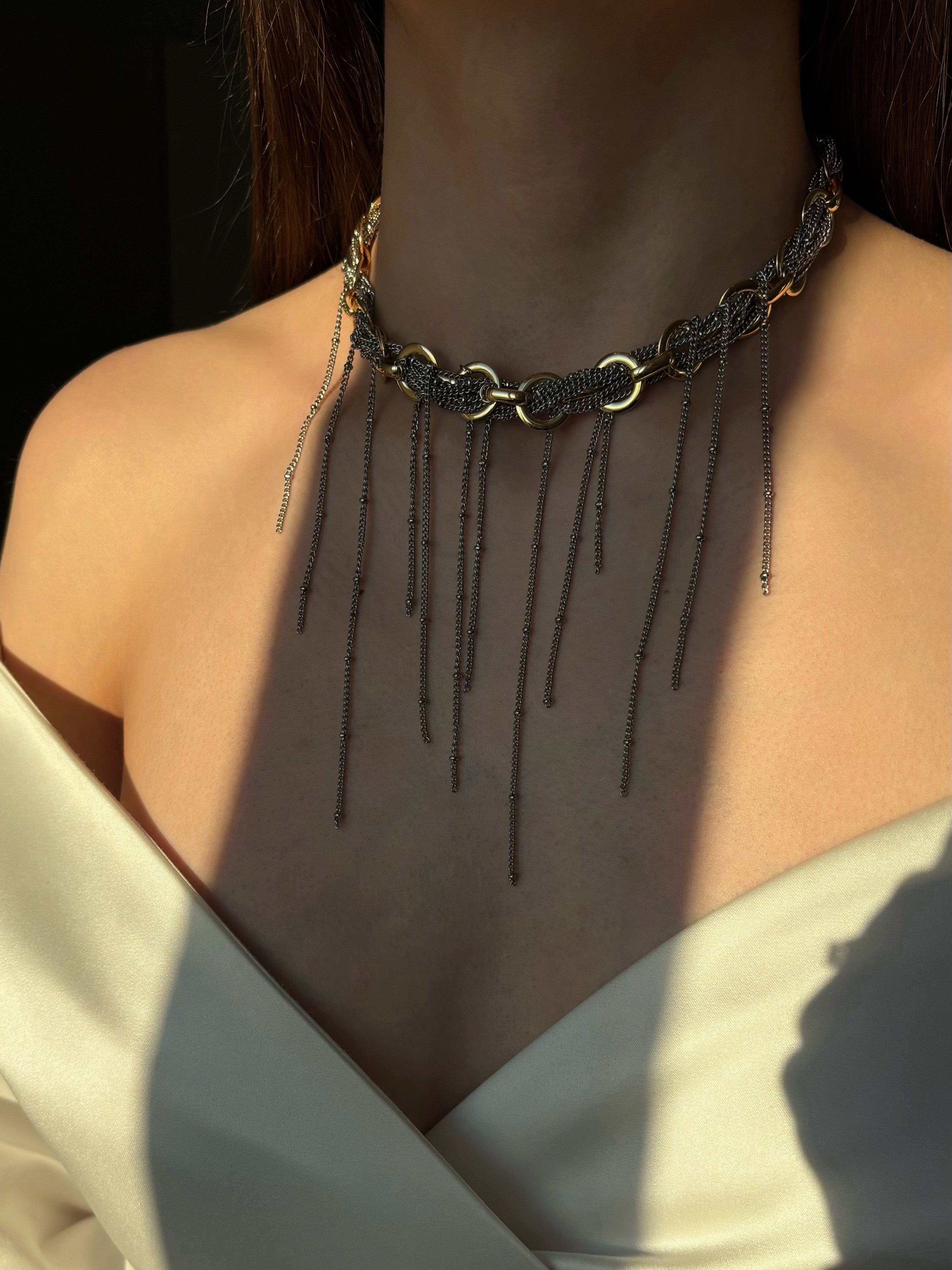 Акцентне кольє біколор, в якому поєднуються ланцюжки різного розміру та плетіння у золотому та срібному кольорі. Матеріал фурнітури нержавіюча ювелірна сталь та латунь з позолотою (у золотому та срібному кольорі). Стандартна довжина 37 см та 6 см подовжувач. Замір шиї моделі впритул 29 см.