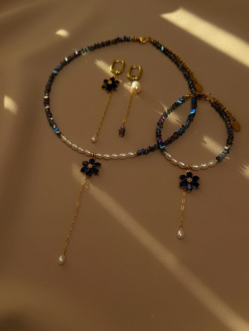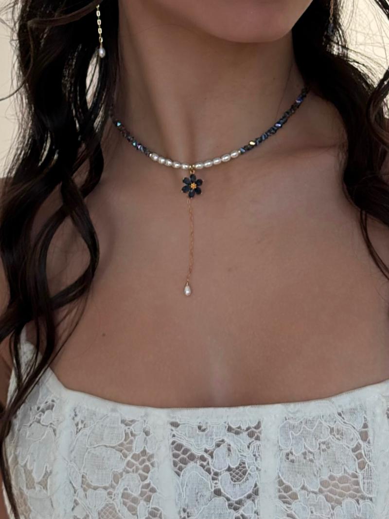 Кольє з кришталю синього кольору та перлин. Кулон квітка та ланцюжок. Матеріал фурнітури: ювелірна сталь та латунь з позолотою (у золотому кольорі) Стандартна довжина 36 см та 6 см подовжувач.
