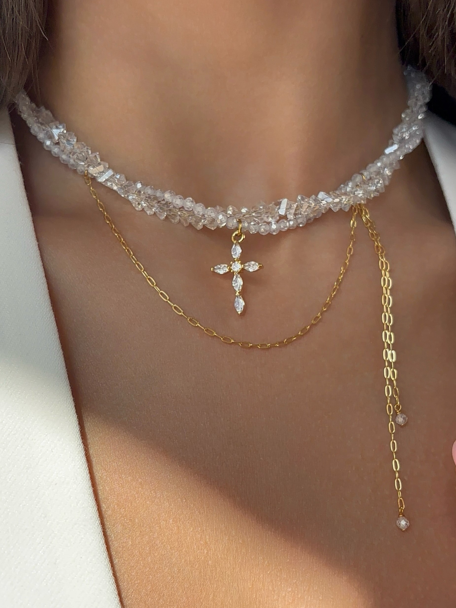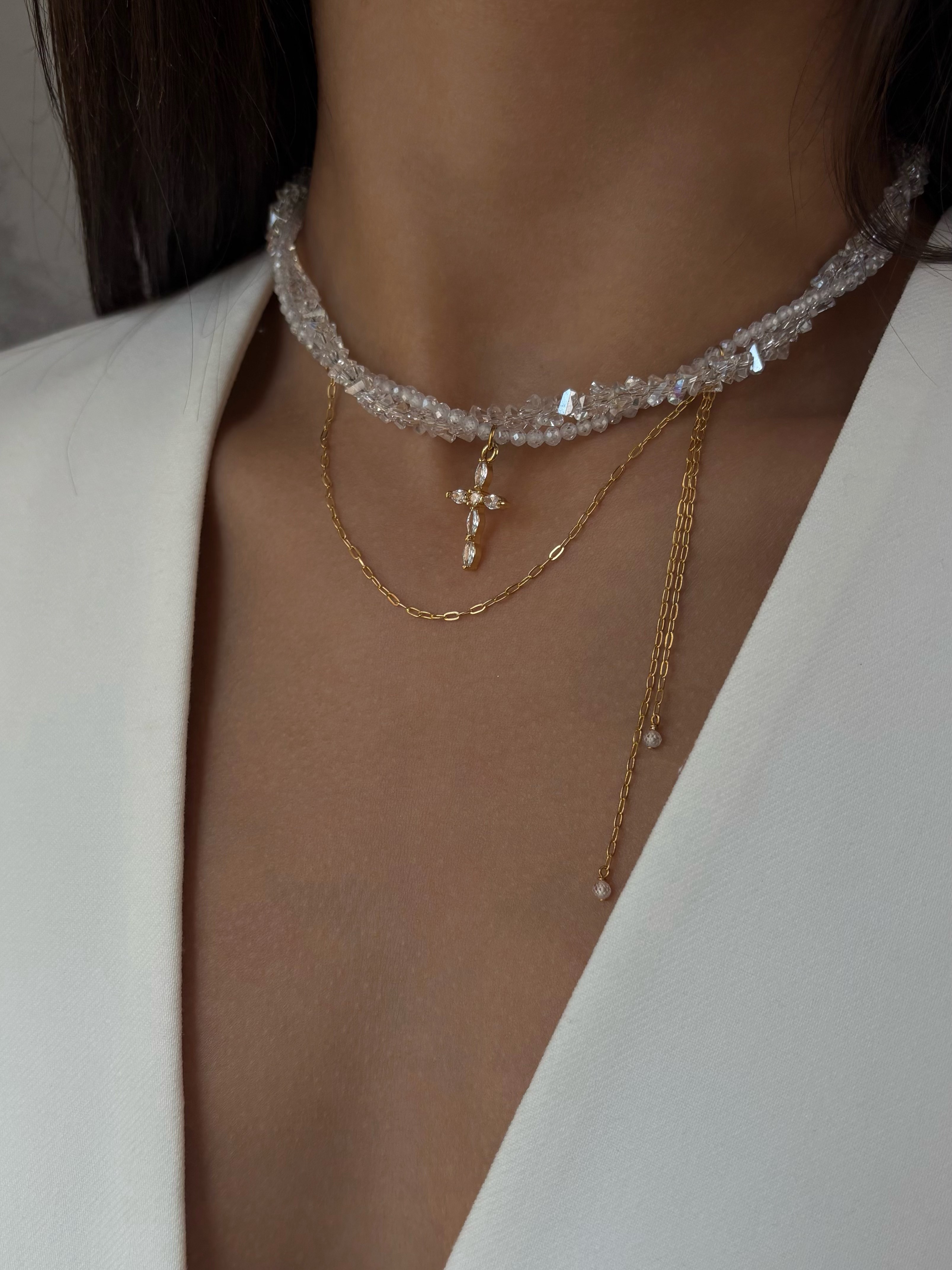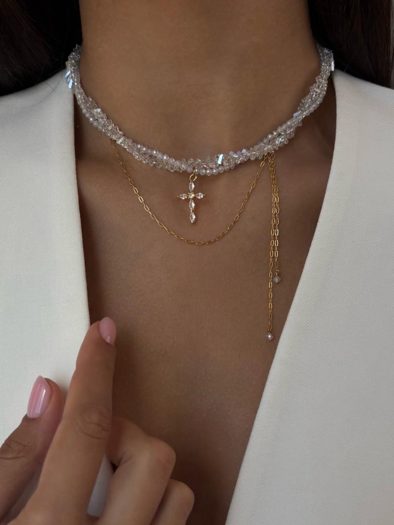 Кольє з відбірного кришталю, з додаванням кулону. Матеріал фурнітури: ювелірна сталь з позолотою (у золотому кольорі) Стандартна довжина 37 см та 6 см подовжувач.
