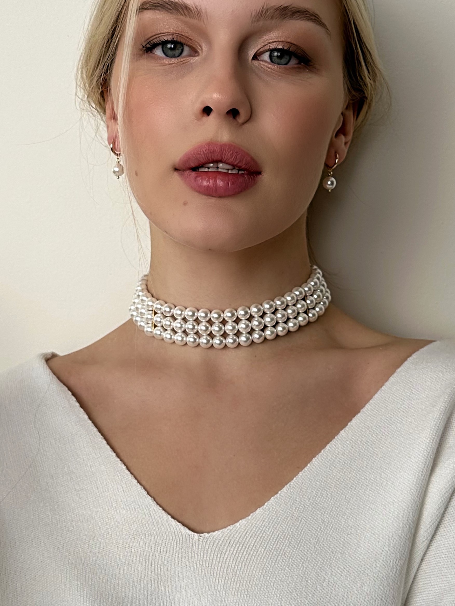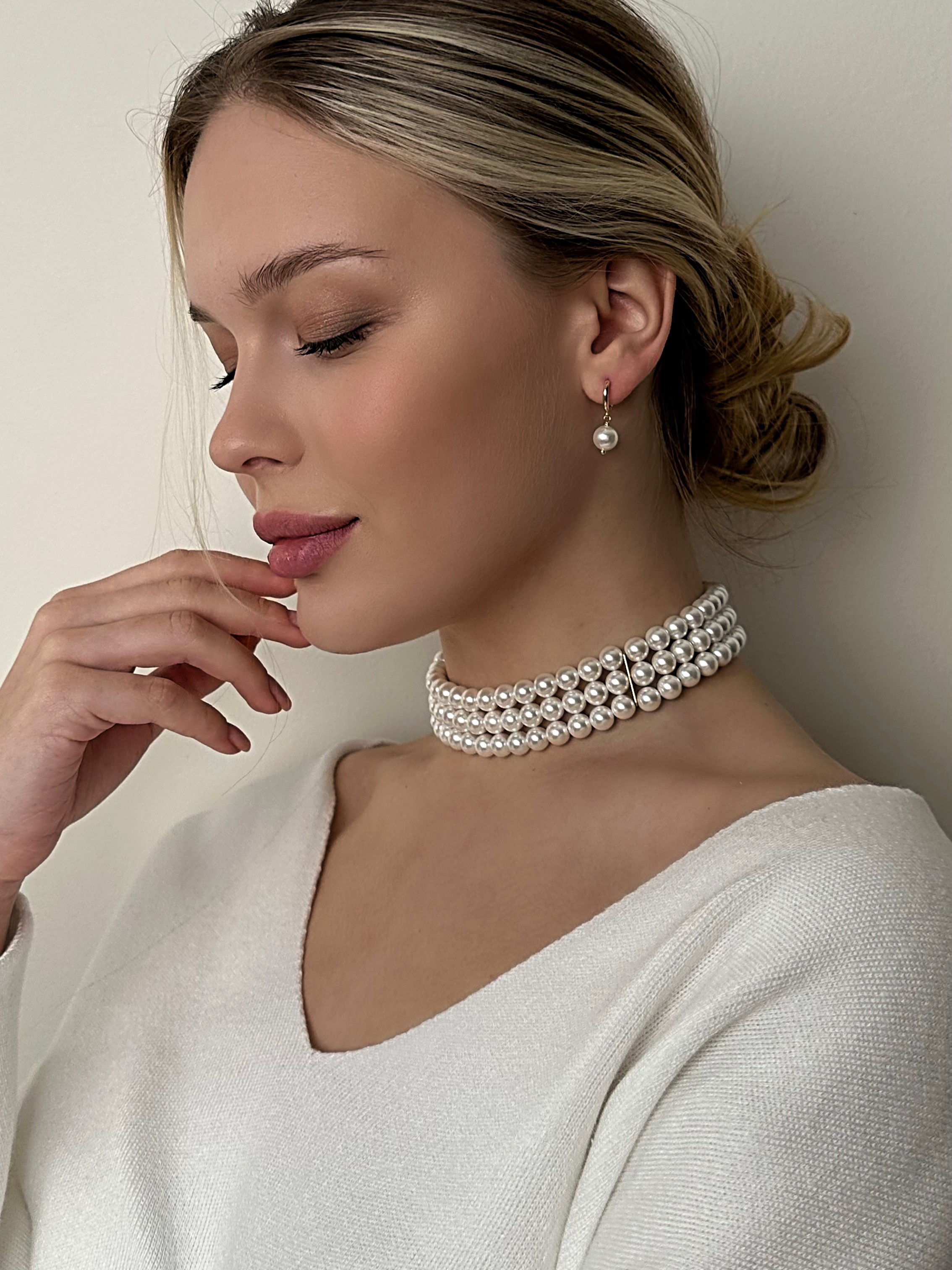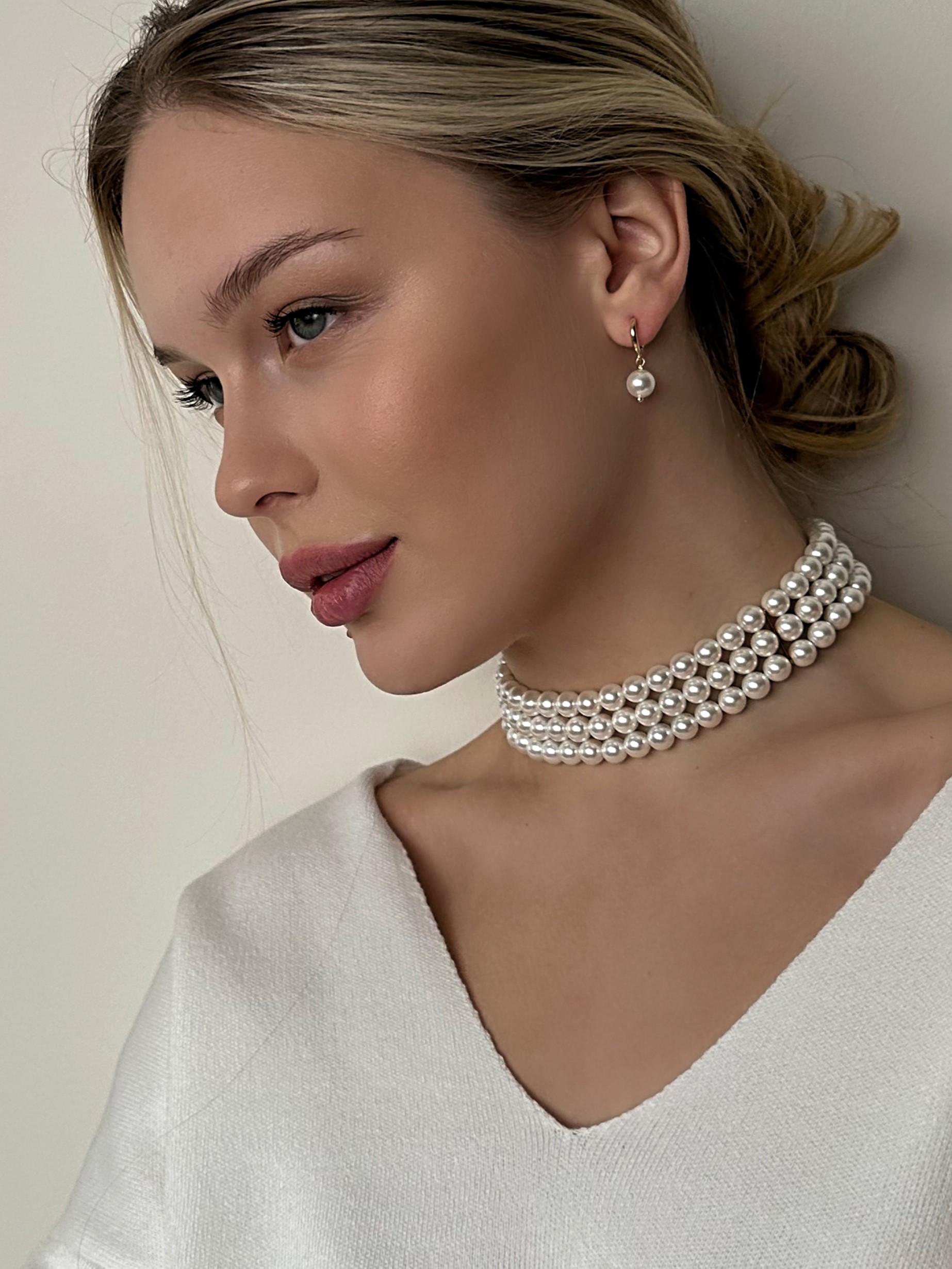 Потрійне кольє з високоякісних перлин Майорка. Фурнітура нержавіюча ювелірна сталь з позолотою (у золотому кольорі). Стандартна довжина 37 см та 6 см подовжувач. Замір шиї моделі впритул 29 см.