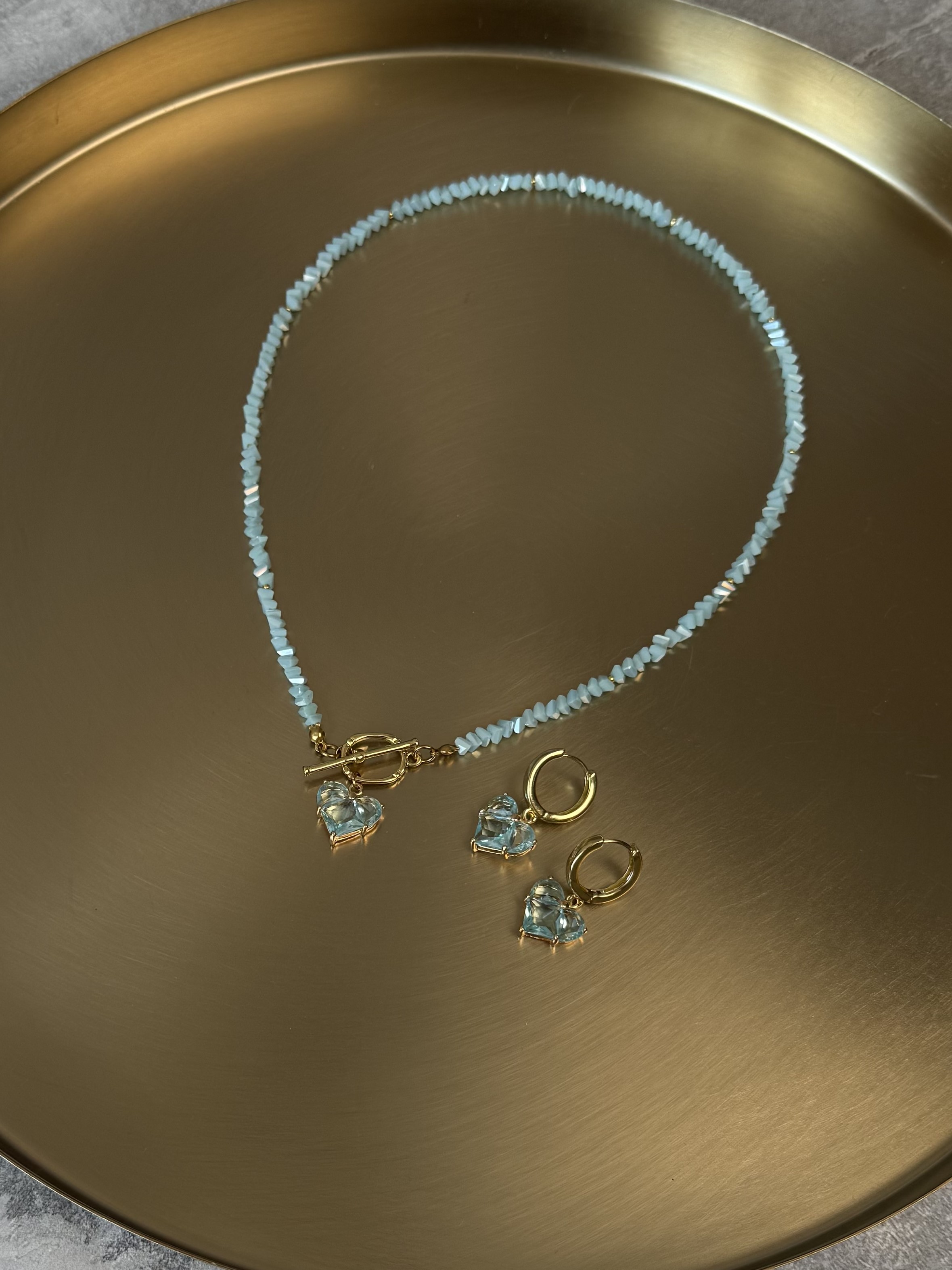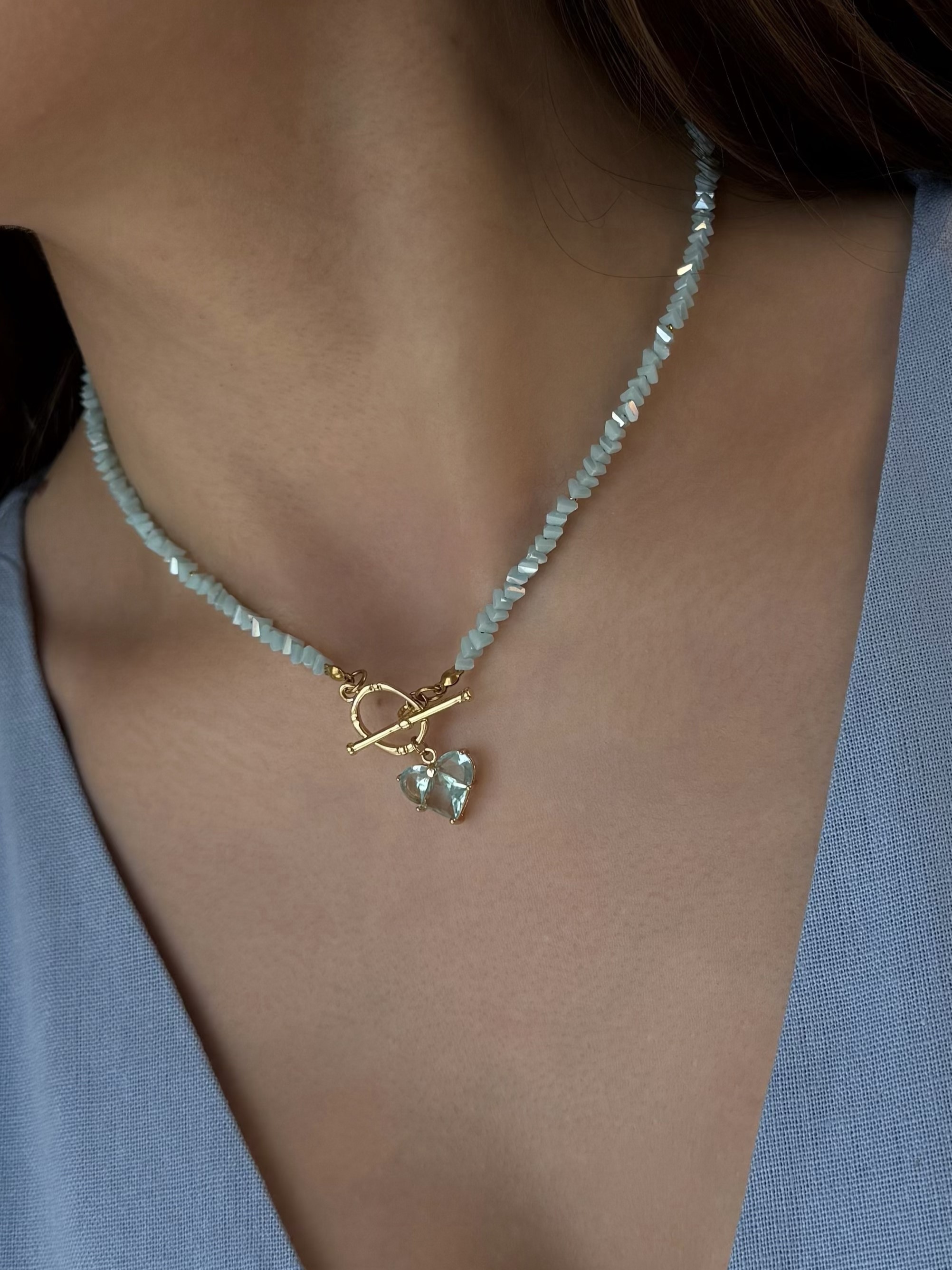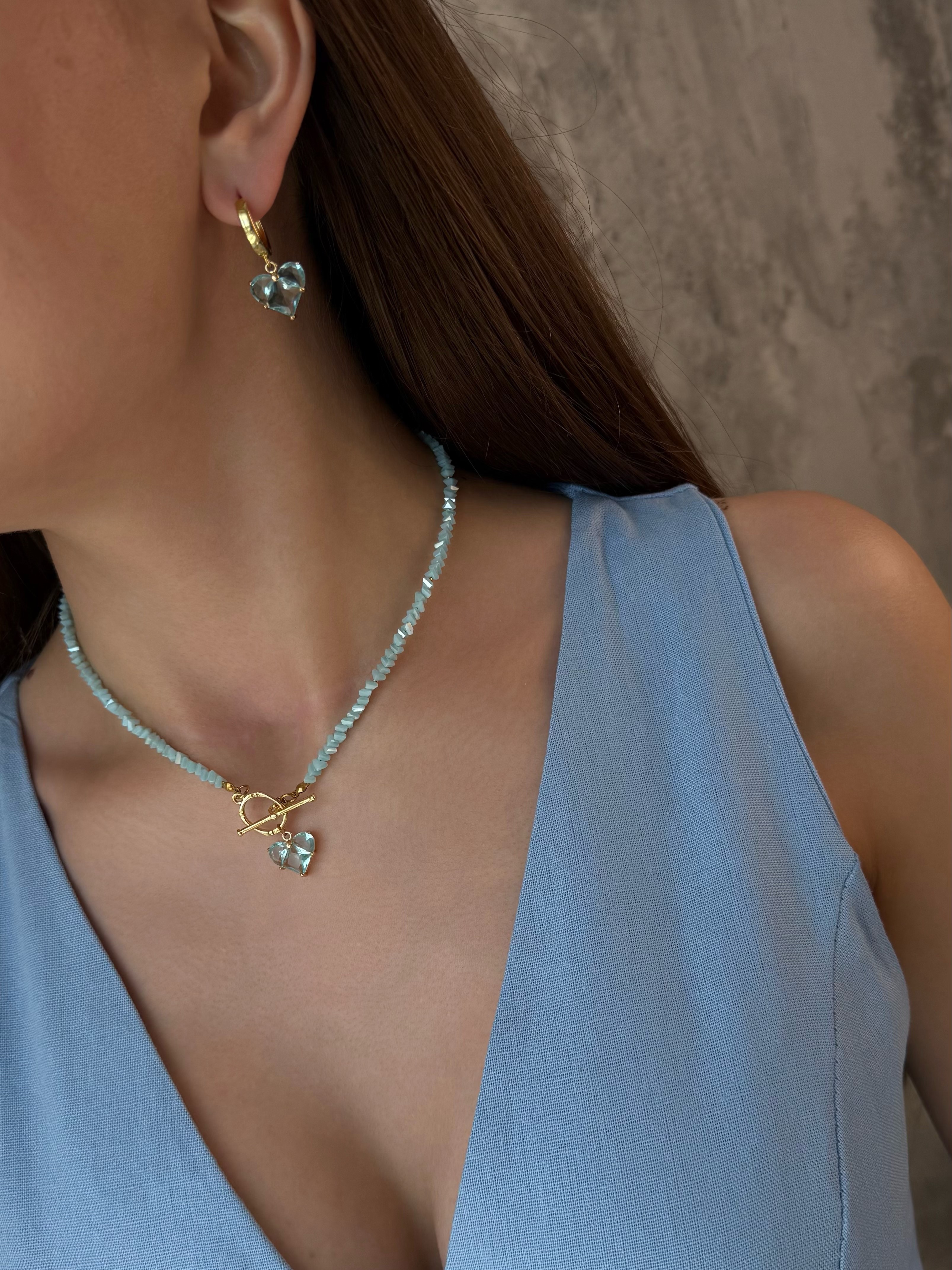 Кольє з відбірного блакитного кришталю з серцем. Матеріал фурнітури: латунь з покриттям позолоти (у золотому кольорі). Стандартна довжина 43 см. Замір шиї моделі впритул 29 см.