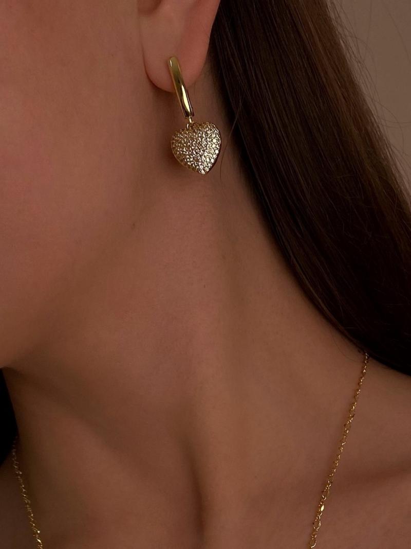 Вишукані сережки із серцями повністю вкритими фіанітами. Основа англійська застібка. Матеріал латунь з покриттям позолоти 18 карат (у золотому кольорі).
