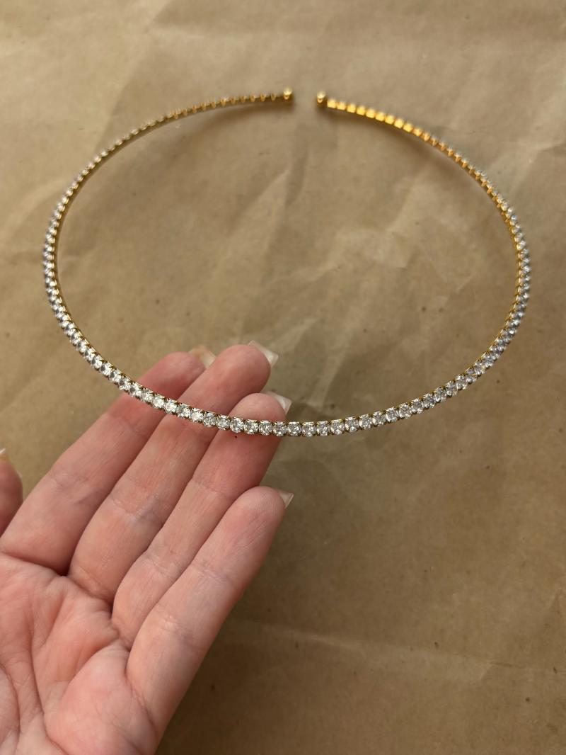 Тверда основа чокер з фіанітами. Матеріал фурнітури ювелірна нержавіюча сталь (у золотому кольорі). Стандартна довжина 36 см без застібки. Замір шиї моделі впритул 29 см.