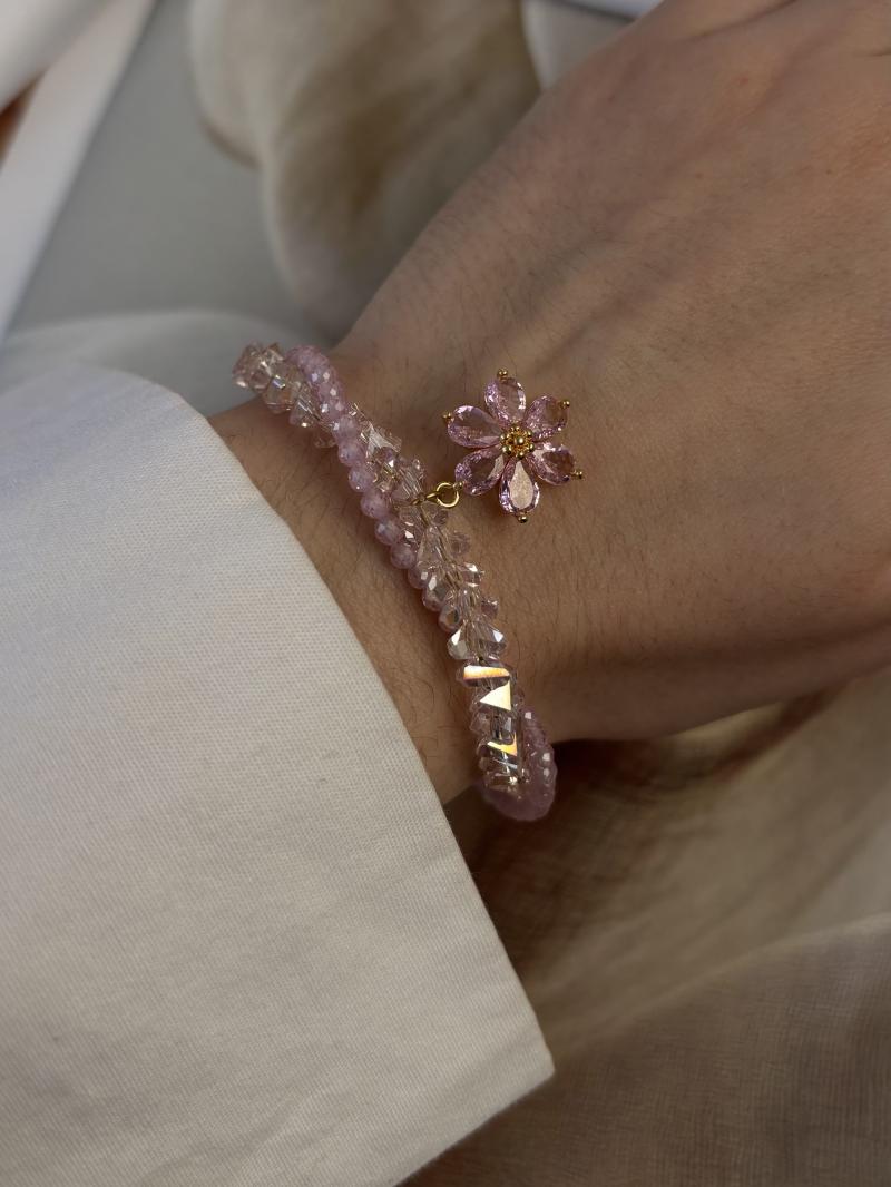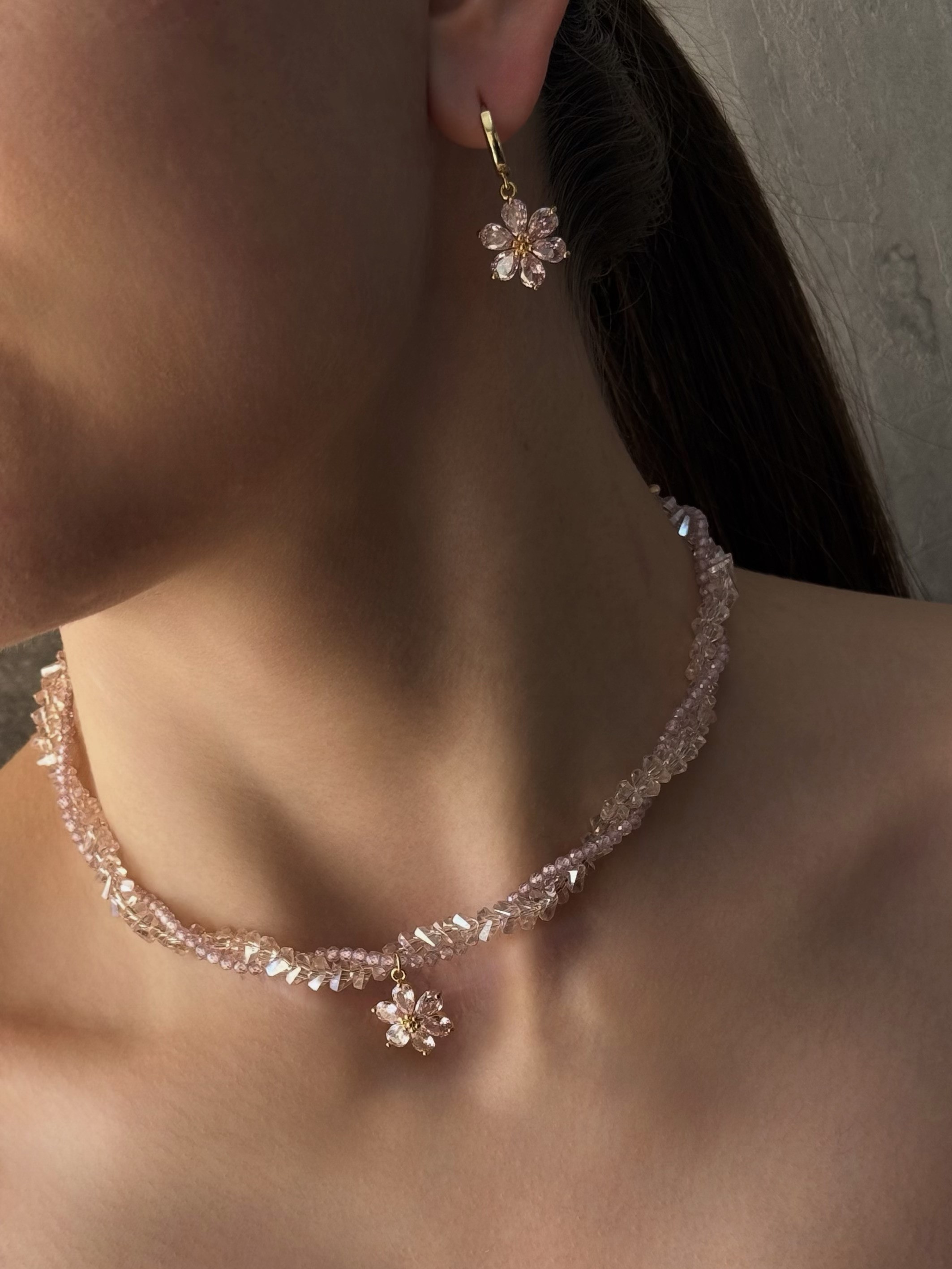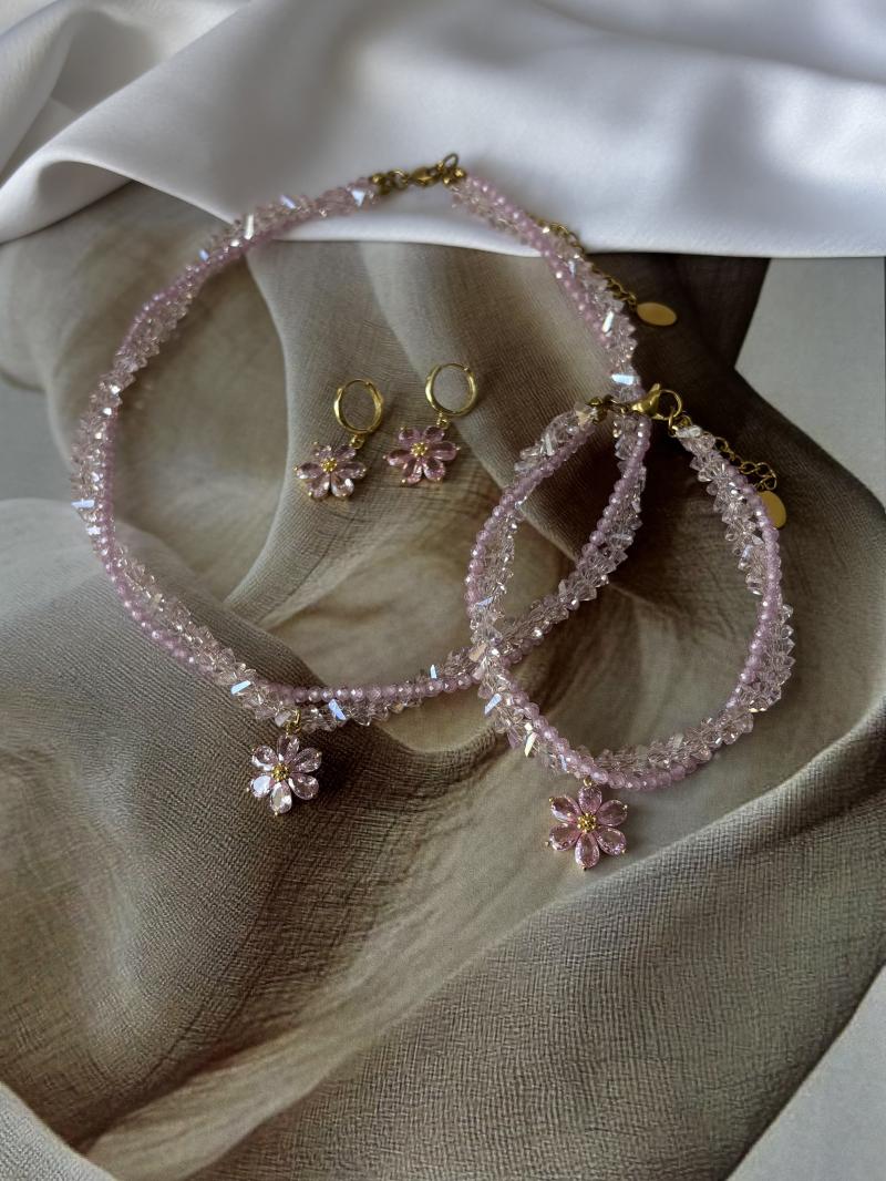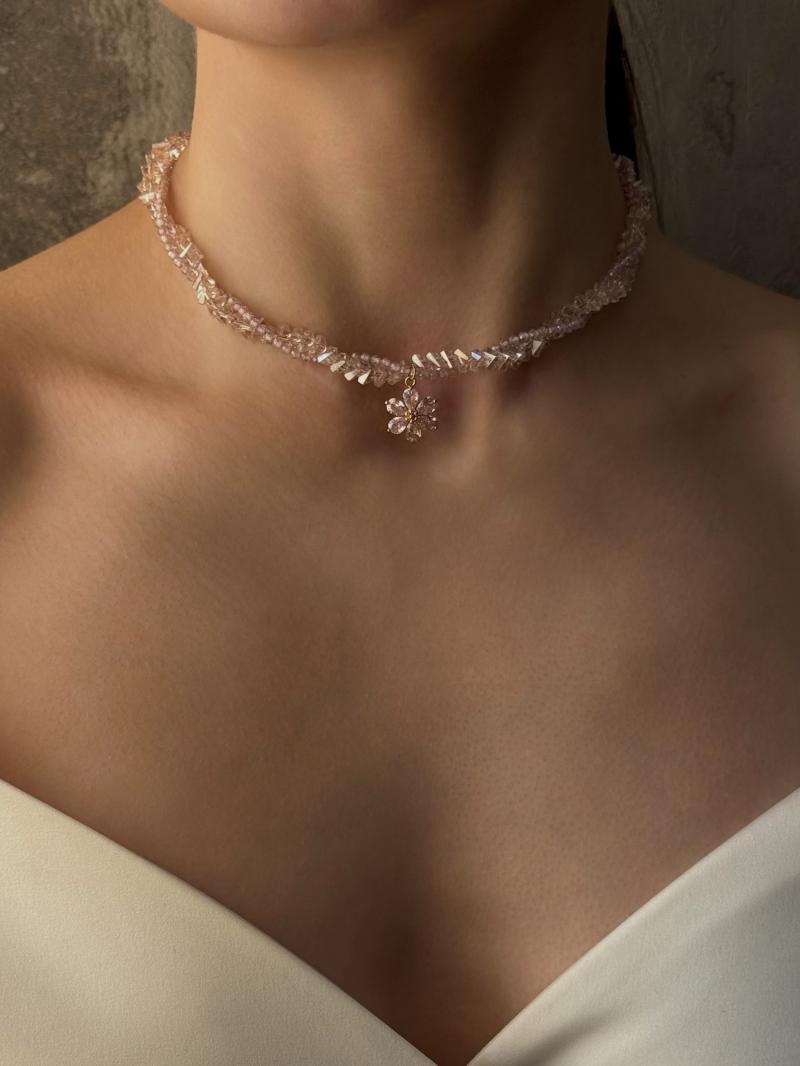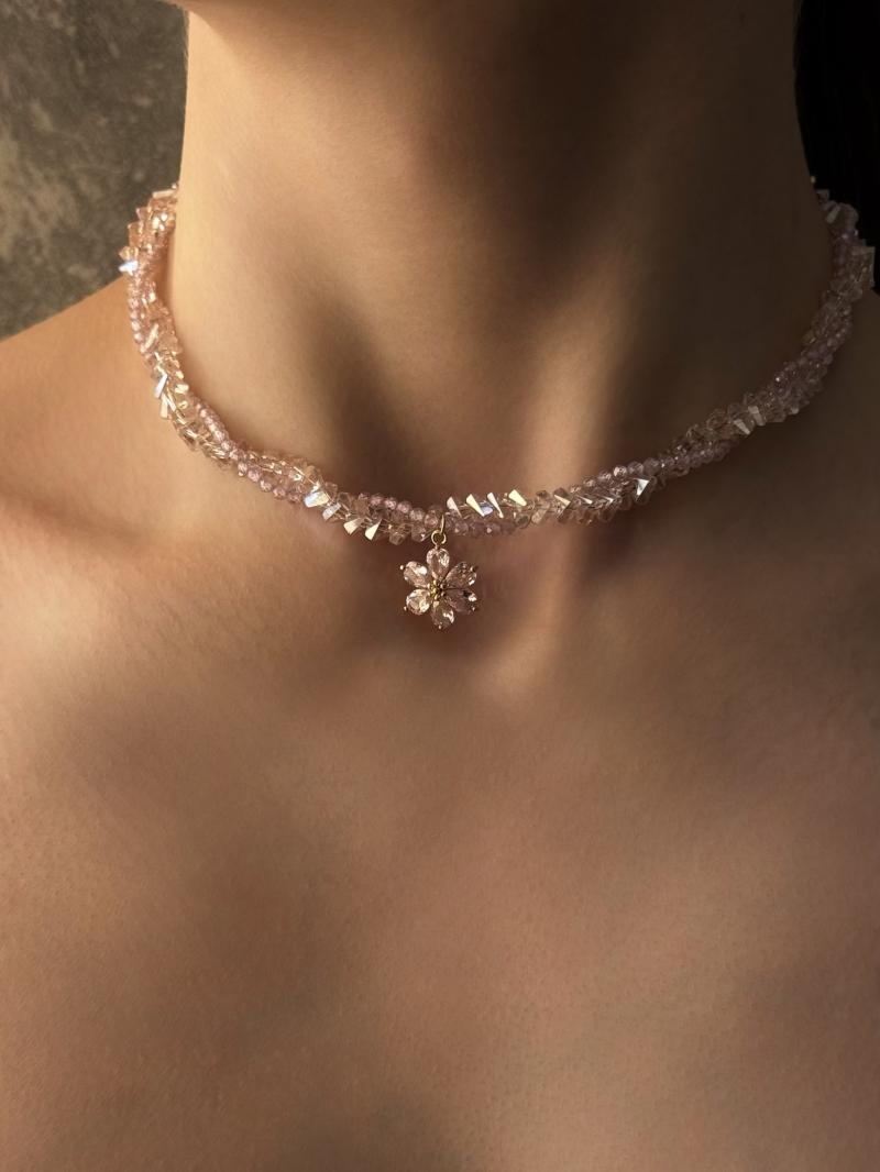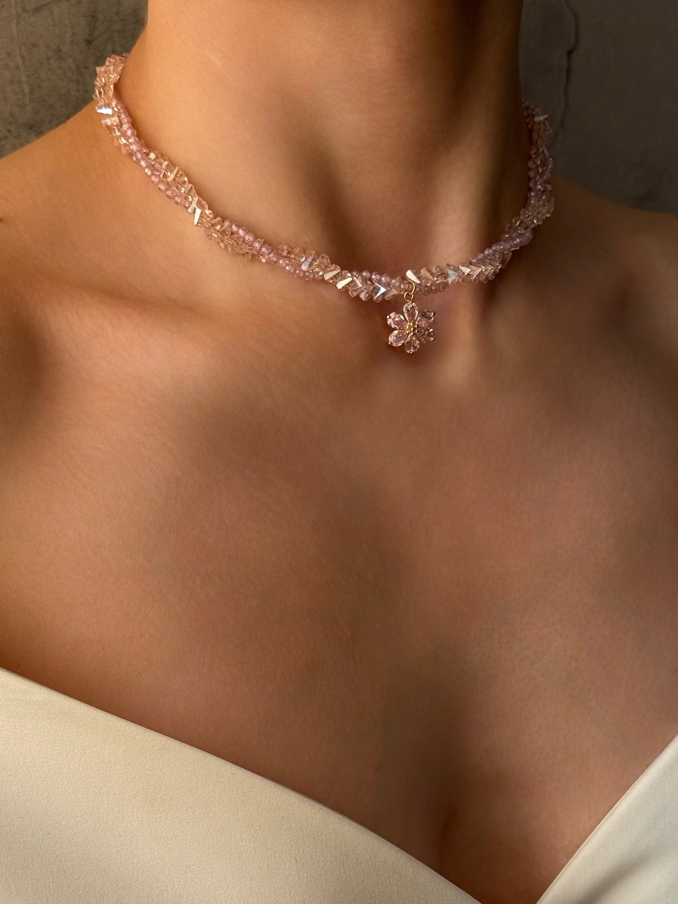 Кольє з відбірного рожевого кришталю, з додаванням квітки. Матеріал фурнітури: ювелірна сталь з позолотою (у золотому кольорі) Стандартна довжина 37 см та 6 см подовжувач.
