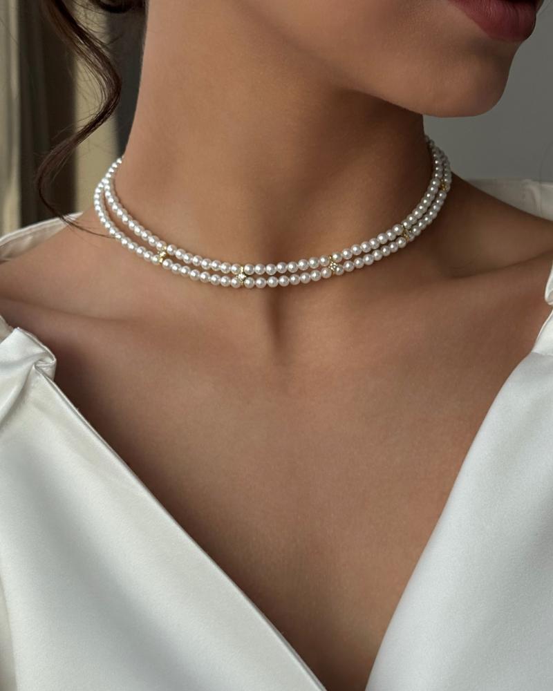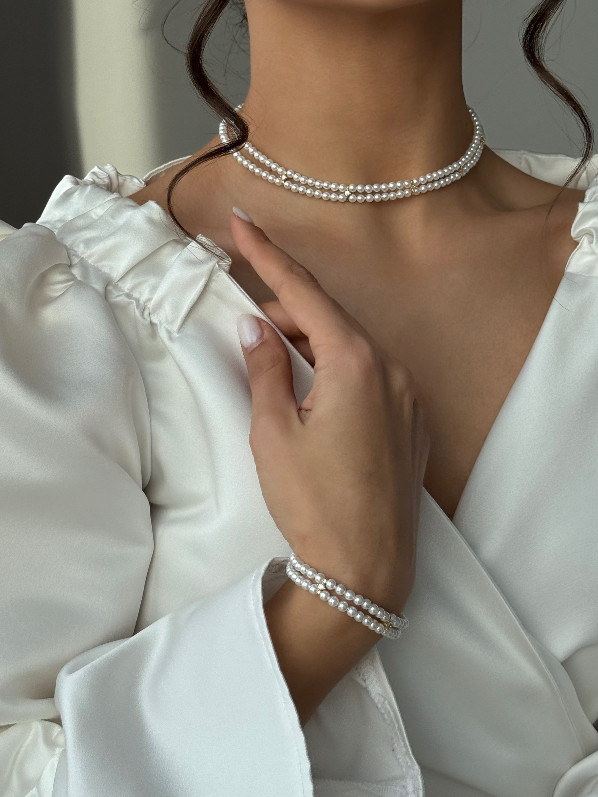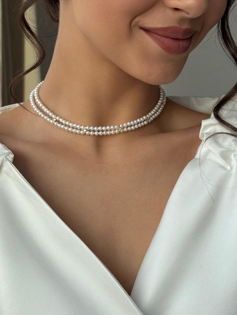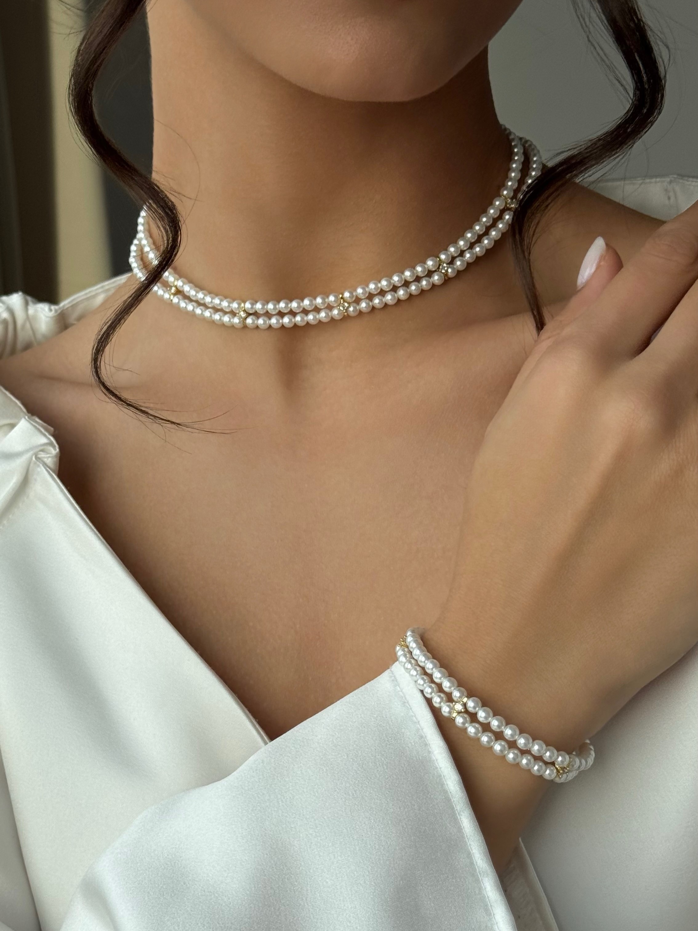 Подвійне кольє з перлин Майорка з додаванням роздільників. Фурнітура нержавіюча ювелірна сталь з позолотою (у золотому кольорі). Стандартна довжина 37 см та 6 см подовжувач. Замір шиї моделі впритул 29 см.