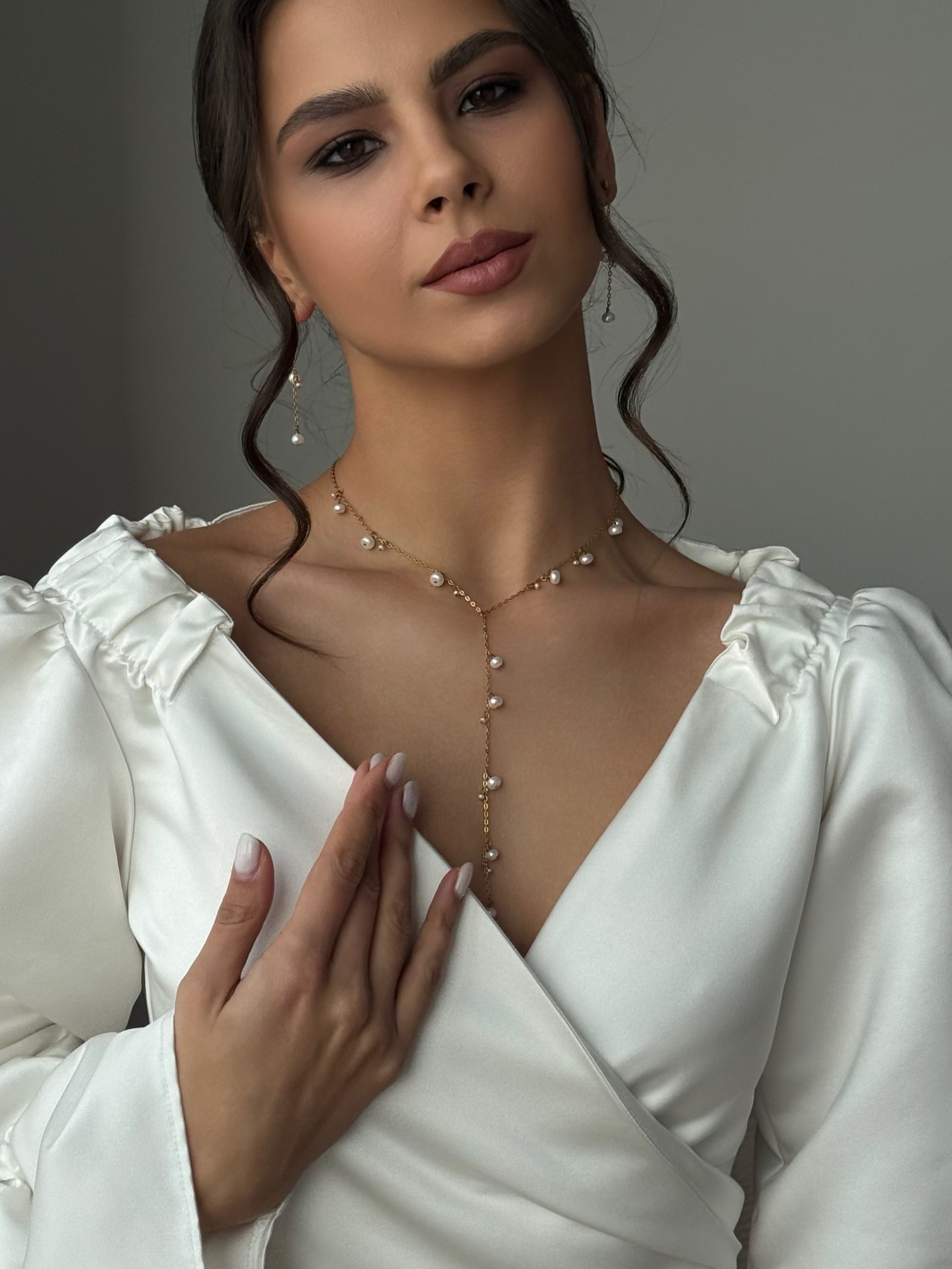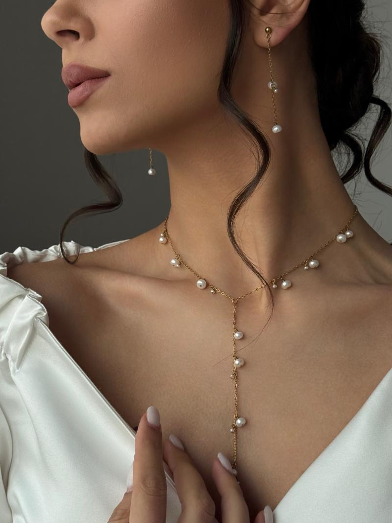 Ніжний ланцюжок з додаванням натуральних перлин. Матеріал ювелірна нержавіюча сталь з позолотою (у золотому кольорі). Стандартна довжина навколо шиї 36 см та 6 см подовжувач. Замір шиї моделі - 30 см впритул.