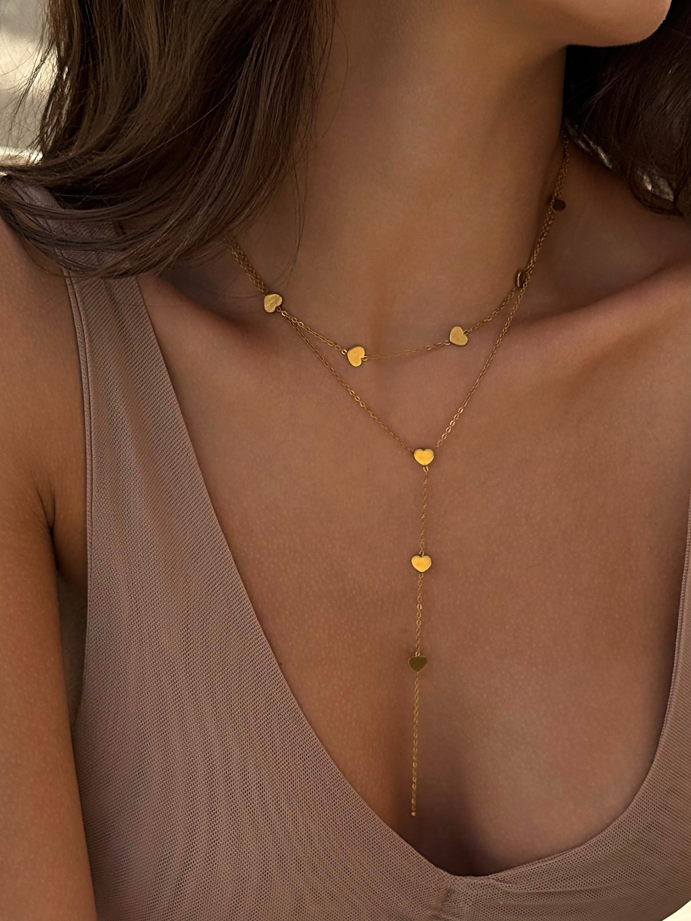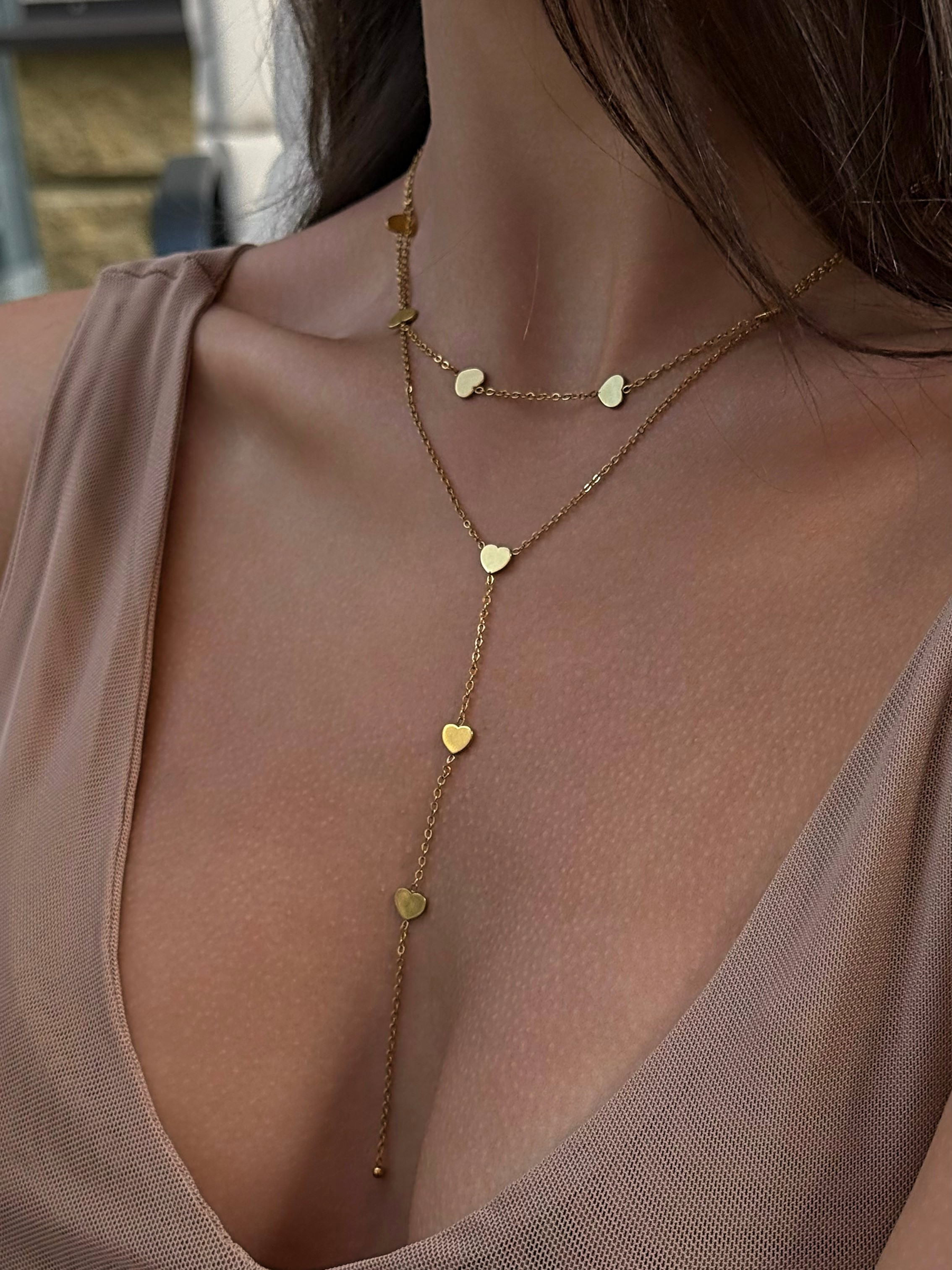 Стильний подвійний ланцюжок з серцями з імітацією краватки. Матеріал нержавіюча ювелірна сталь. Стандартна довжина навколо шиї 37см + 6 см подовжувач.