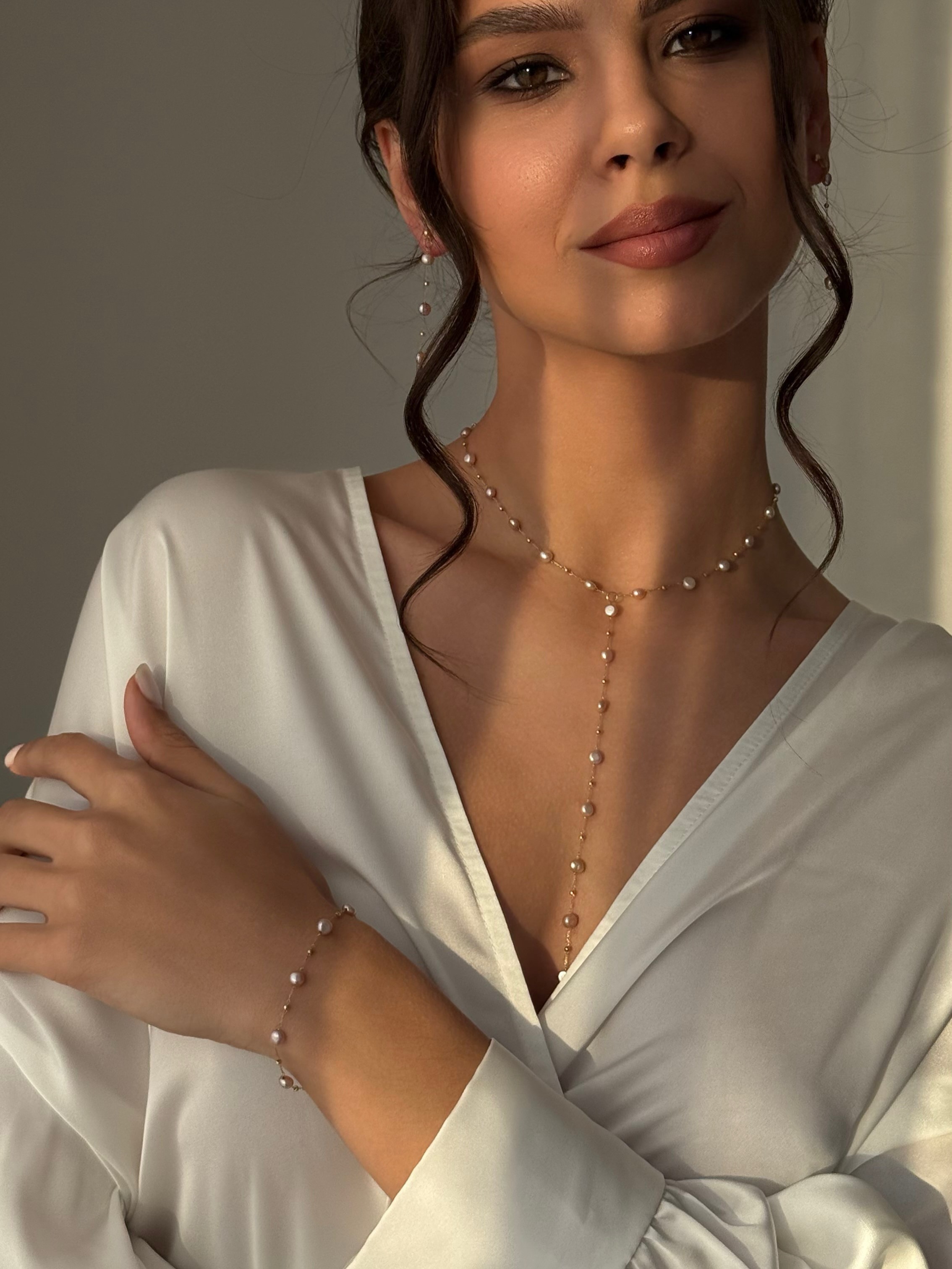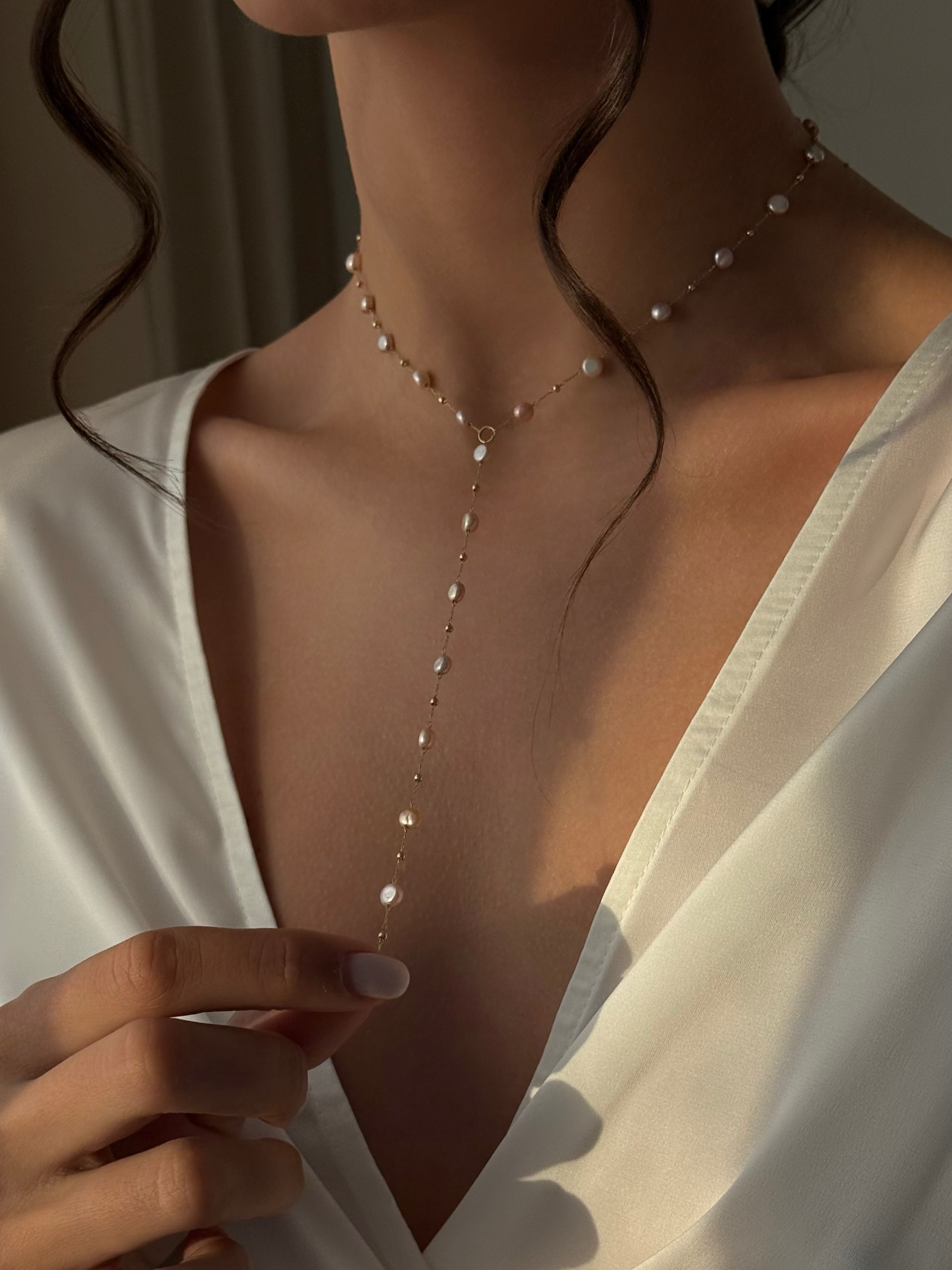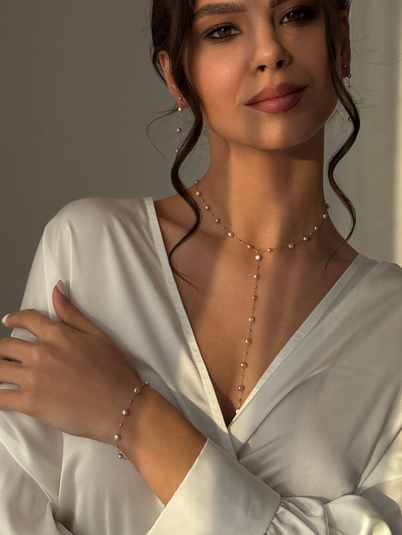 Вишуканий ланцюжок з додаванням натуральних перлин. Матеріал латунь з покриттям позолоти 18 карат (у золотому кольорі). Замір шиї моделі 29 см в притул. Стандартна довжина навколо шиї 36 см + 6 см подовжувач. Довжина звисаючої частини 14,5 см.